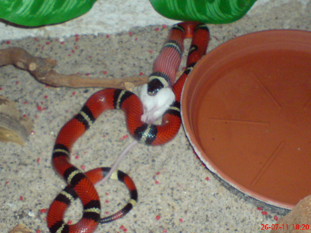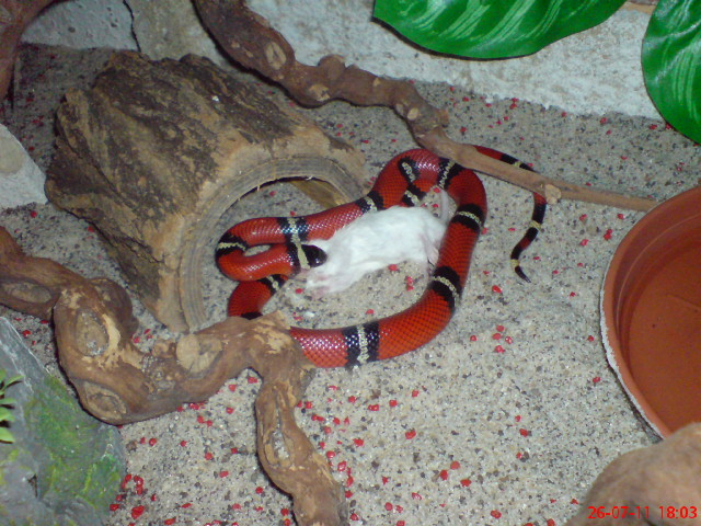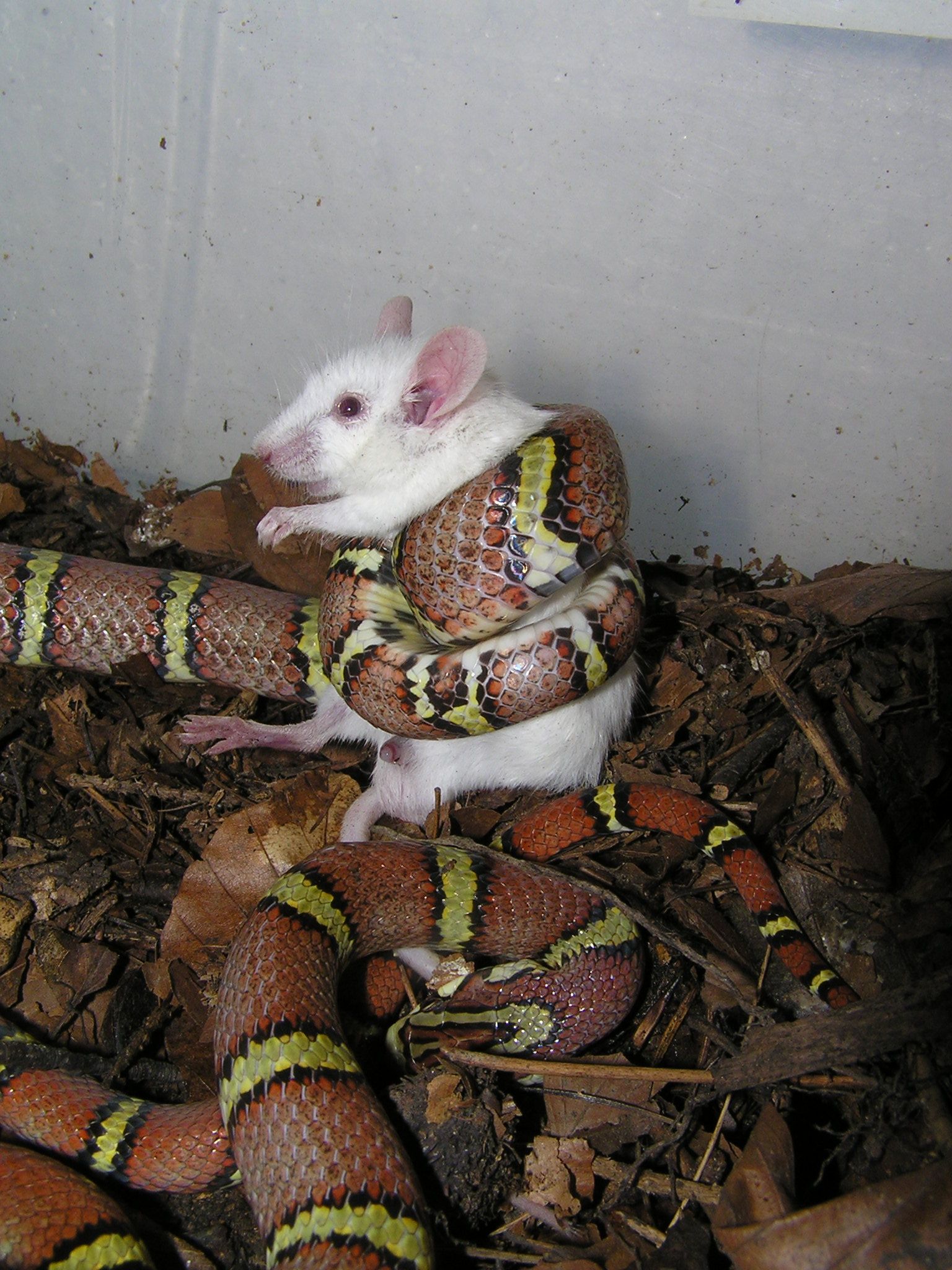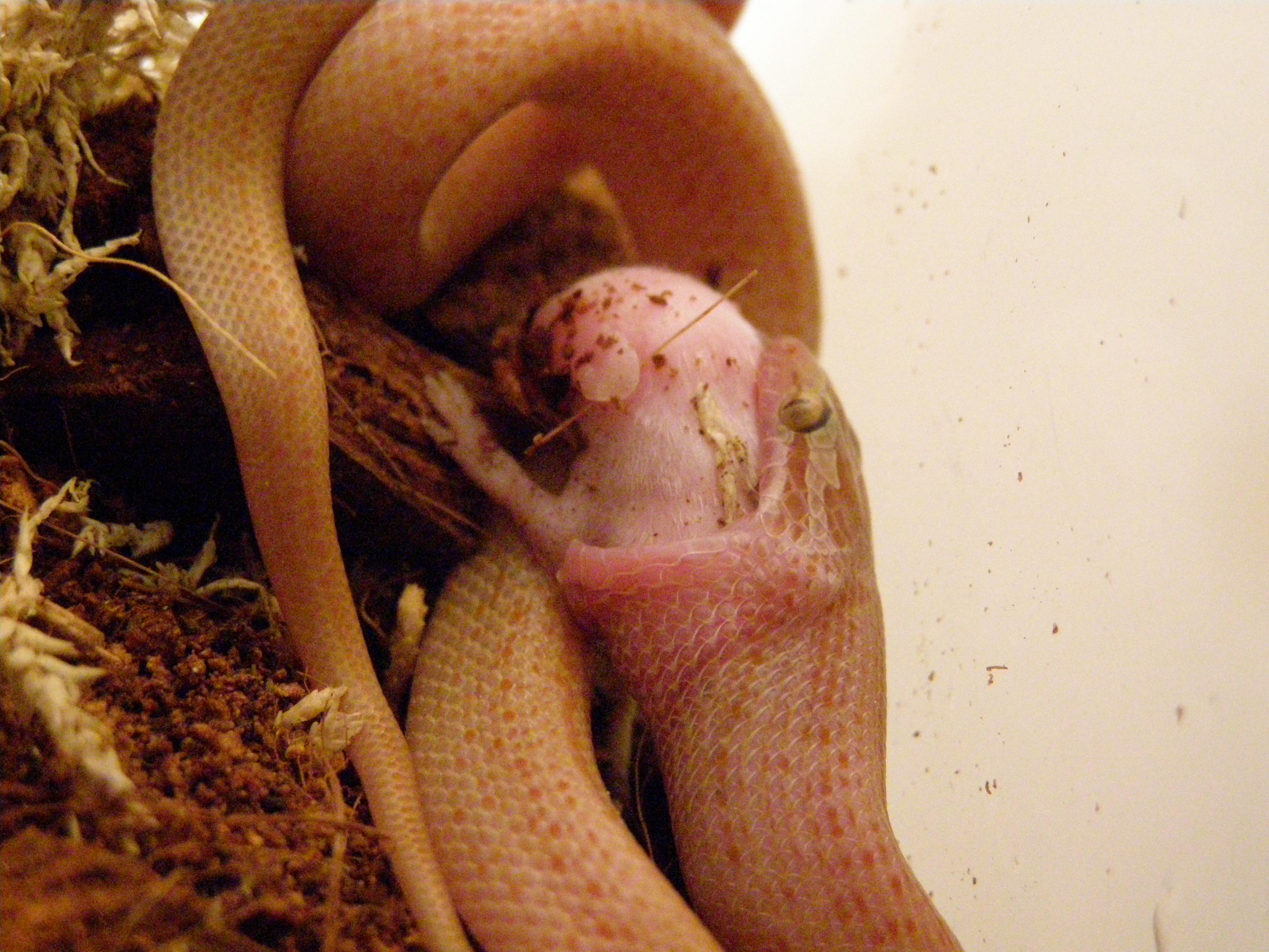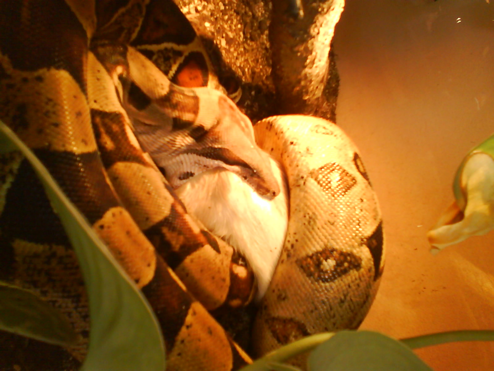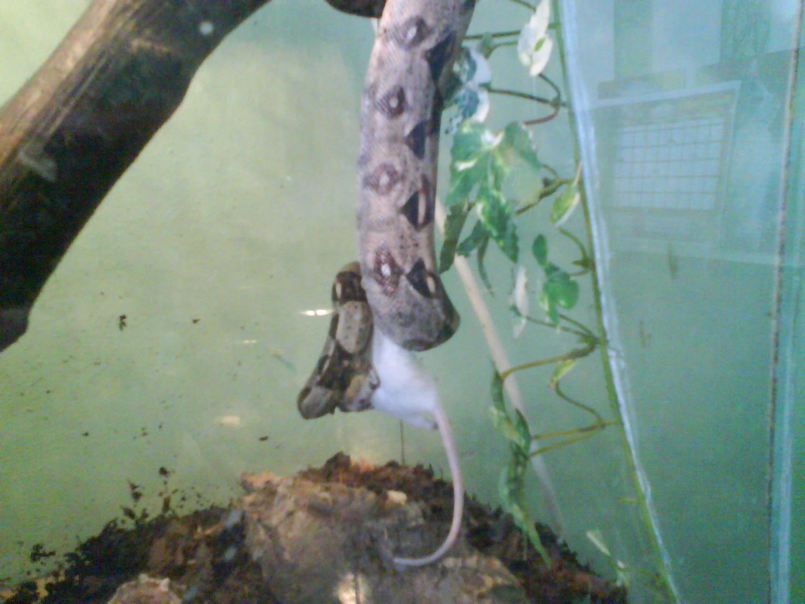 Eunectes murinus a myš-dostala dvě.Třeba oproti tmavce co mám a nebo hroznovi je vidět úplně jiný způsob škrcení kořisti-kořist ovine smyčkama co jen to jde.Tmavka ovine cca 75% kořisti kdežto murinuska to bere kompleta co jen to jde.Zatím je to můj názor krmil jsem teprv jednou-dvě myši.Teďka další krmení přecházím na potkany.
