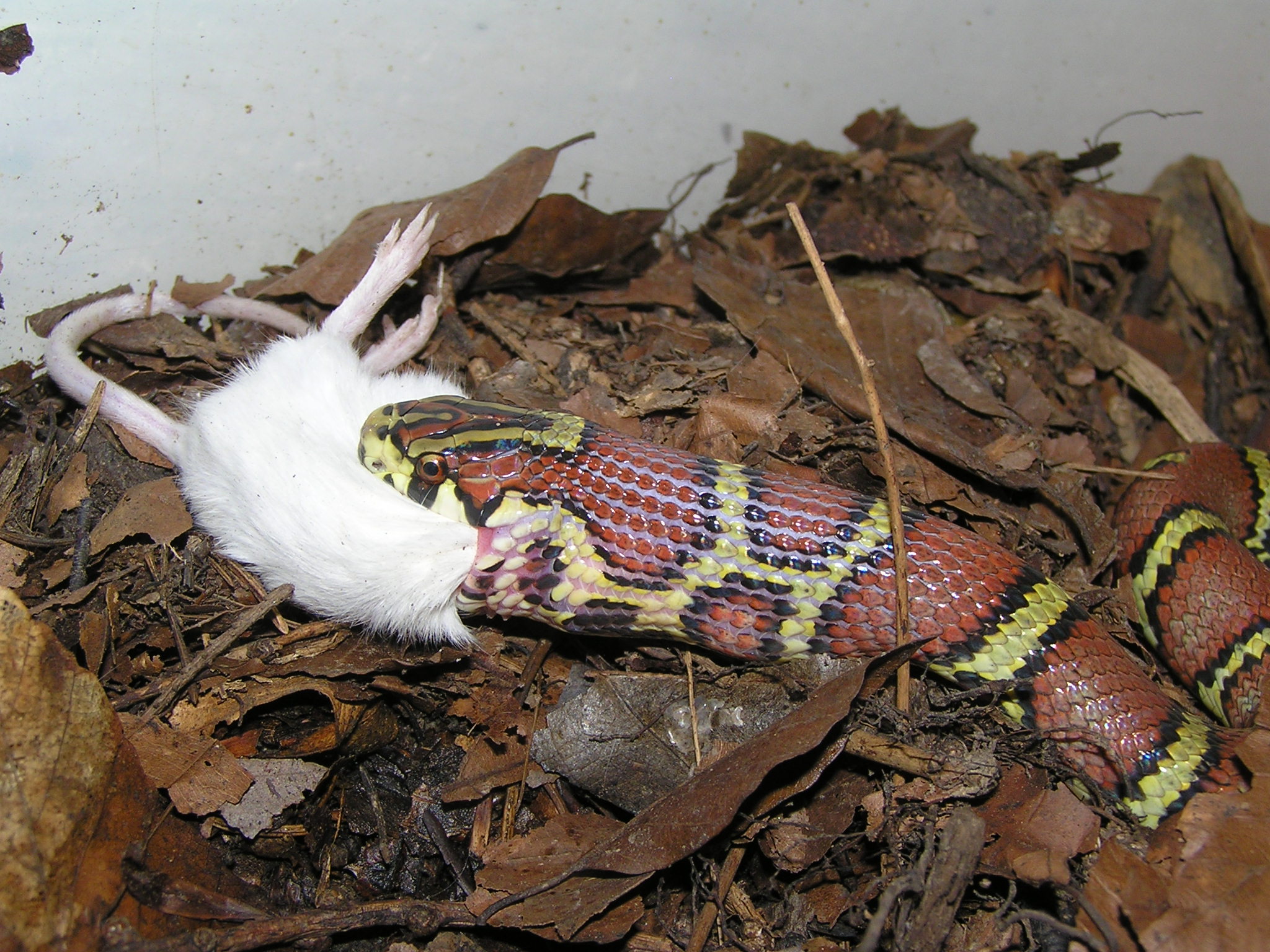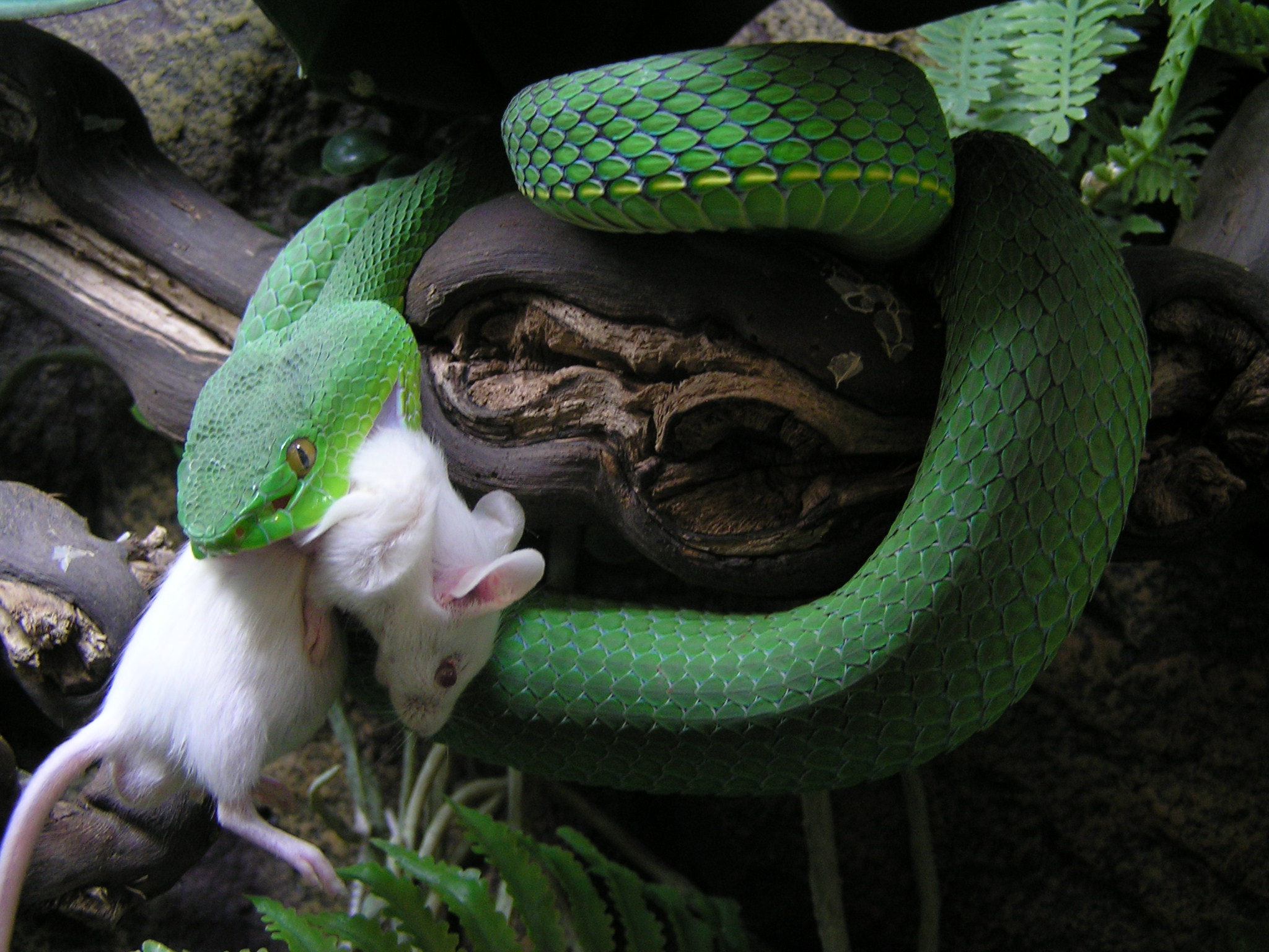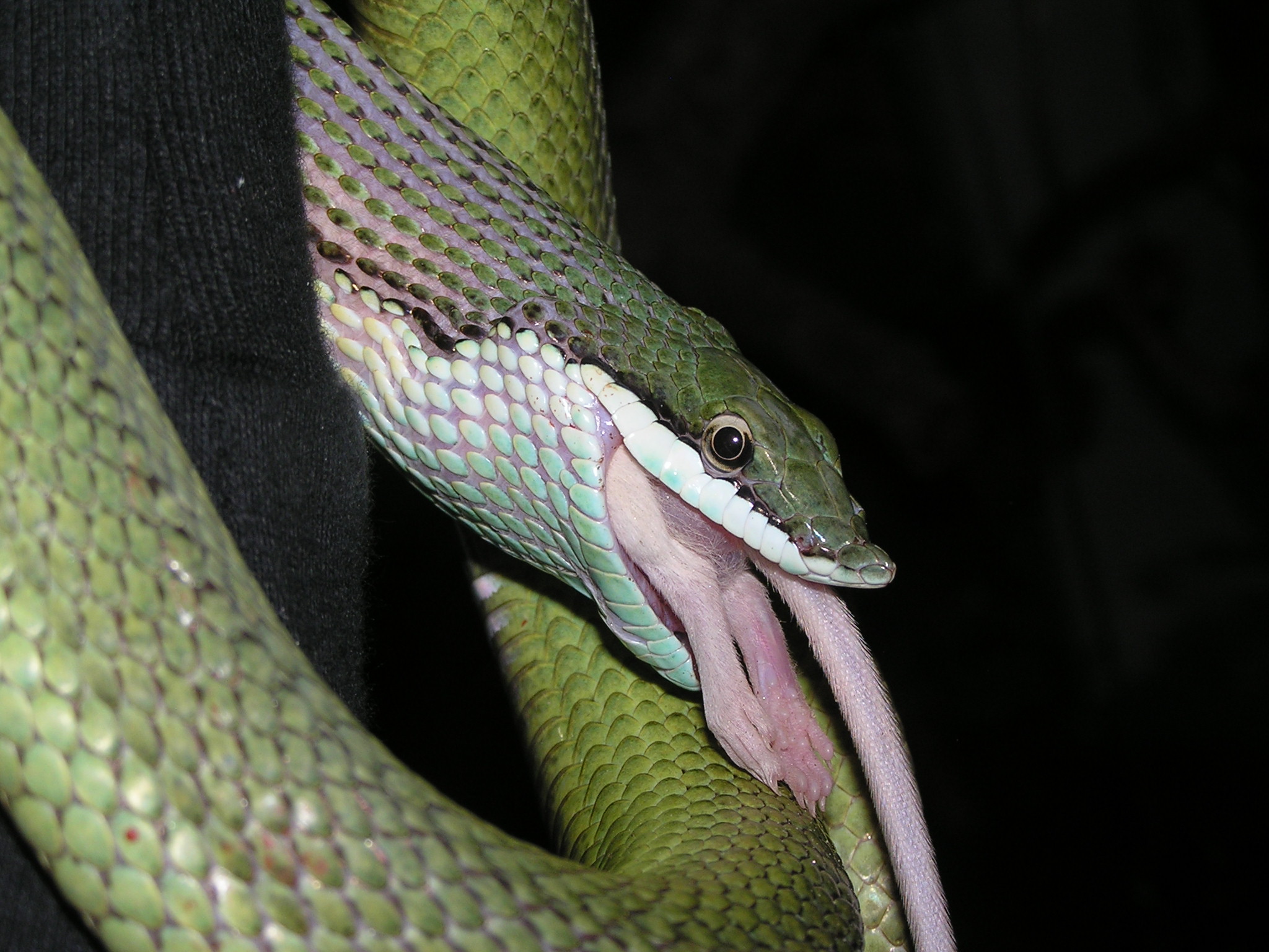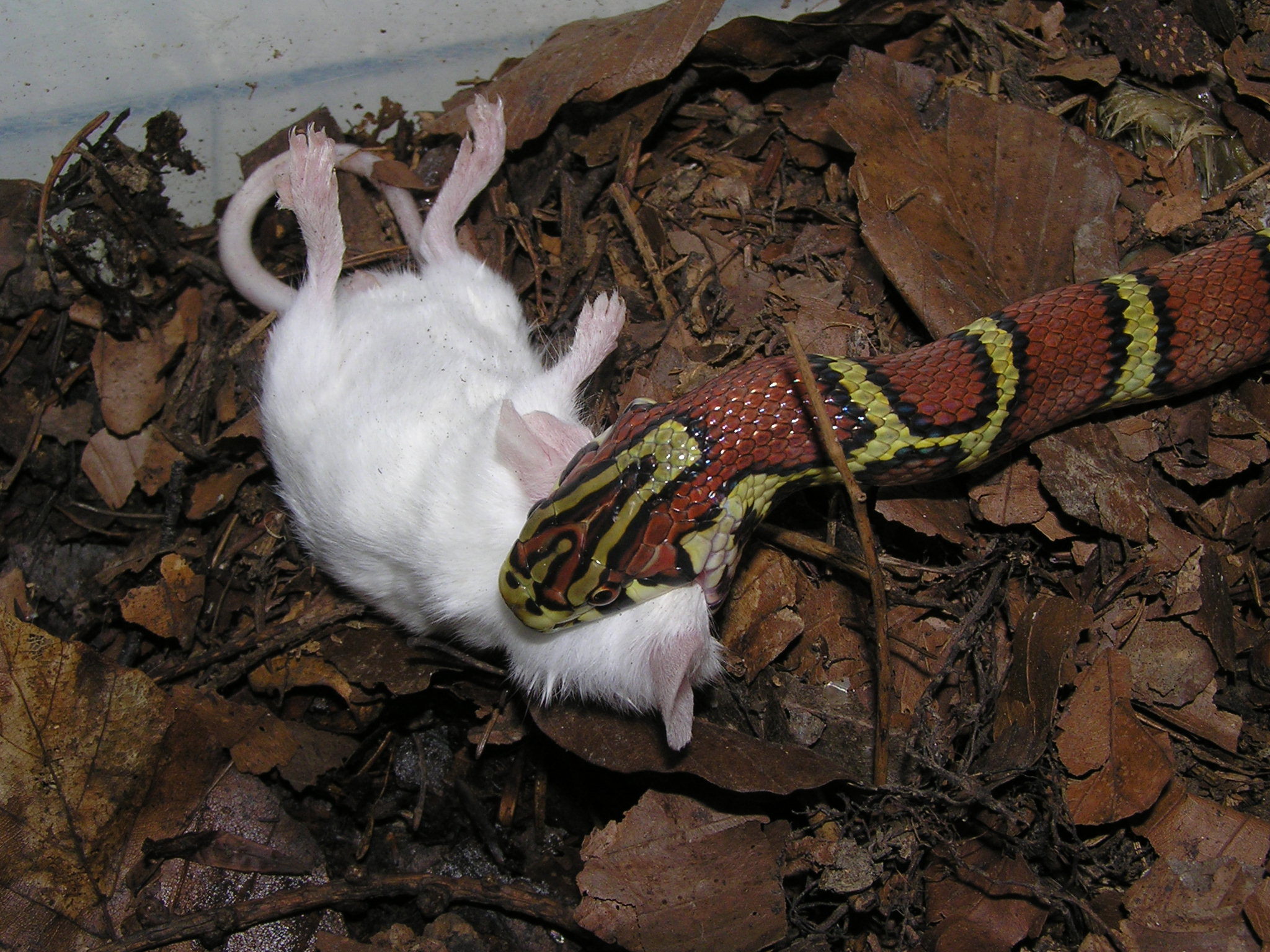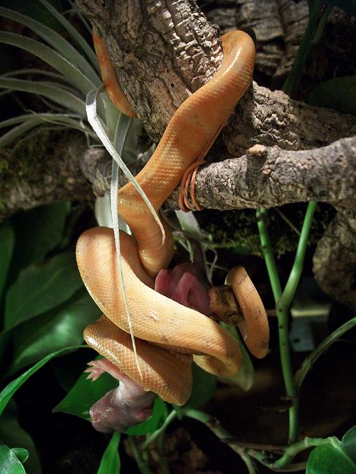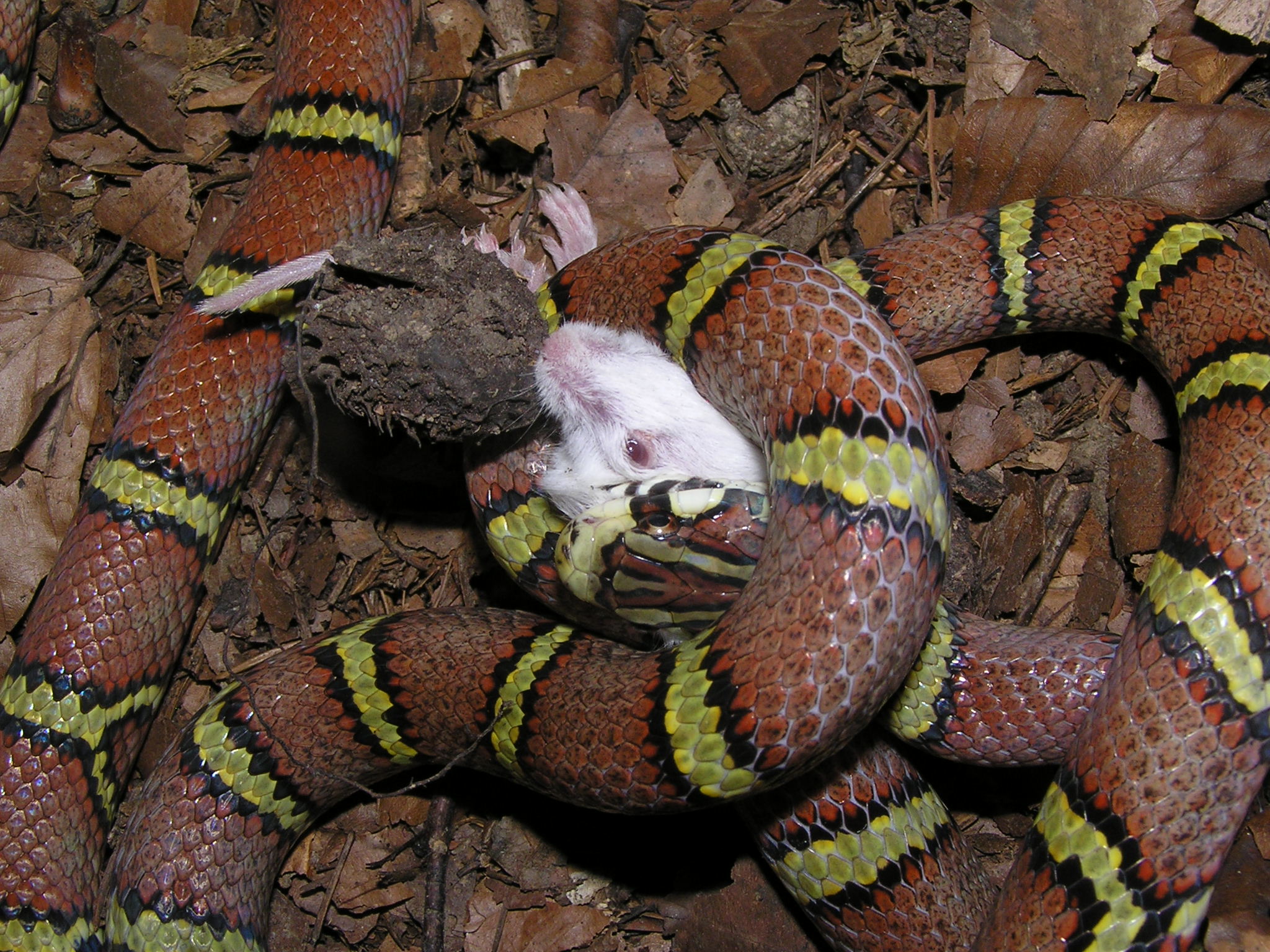 Eunectes murinus a myš-dostala dvě.Třeba oproti tmavce co mám a nebo hroznovi je vidět úplně jiný způsob škrcení kořisti-kořist ovine smyčkama co jen to jde.Tmavka ovine cca 75% kořisti kdežto murinuska to bere kompleta co jen to jde.Zatím je to můj názor krmil jsem teprv jednou-dvě myši.Teďka další krmení přecházím na potkany.