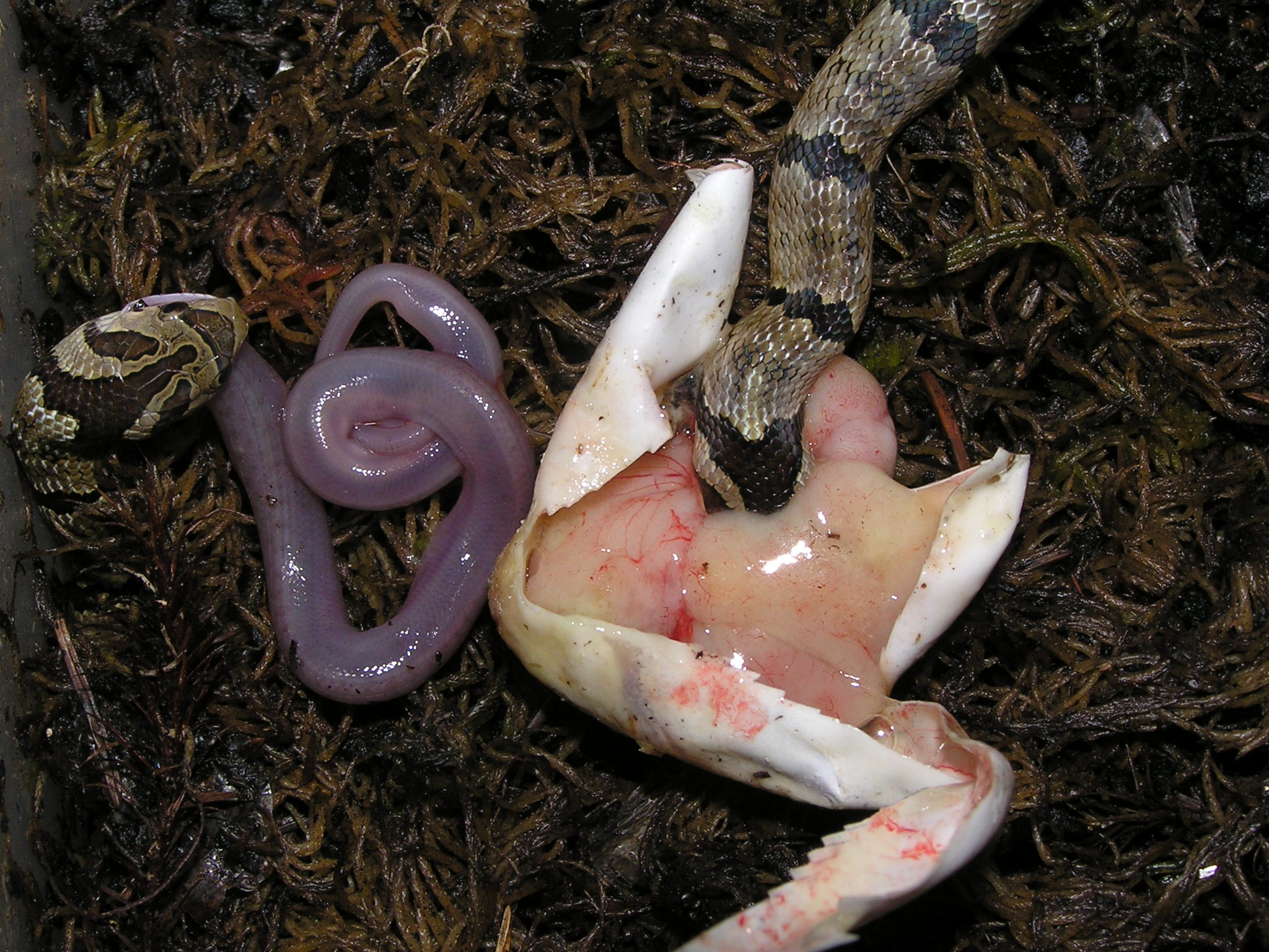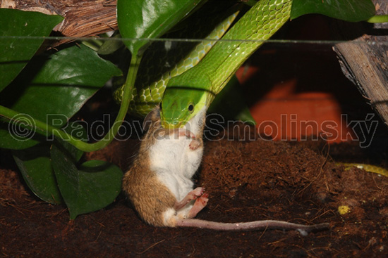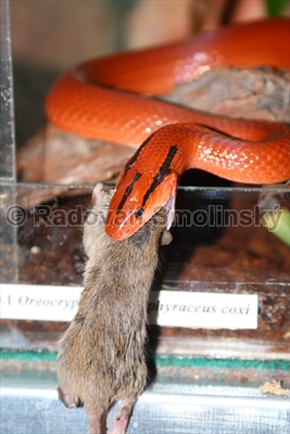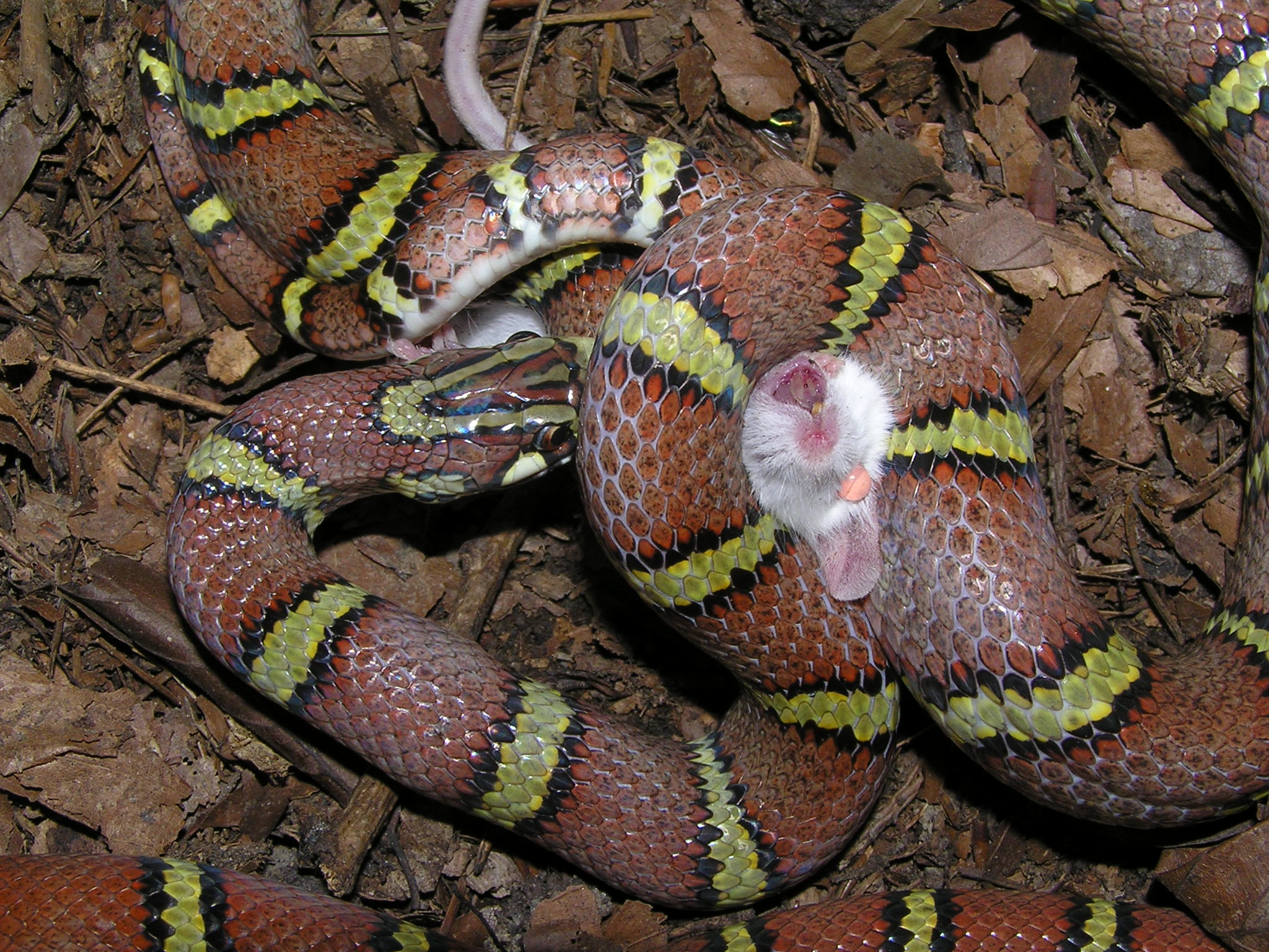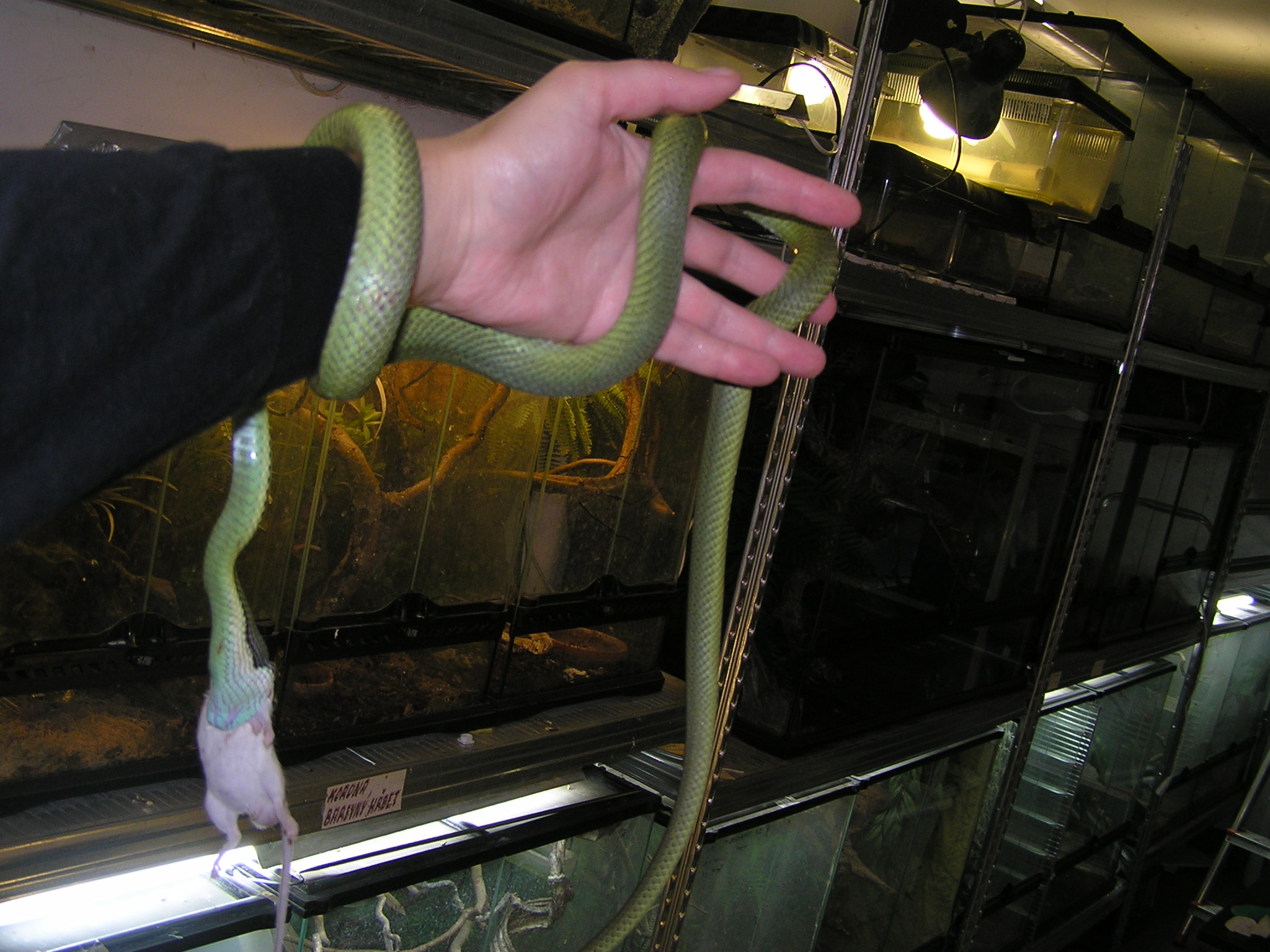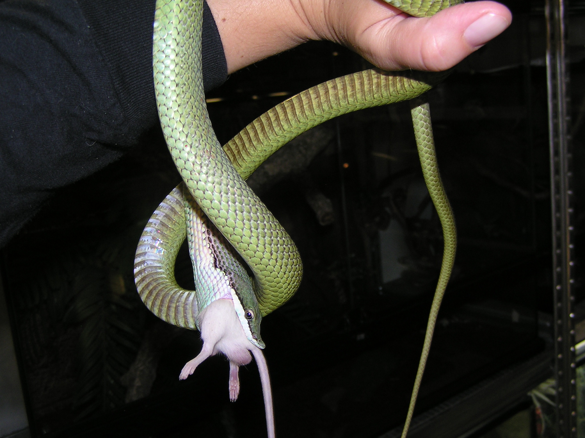 Eunectes murinus a myš-dostala dvě.Třeba oproti tmavce co mám a nebo hroznovi je vidět úplně jiný způsob škrcení kořisti-kořist ovine smyčkama co jen to jde.Tmavka ovine cca 75% kořisti kdežto murinuska to bere kompleta co jen to jde.Zatím je to můj názor krmil jsem teprv jednou-dvě myši.Teďka další krmení přecházím na potkany.