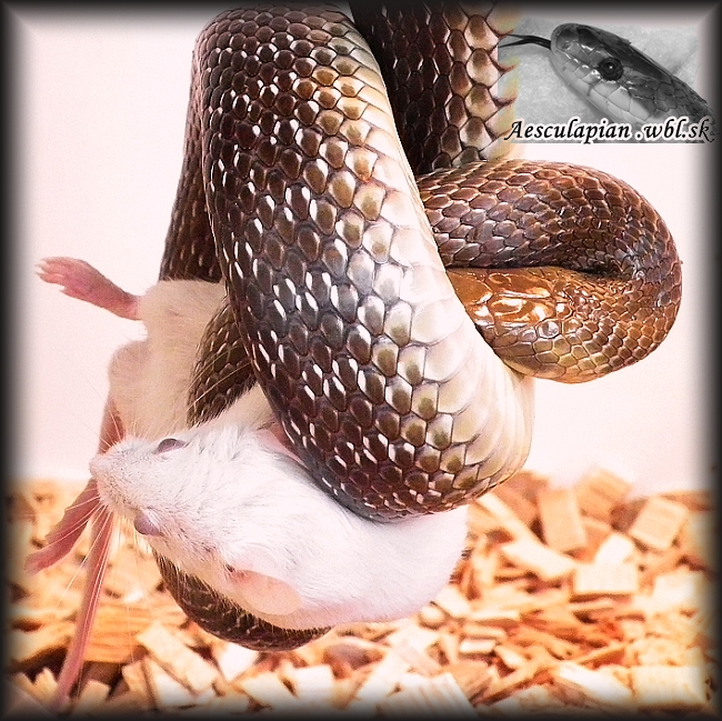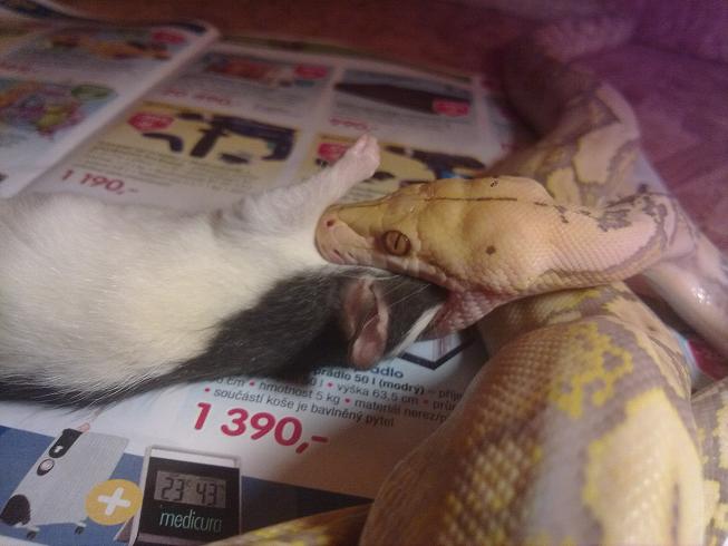 ToPas standartně perfektní fotky. K Aurifer : když skrmujete ruznymi jinymi exoty, všechny si je chovate jen na krmeni (bylo tu že skrmujete i defektni jedince, vajíčka apd., ale třeba ty gekončíky, jiné hady apd.) nebo jdou i na chov a vybirate jake skrmite? Vy toho máte opravdu hodně (respekt), to je spousta ruznych druhů, musí to stát spoustu peněz a znalostí (ty máte, to už vím ). Moje otázka: kolik vlastně chováte druhů, jak na chov tak na krmení? A aby to nebylo tolik OT, tak přidam fotku z mého krmení (není nic extra a je z mobilu) Jedná se o samečka Boa Constructior a jednoho potkana.