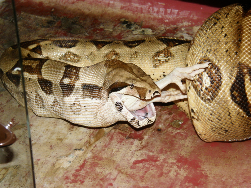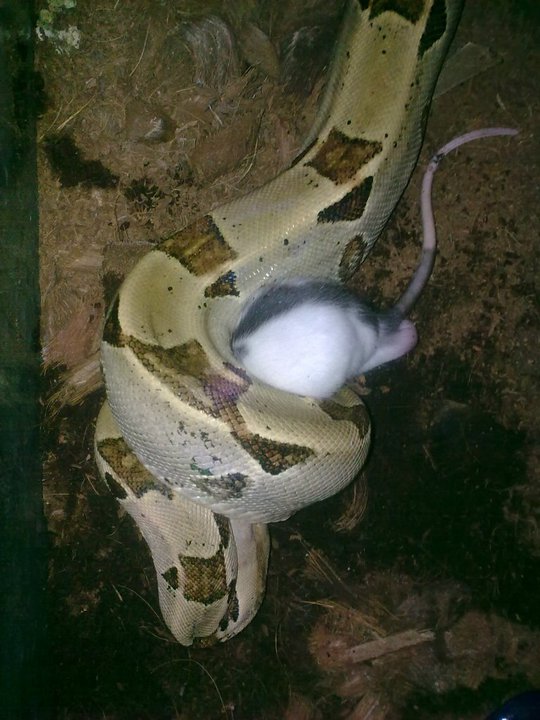 Hroznýš královský..jako mladá jen myšku poslední fotografie o pár měsíců starší..pochutnává si na velkým potkanovi.