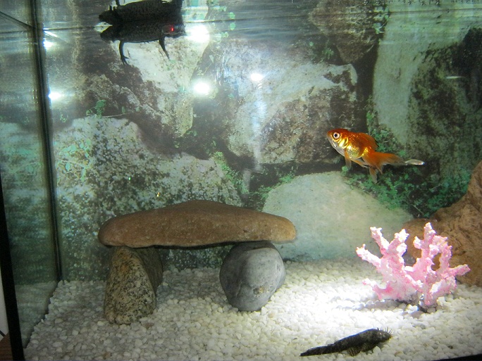 takže: 1.komplet předělej akvárko, dej tam jiný substrát, nejlíp praný křemičitý říční písek nebo akvarijní kamínky (kačírek), musí být tmavý, v žádném případě ne bílý. Žádná štěrková nebo mramorová drť ani podobné nesmysly, prostě akvarijní písek. můžeš dát i nějaké kytky, třeba trsy Microsoria