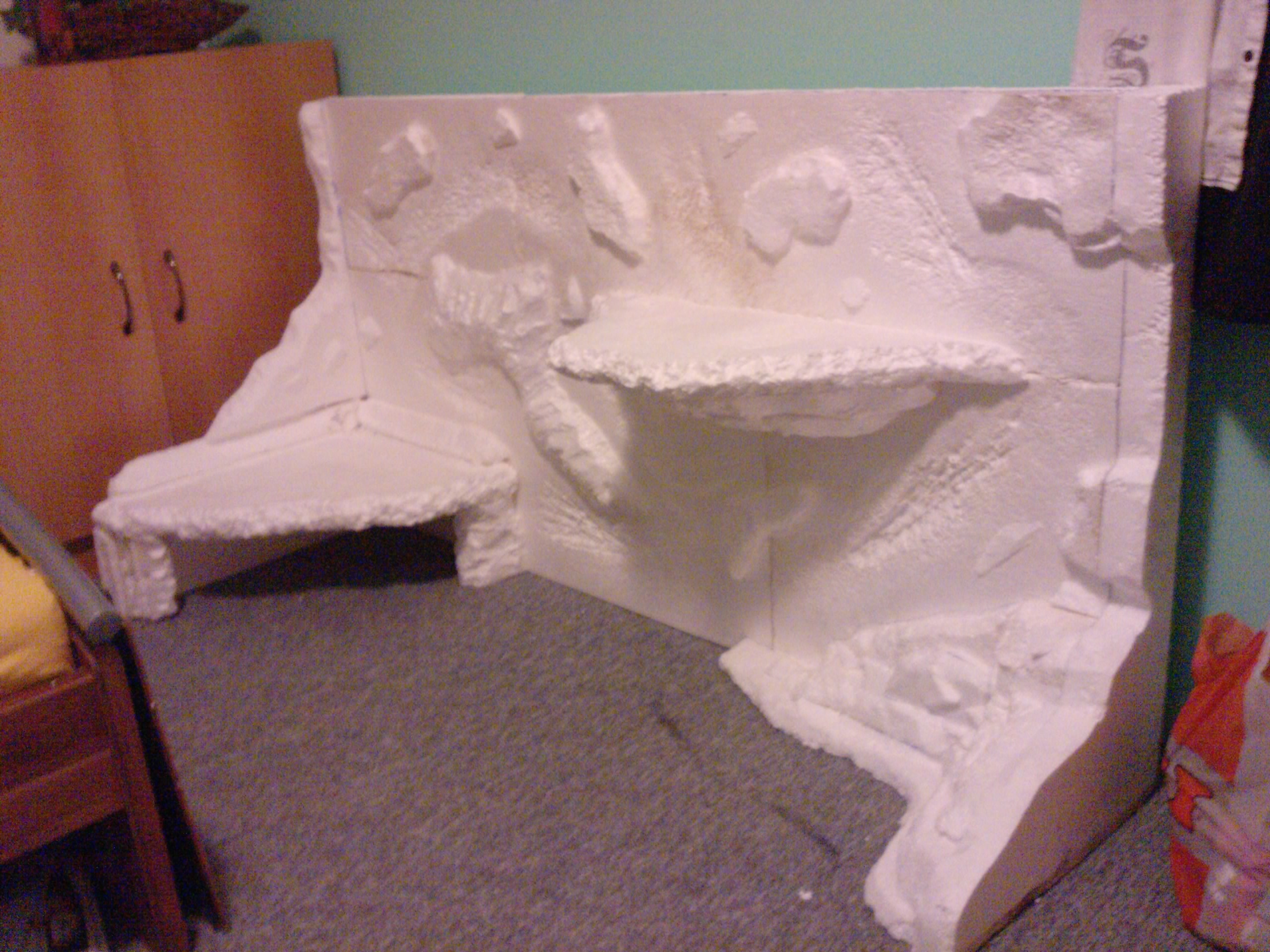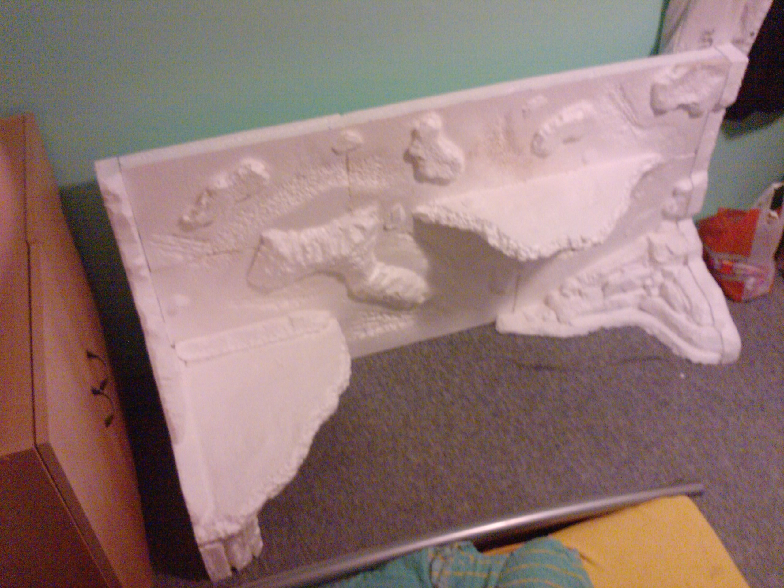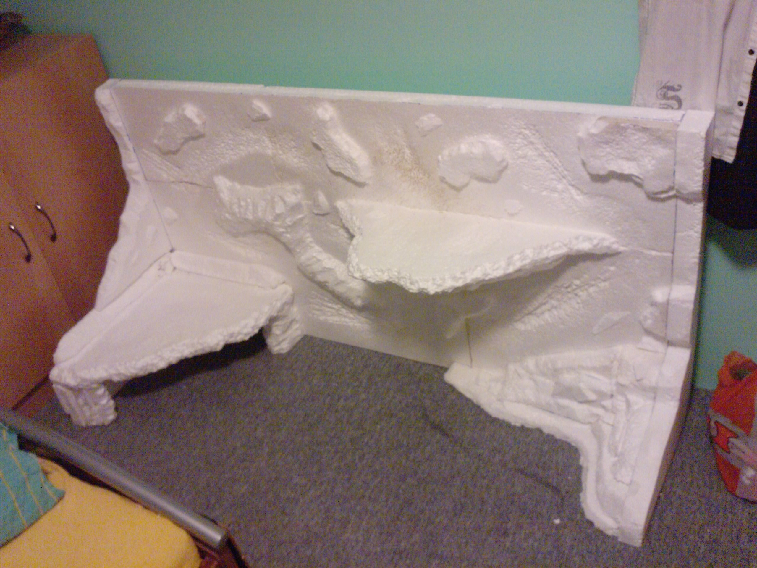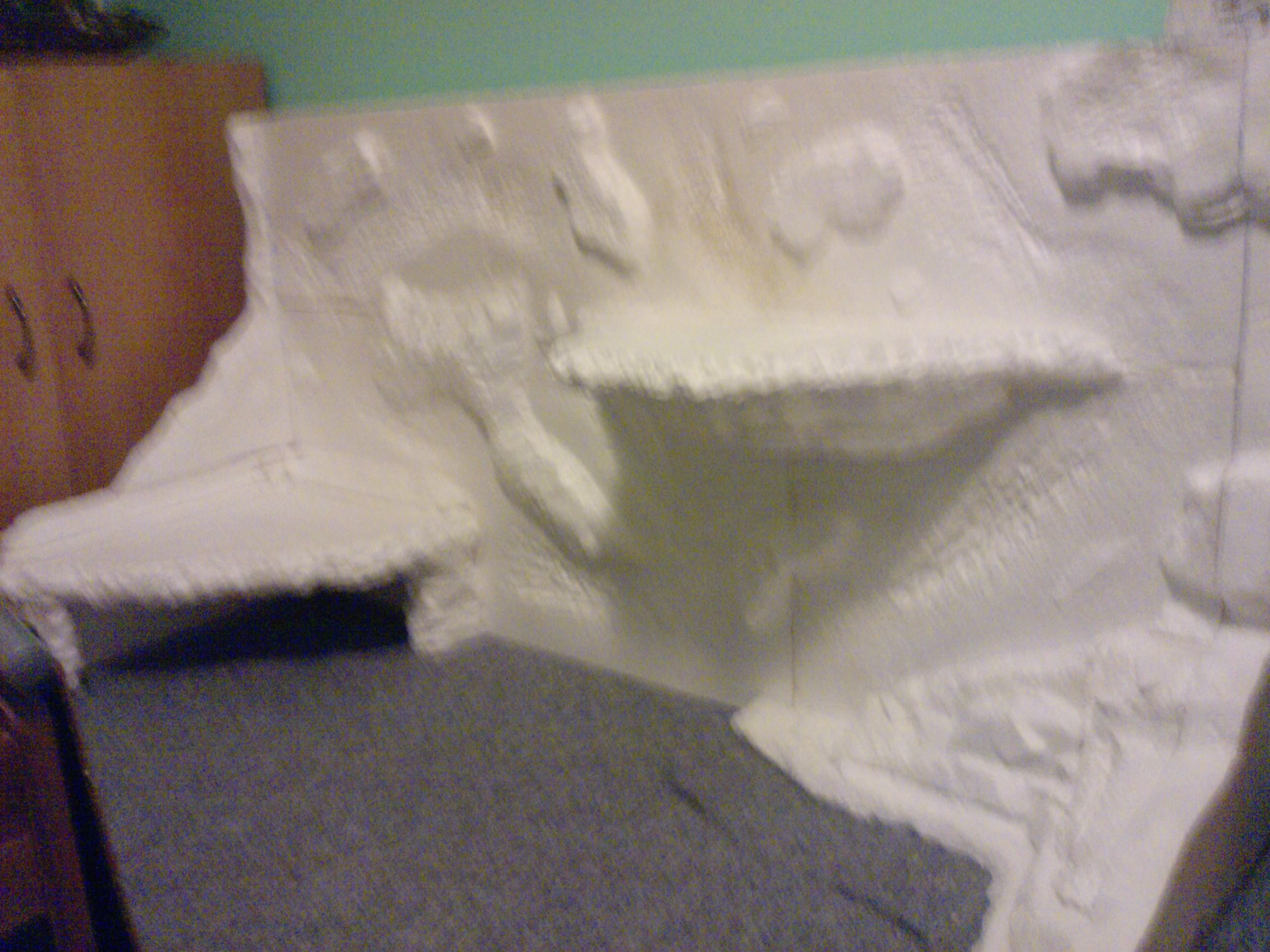 Zde je zadní stěna připravená na povrchovou upravu. Polystyrén jsem tvaroval horkovzdušnou pistolý a lámacím nožem.