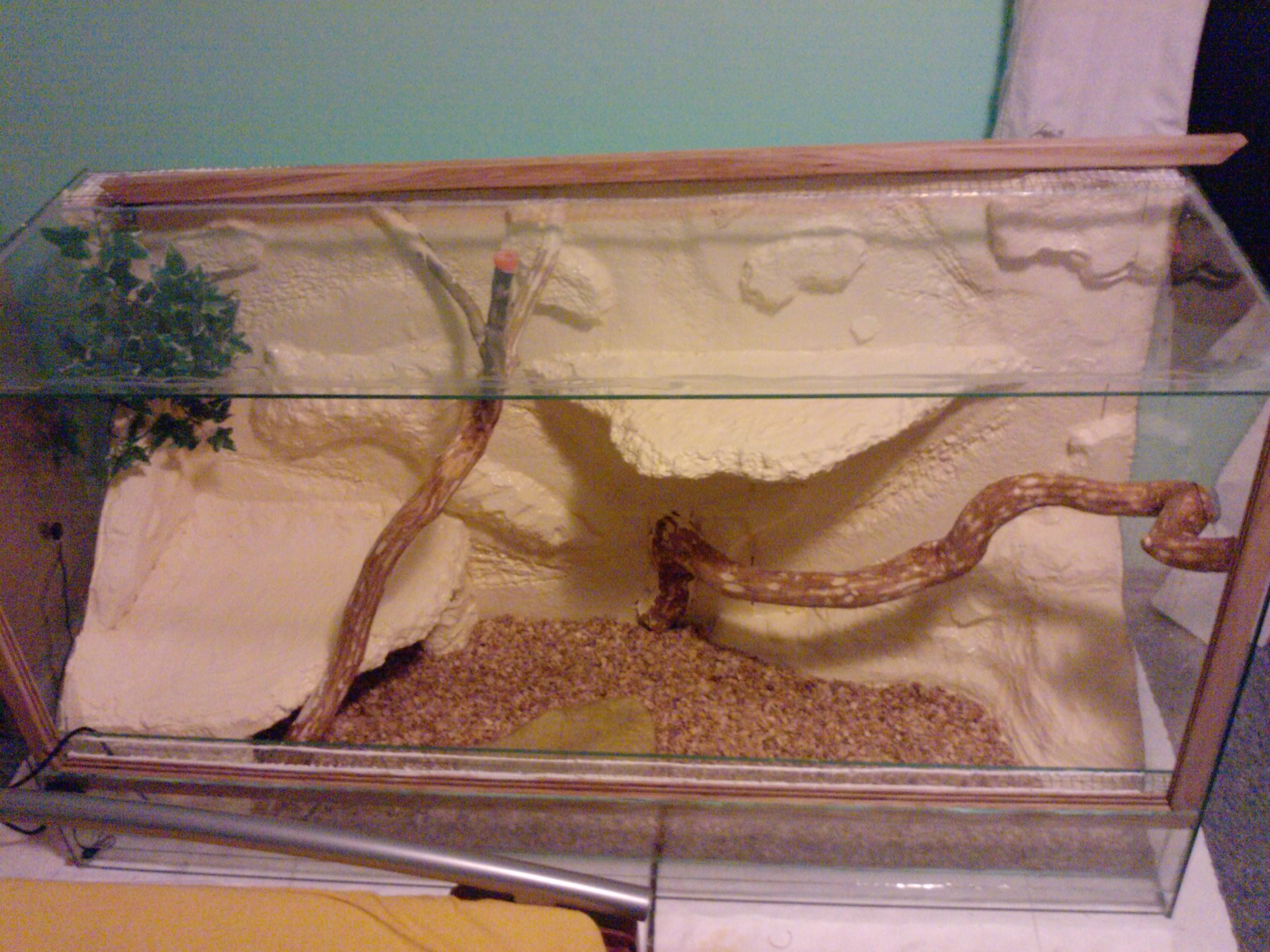 Mám tu další fotky z mé stavby. Dodělal jsem poly. stěnu a natřel jsem jí sádrou, pak 2x vrstvu bokojové barvy a 3x vrstnu bezbarvym matnym lakem. Koupil jsem od exo-terra dig. teploměr i s vyhkoměrem (440,-Kč), a topný kámen o rozměrech 38*18 s výkonem 15W (900,-Kč), přední dvířka terárka jsem udělal s plexiskla a jinak celé terárium jsem lepil akvaristickým tmelem od firmy Soudal a použil jsem 6mm silné sklo.