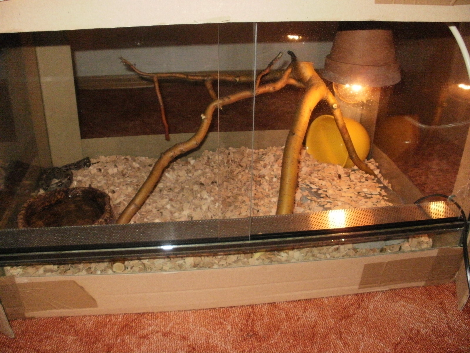 Nejlepší by byla kůra, tak jak to má například tady ve vlákně Staenlyul, druhá fotka. A nejlépe dvě, jednu tam co je ta miska, tedy pod žárovkou u topného kamene a jednu tam kde se hrozna, momentálně povaluje.