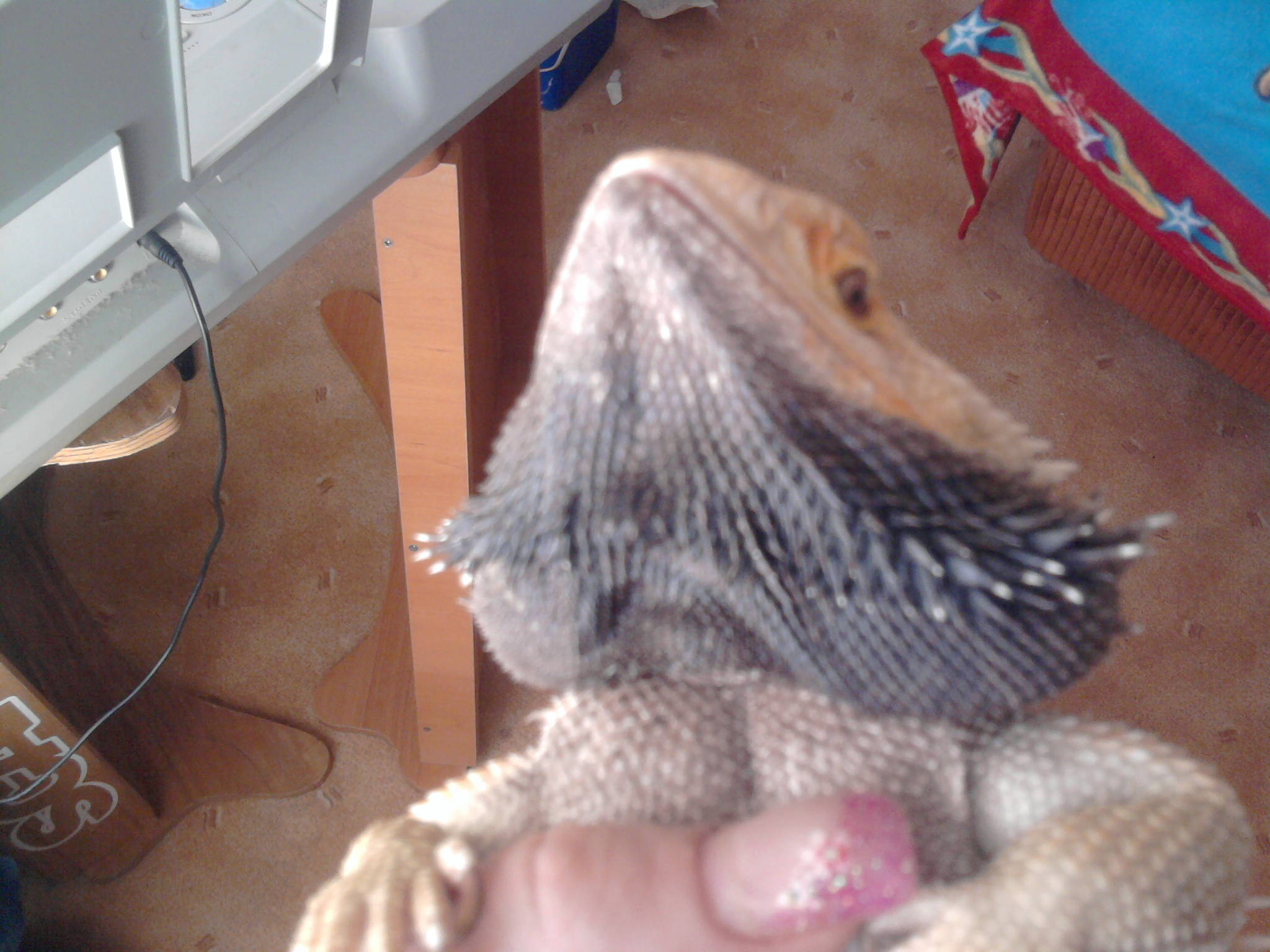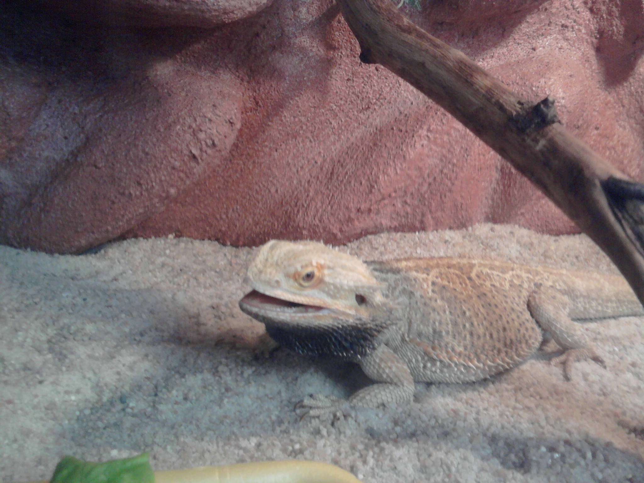 Měří 47 cm. Když jsme ho přivezli, vážil 497gr. a než jsem s ním jela na veterinu vážil 445 gr. a měl propadlé zadní nohy. Teď váží 520 gr. a nožky má buclaté. V teráriu má 60Wžárovku a zářivku UVA 33% a UVB 8%. Když měl vyplou zářivku byla teplota v teráriu mezi 28,5 - 29,7 st a se zářivkou je mezi 31-33st. na nejchladnějším míste má 26,5 bez zářivky, 28,6 se zářivkou. Na noc mu včechno vypínám a má tam 20-22 st. Přikládám i fotky.