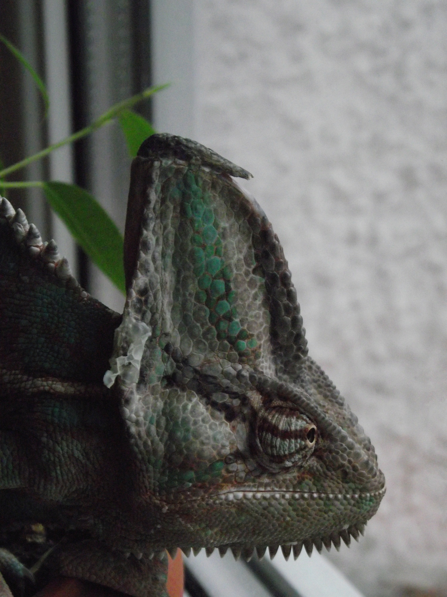 Nepraská mu to po svlkeku ale po popálení o žárovku, je to již starší a teď se to odhojuje. To černý nahoře je mrtvá nekrotická tkáň. Časem to upadne samo, a chamovi to moc vadit asi nebude, je to estetická vada. Doporučuji umístit žárovky tak, aby se k nim do kontaktu nedostal.