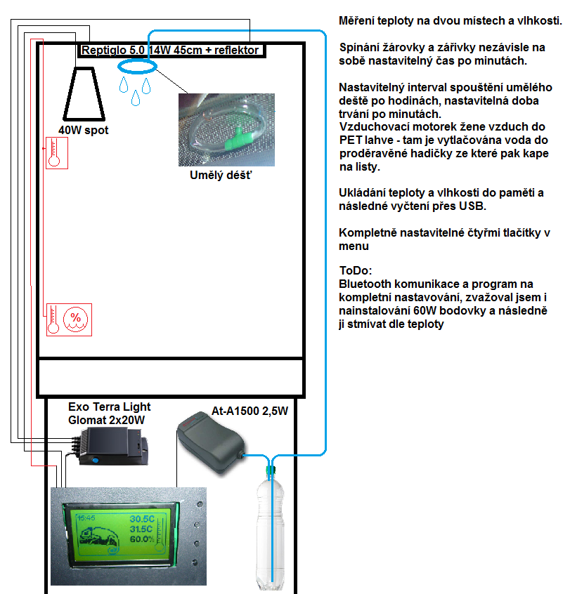 Mlhovac/rozprasovac jsem automatický nechtel-nikdy nevim kde chameleon bude a nechci na nej pustit plnou davku z rozprasovace. Na mlhovac je zase potreba nadoba. Navic chameleoni jemensti nepotrebuji nejakou extremni vlhkost. 60% je absolutne vpohode - neni treba tedy regulovat. Jedine co jsem chtel kdyz nejsme treba na vikend doma aby mel vodu a ja se o to nemusel starat. Svetla se spinaji taky automaticky, cili je jen trosku hladovy po vikendu, stary je ale dost na to aby to zvladl 2 dny bez cvrku.