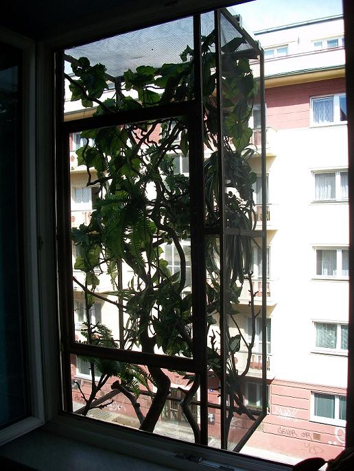 spodek je posazenej na parapetu nahore jsem do toho prekladu navrtal dve diry nacpal tam hmozdinky a takovy to sroubovaci ocko skrz je protazeny ocelovy lanko a to je je zase pres ocko uchyceny na hornich rozich ty voliery...a pro jistou je to jeste heftnuty dvouma vrutama do vrchni casti toho okenniho ramu....