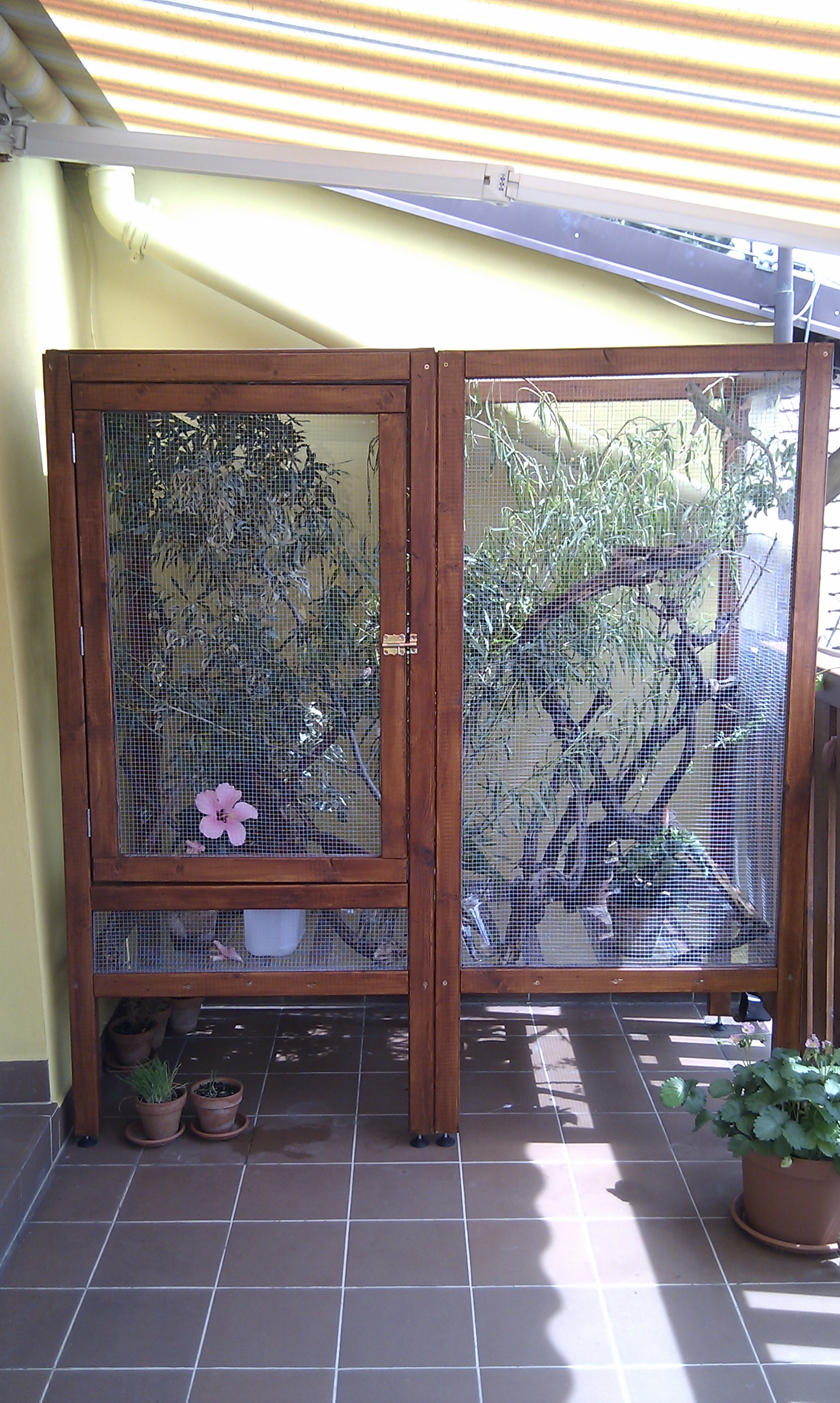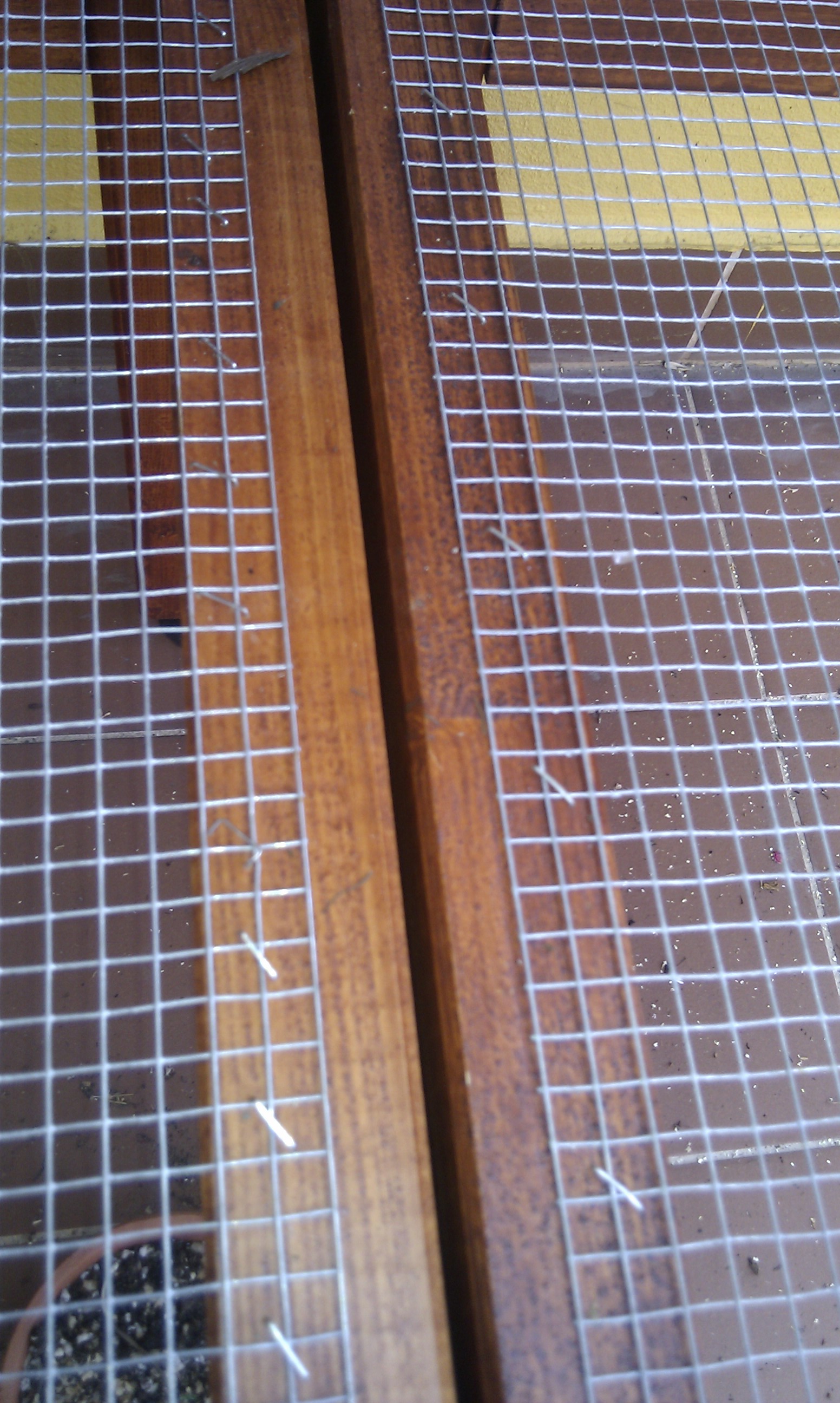 Celou voliéru jsem pojal jako dvě oddělené části které jsou k sobě sešroubované vruty a pokud bude potřeba, bude je možno kdykoli oddělit. Dvě kolmo na sebe postavené stěny a strop jedné z voliér jsem udělal ze skla coby závětří a na strop jsme ještě se synkem nalepili protisluneční fólii ( 1. zabrání vysypání skla při případném rozbití, 2. chamíci budou mít možnost se schovat před sluncem ). Zbytek stěn, strop a dno jsem udělal z pletiva s oky 1 x 1 cm.