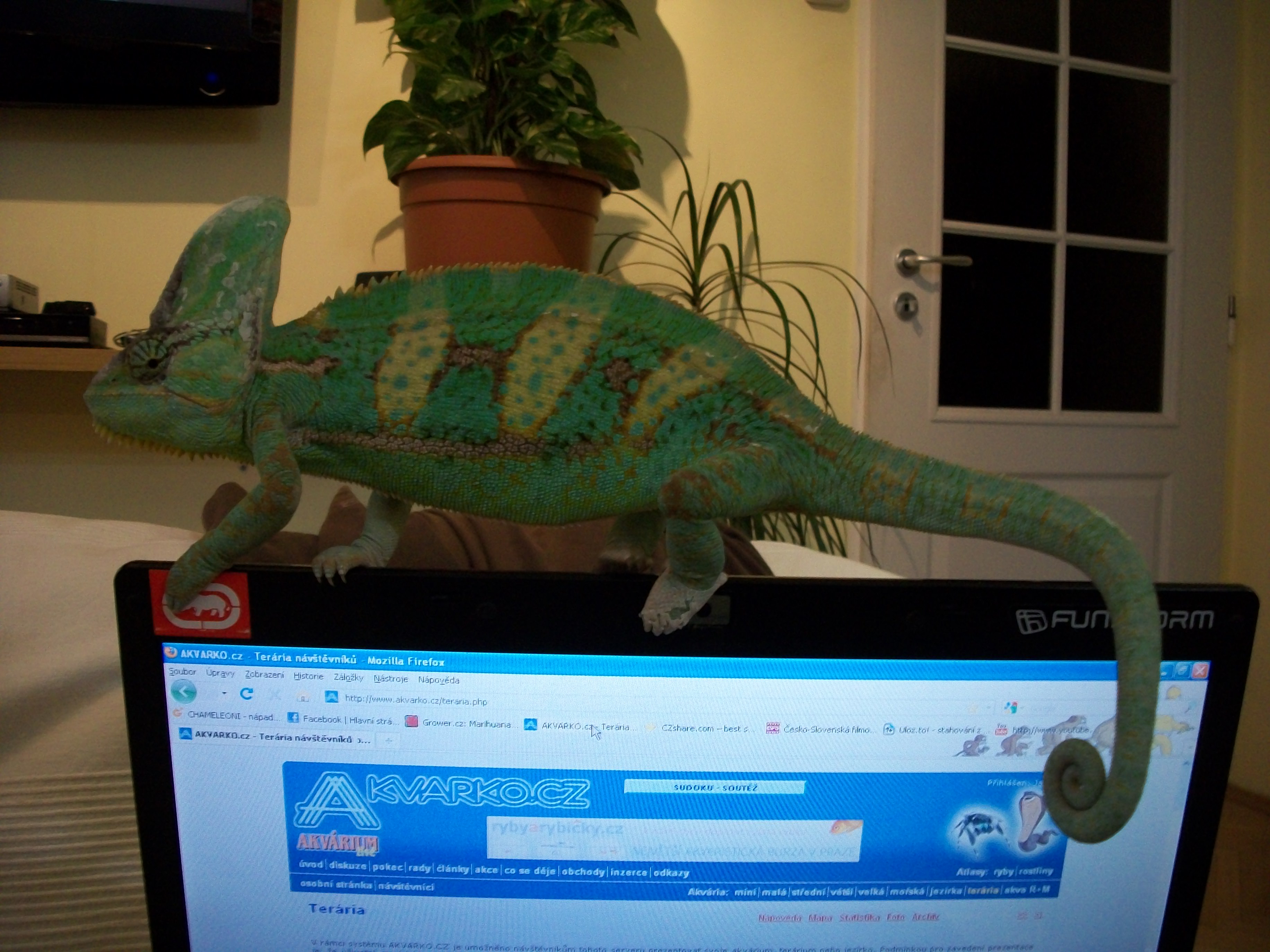Ps.: Z fotky se věk chamíka poznat moc nedá. To, jak váš chameleon vypadá, kolik váží a v jaké je kondici, nezáleží na věku, ale na tom, jaké má podmínky. Takže můžou být dva stejný chamíci z jedný snůšky, jeden pěkně naroste, bude dobře živenej a bude vypadat, jak by měl...a u jinýho majitele to může bejt podraženej mrzák, co bude velikostně na dvou třetinách toho druhýho a pravděpodobně i chcípne o několik let dřív. Takže můžete vložit třeba fotku chamíka i terárka a my vám tu můžeme říct, jestli má optimální podmínky a jestli by nebylo potřeba něco, v zájmu zdraví chamíka, změnit. Už ta miska s vodou je divná...