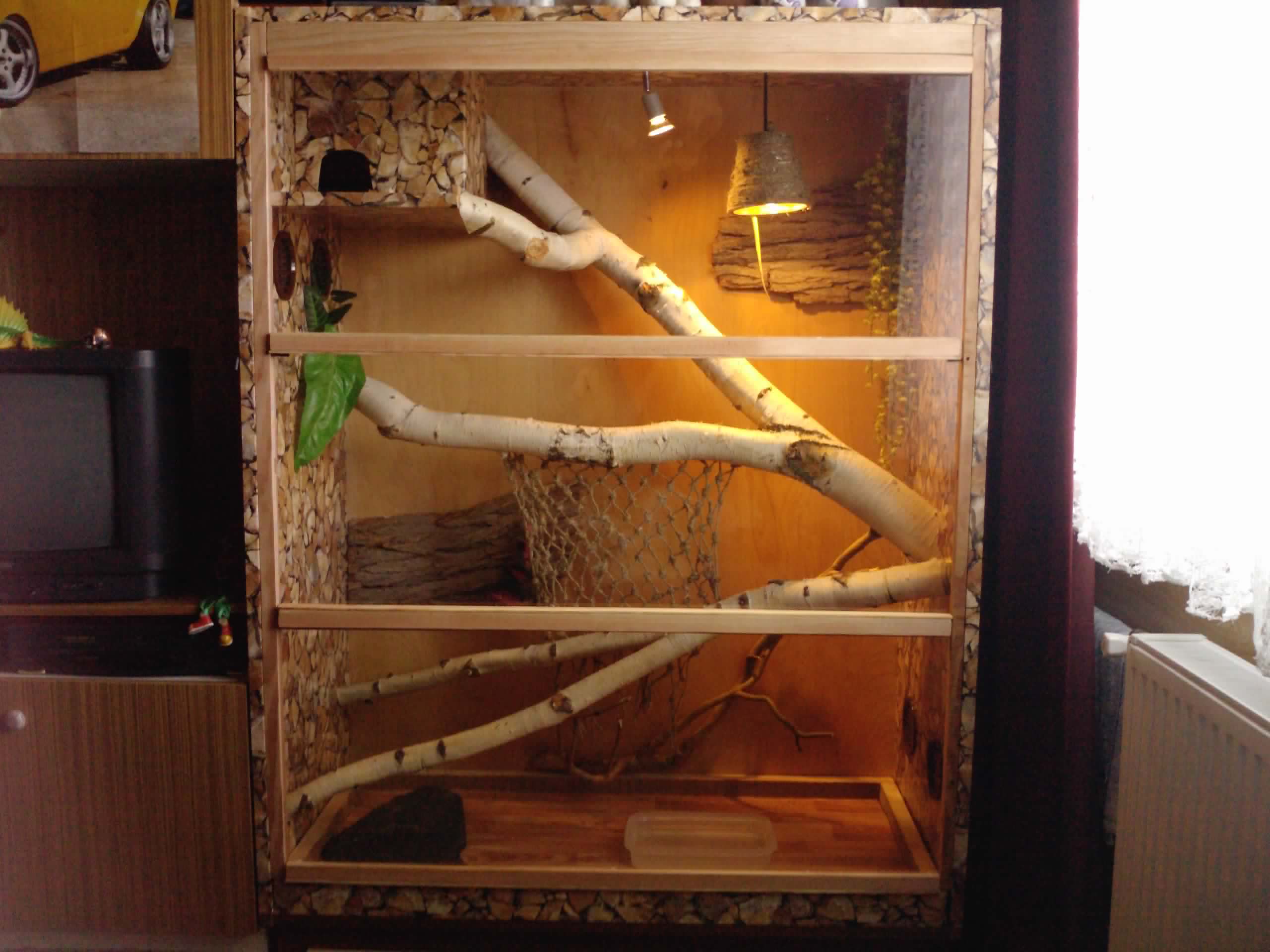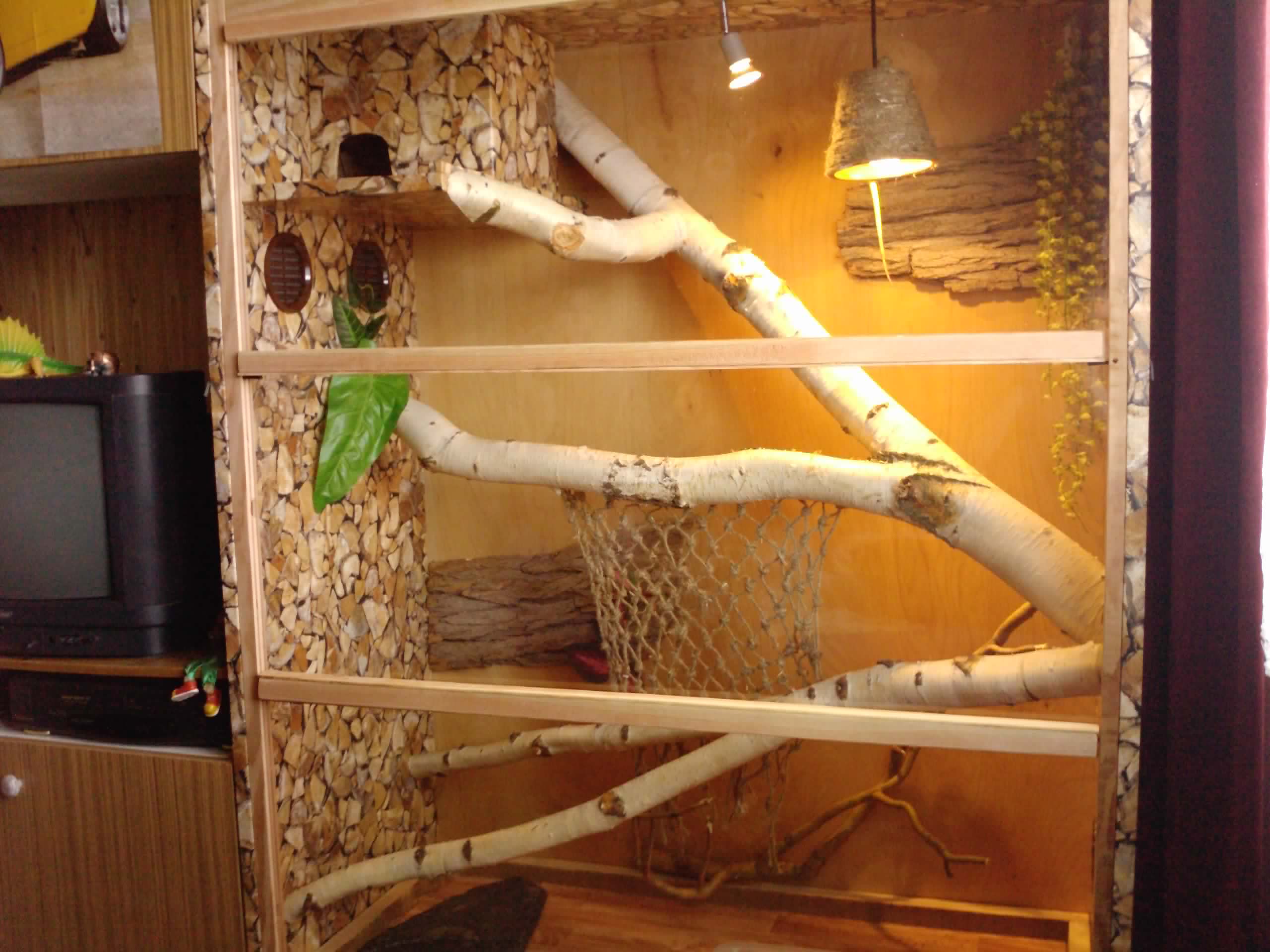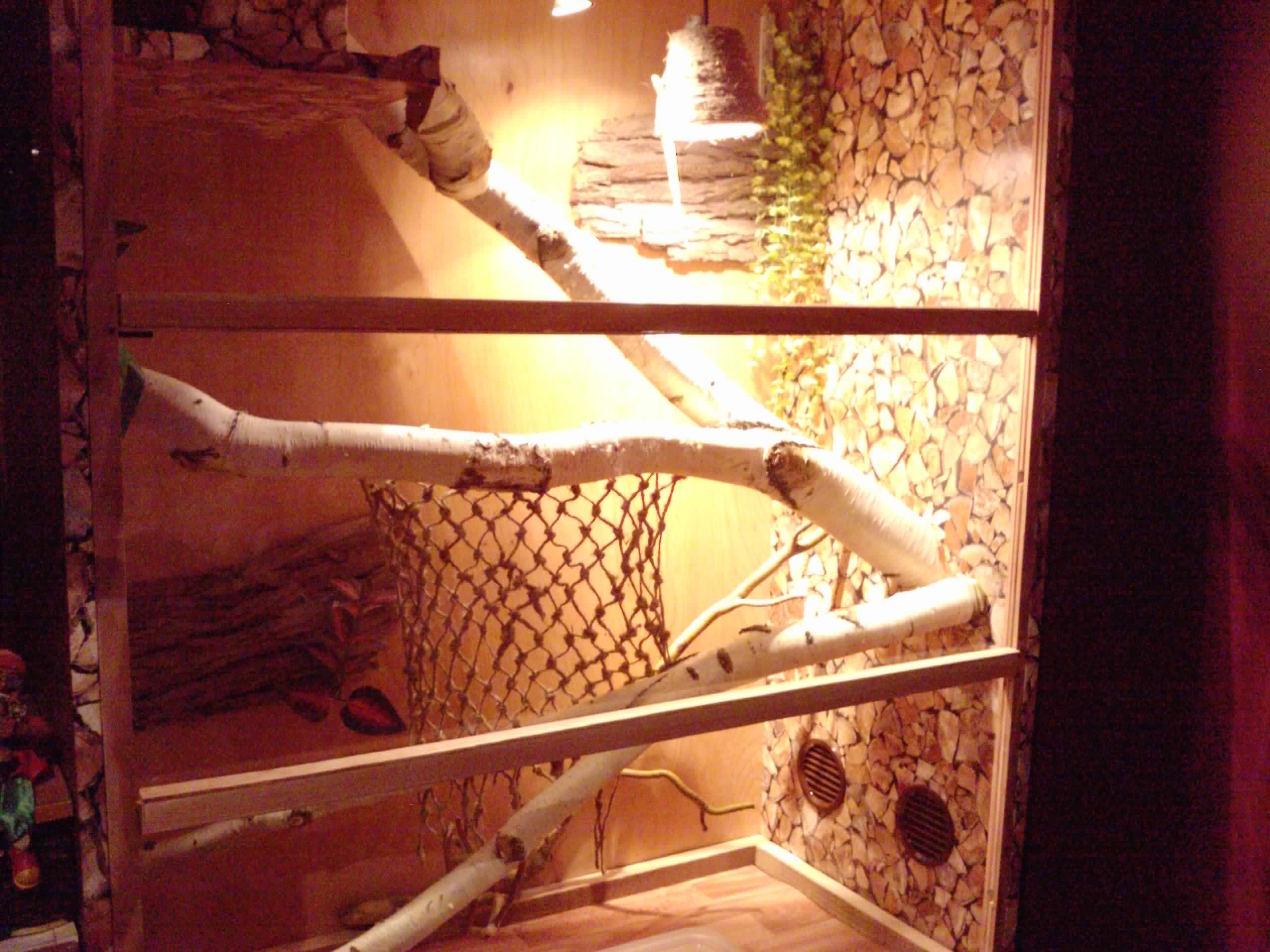 Přikládám 3 fotky, terárko je ze skříně 120 x 150 X 58 cm. Jsou tam dvě žárovky 35 a 40 W. V místnosti, ve které se terárko nachází, je kolem 23°C. Větrání je vidět na fotkách - dva kulaté otvory o průměru 10 cm vpravo dole a dva stejné vlevo nahoře.