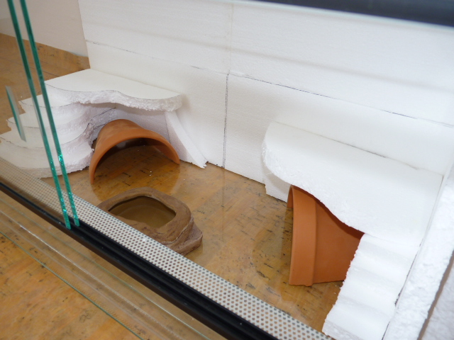 Dobrý den, zapracovala jsem tento týden na teráriu pro gekončíky noční a toto je výsledek, ještě mě čekají nějaké finální úpravy, než vše slepím a hodím do finální podoby. Ale chtěla jsem se optat na jednu věc. Je jasné, že nechci aby byla pravá boční a zadní stěna z polystyrenu vidět (zezadu a z boku) i přesto, že terárium bude u stěny. Nevím jak to zakrýt, zevnitř za to nic dávat nechci...to je myslím zbytečné, tak přemýšlím, že bych zvenku přes sklo dala jen černou folii, nebo zbytek z lina nebo tapety (která má motiv dřeva např.) Myslíte, že by se to tak dalo vyřešit? Nebo nějaká jiná možnost? Předem díky za odpovědi.