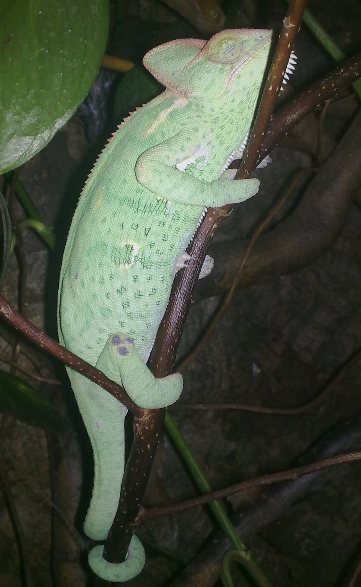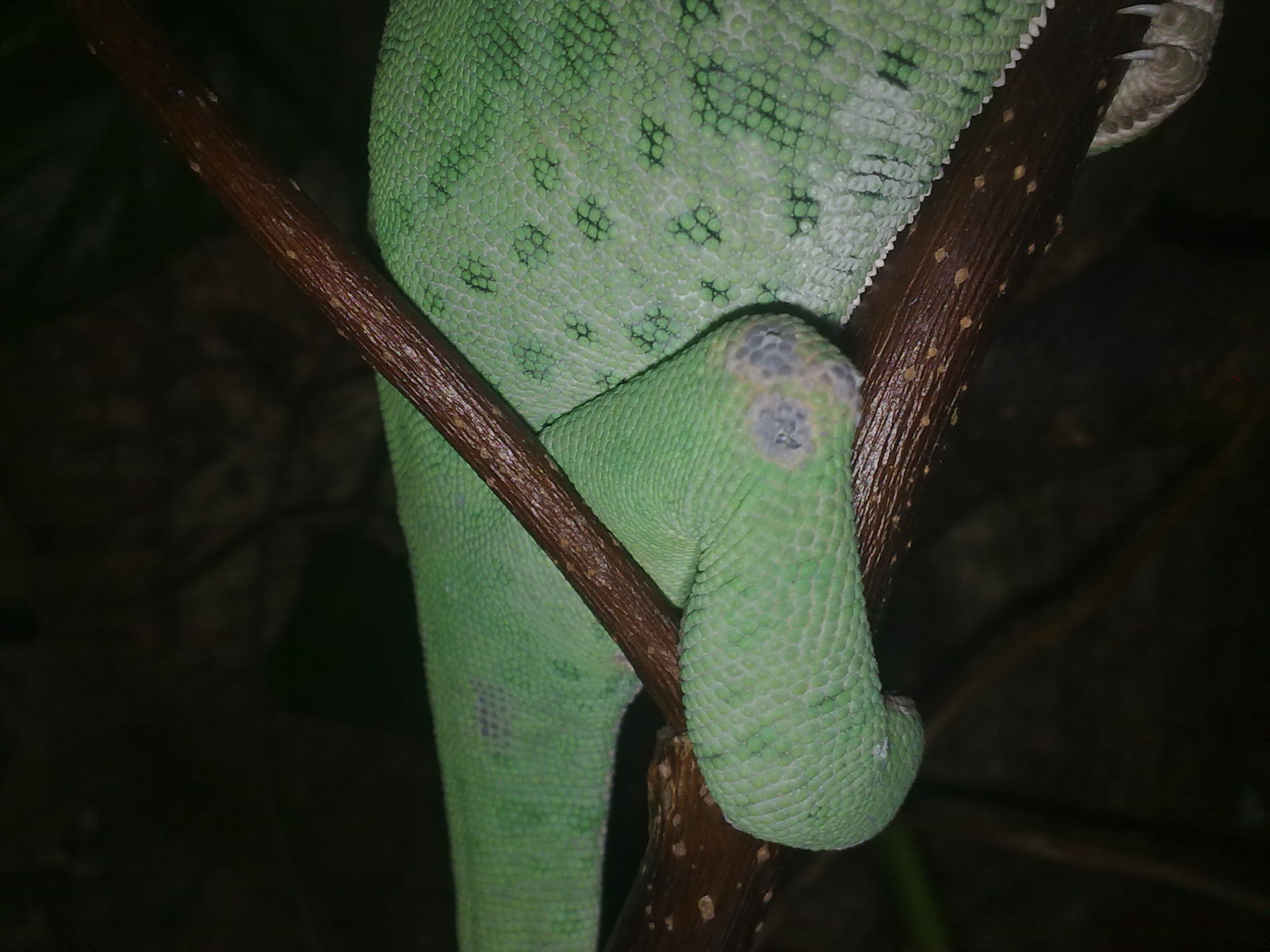 Jedná se o 5ti měsíčního chameleona jemenského (Chameleo calyptratus) a asi před 10ti dny se svlékal a po jeho svleku se na jeho těle objevili šedivé skvrny překryty starou kůží, která při svleku neodpadla. Nejvíce zasažené místo je na pravém zadním koleni viz foto, poté mnohem menší skvrnka je na ocase.