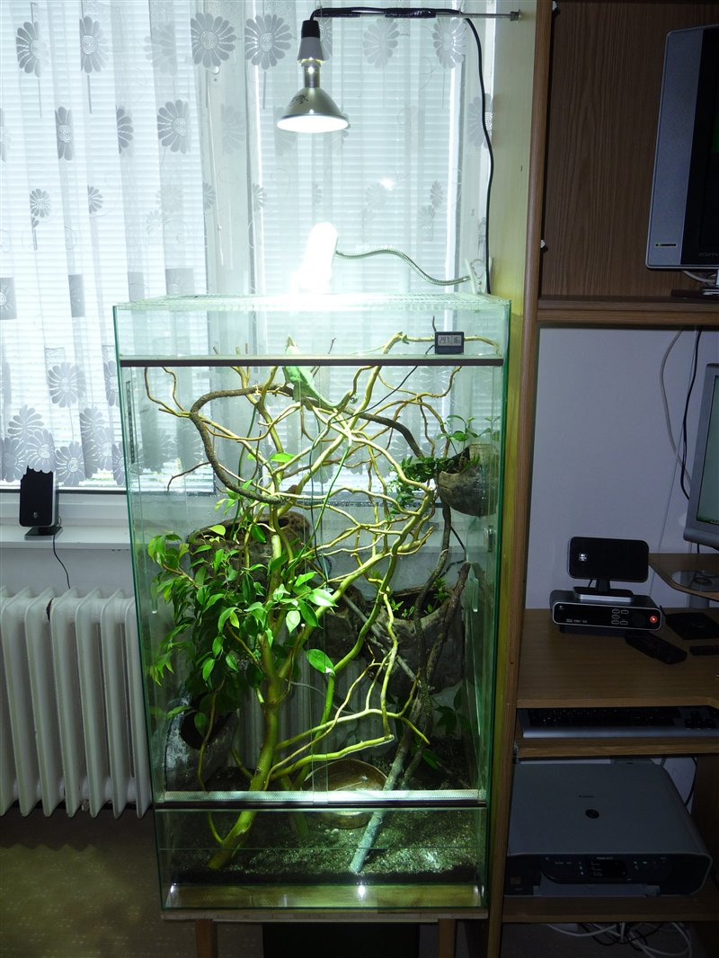 tak už mám terárko zařízené včetně výbojky solar raptor 70W flood. Pod lampou na výhřevném místě je cca 33-35°C, v zimě budu musetještě přidat nějakou bodovku.