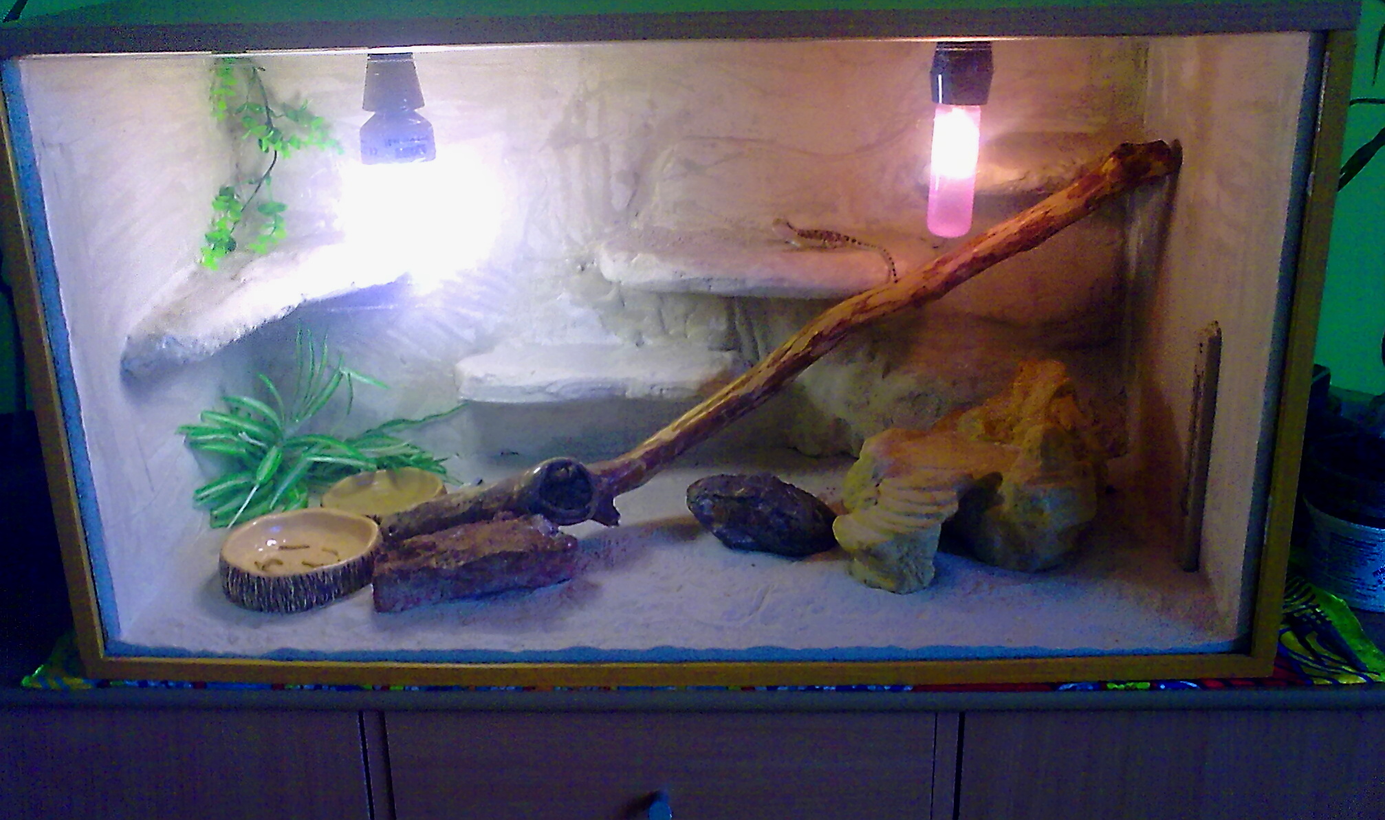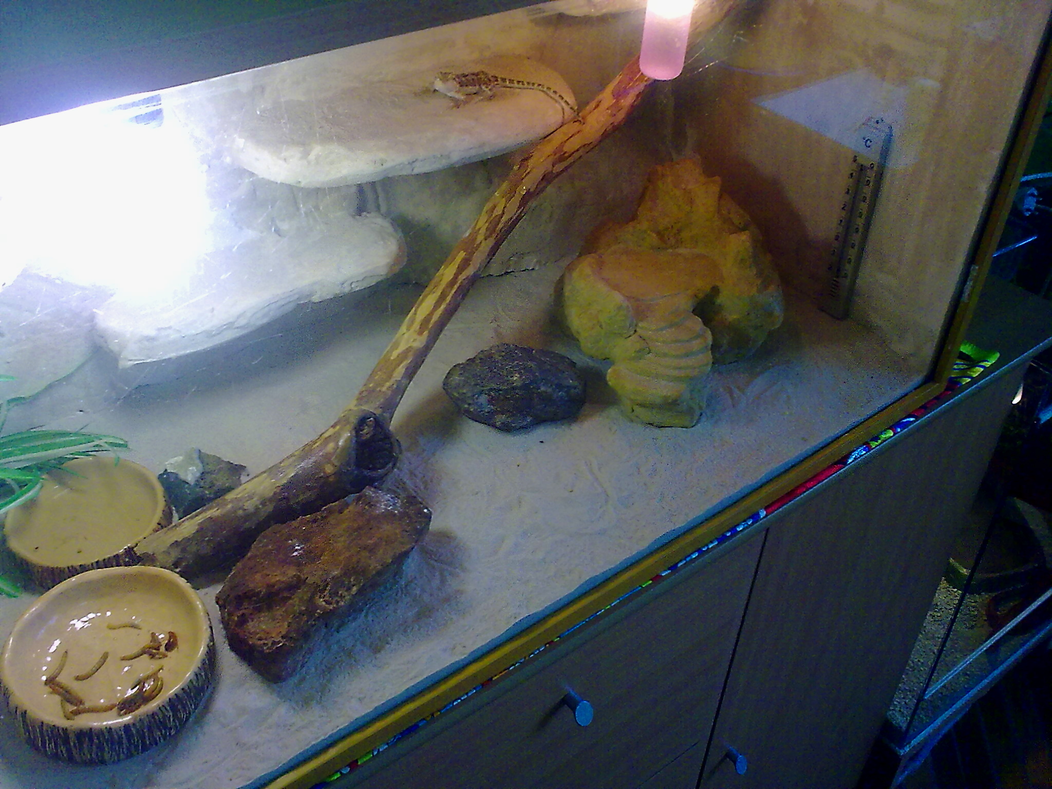Houmre bodejť by ti nežrala, když tam nemáš topení. Pod kterým z těch zdrojů že má těch 45°C ?? To SunGlo vpravo dej dopryč, není to tam k ničemu a místo něj dej bodovou žárovku 25-40W - pod tou žárovkou nech volnej prostor, aby tam mohla agama ležet (plochej kamen ideál) a měla tam něco přes 40°. A nahoru dej aspoň jednu trubicovou zářivku, stačí uplně obyč T4,T5,T8 kuchyňská "podlinkovka".