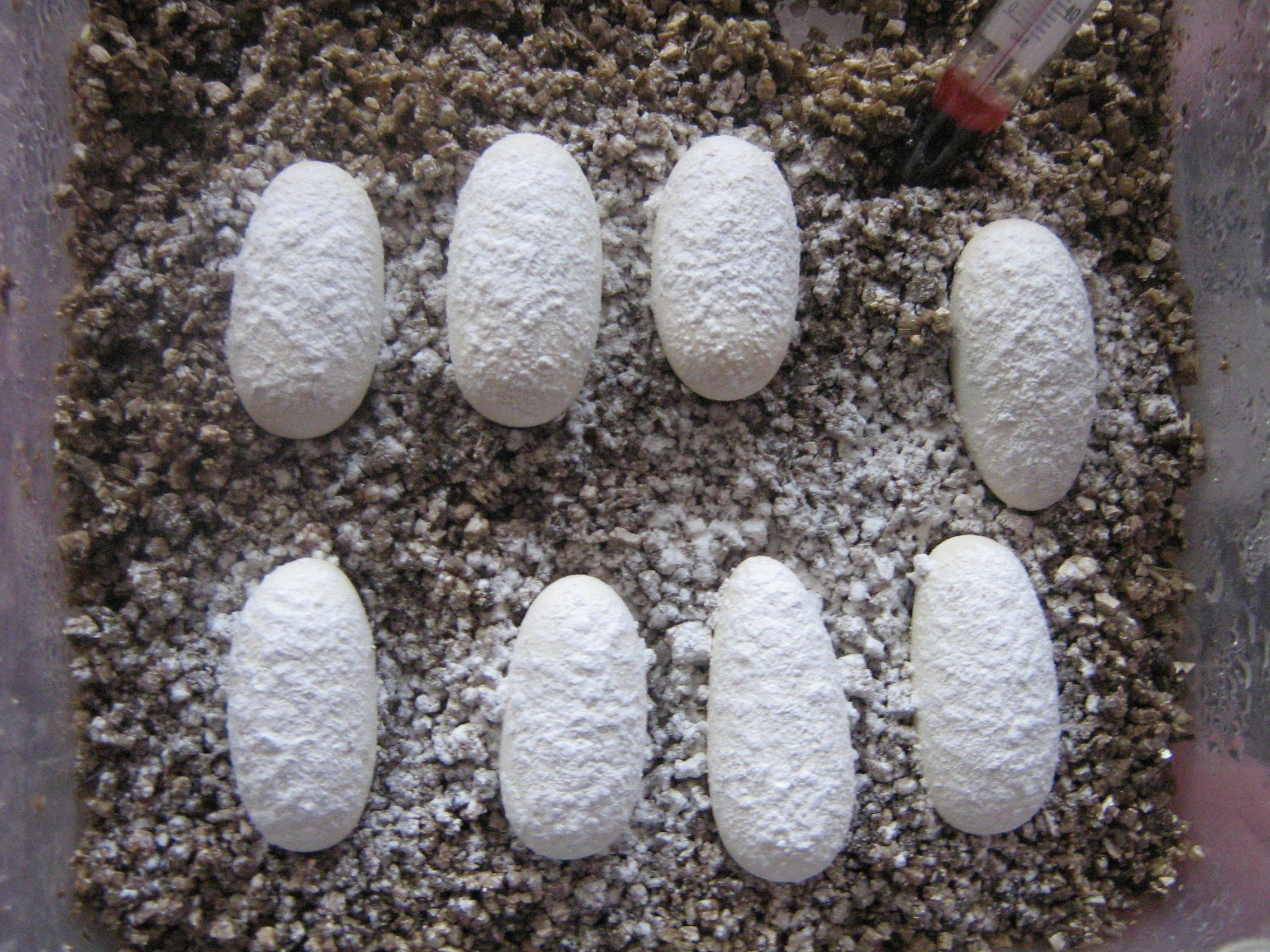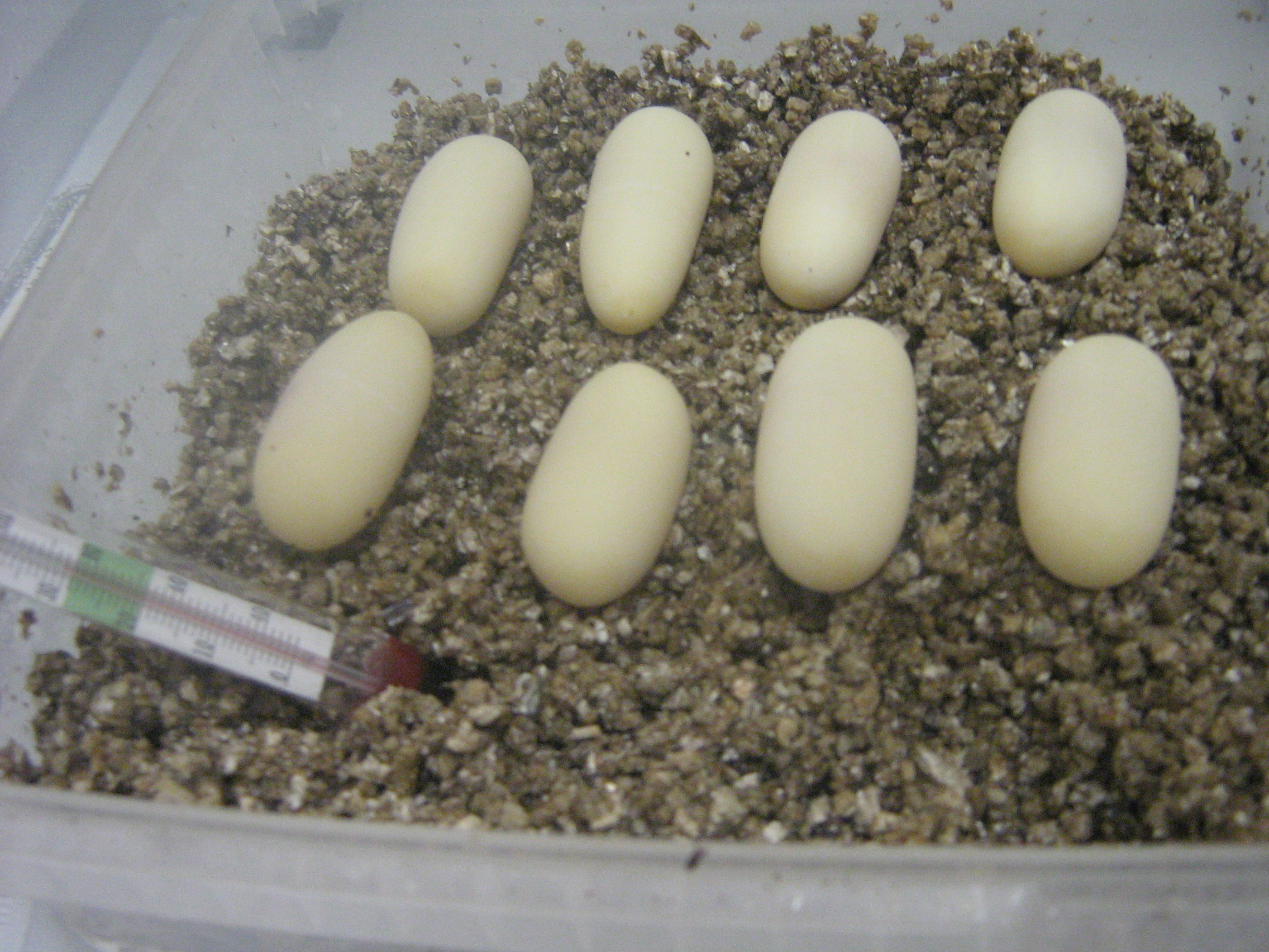 No vejce jsou stejně zbarvená jako loni. Co se týče velikosti hadů tak samec má 120cm a samice 110cm stáří 3roky. Loni měli taky osm vajec a vylíhlo se sedm mladejch, to poslední my taky po celou bobu plesnivělo, když se pořád neklubalo tak jsem ho otevřel. Našel jsem tam krásného hadíka který se neprořezal ven a pravdě podobně se udusil. Zatím tam vajíčka nechám všechny a uvidím jak se budou tvářit.Proč se nepropadaj když nejsou oplodněná? Myslím že by se deformovala nebo ne?
