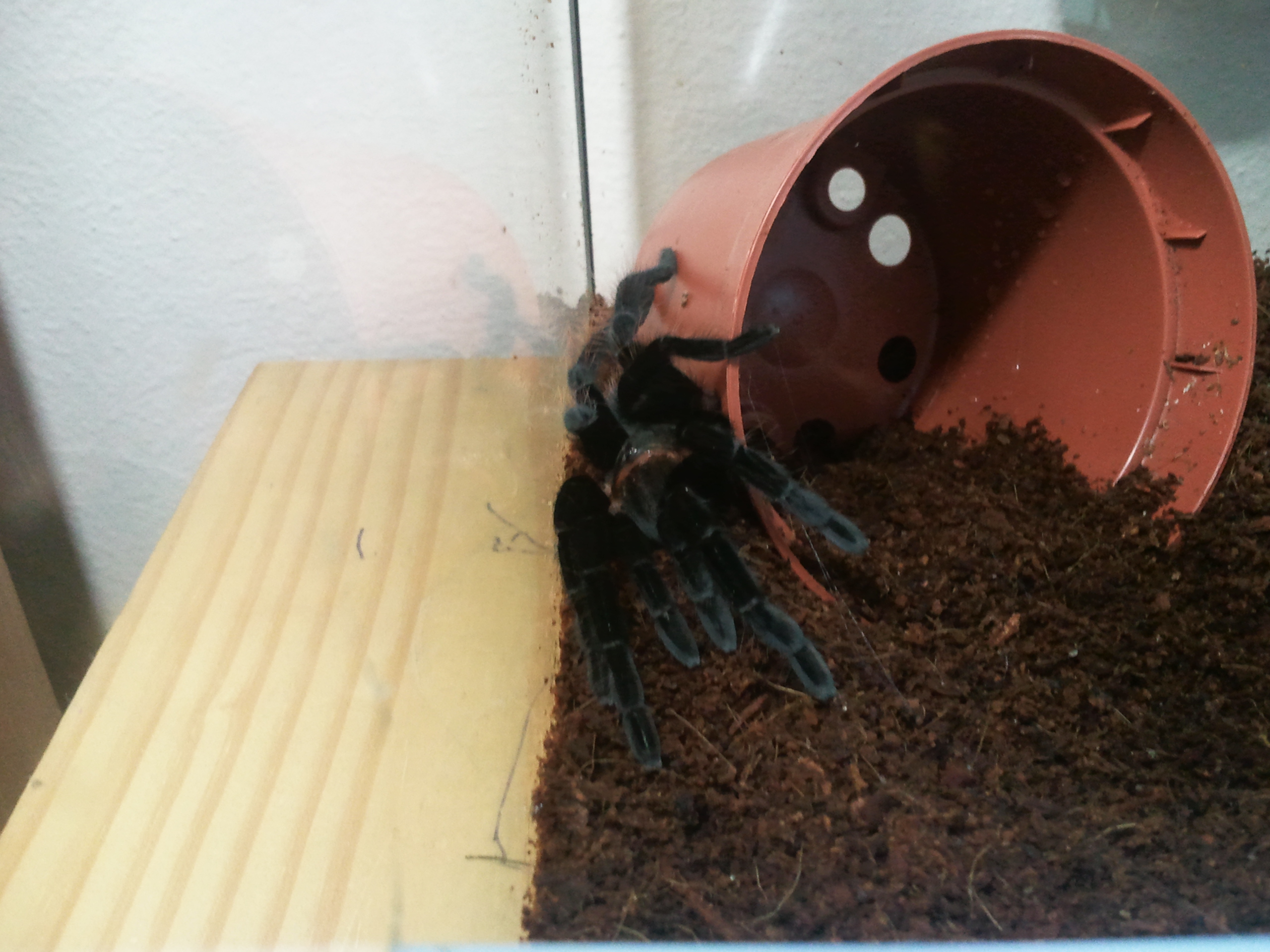 2. Asi o hodinu sa pohla, šla za úkryt, a vipúšťala po ceste pavučiny. Sedí tam asi 4 hodiny a nehýbe sa. Cvrčka (ktorý si veselo chodí po stene terária) si ani nevšimla.