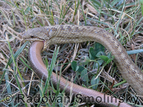 V dobách mého teraristického začínání jsem mimo jiné choval V. berus. Samice z odchytu sice nežraly, ale jeden z jejich potomků u mne v chovu zůstal další dva roky. Z miniaturní, asi 8 cm dlouhé zmijky vyrostl za ty dva roky krásný asi čtyřiceticentimetrový sameček. Bez problémů přijímal myši a kopané hraboše. Jednou mi kdosi donesl slepýše, zhruba stejně velkého jako byl ten zmiják. Z literatury jsem věděl, že v přírodě slepýši patří do potravního spektra zmije. Tož co to nezkusit...