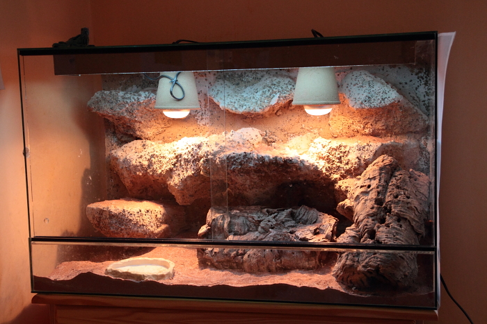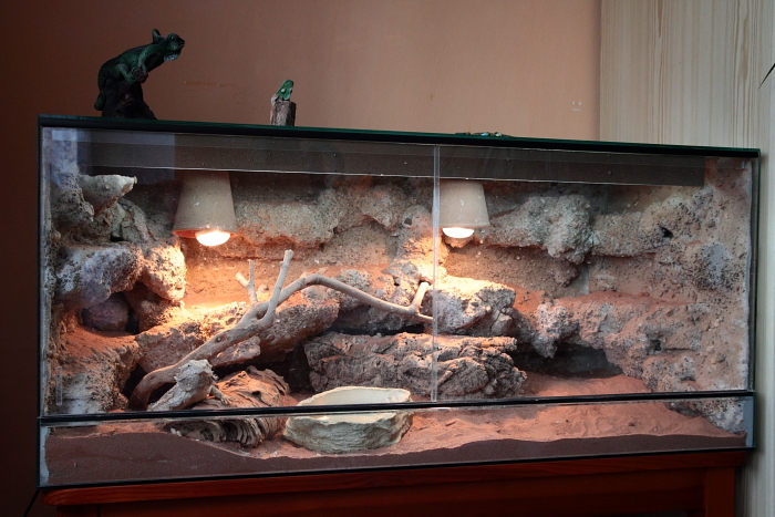 Bohužel, jiné svícení nemám, ale terária jsou umístěna v pokoji s velkými okny směrem cca jihojihovýchod a pokoj je dost světlý. Jedno terárium je na jaře v určité části dne přímo osvěcováno slunce, druhé je mírně ve stínu, ale i tam na večer lehce svítí. Jinak agamy občas nechávám proběhnout po bytě a tehdy se sluní na koberci pod okny.