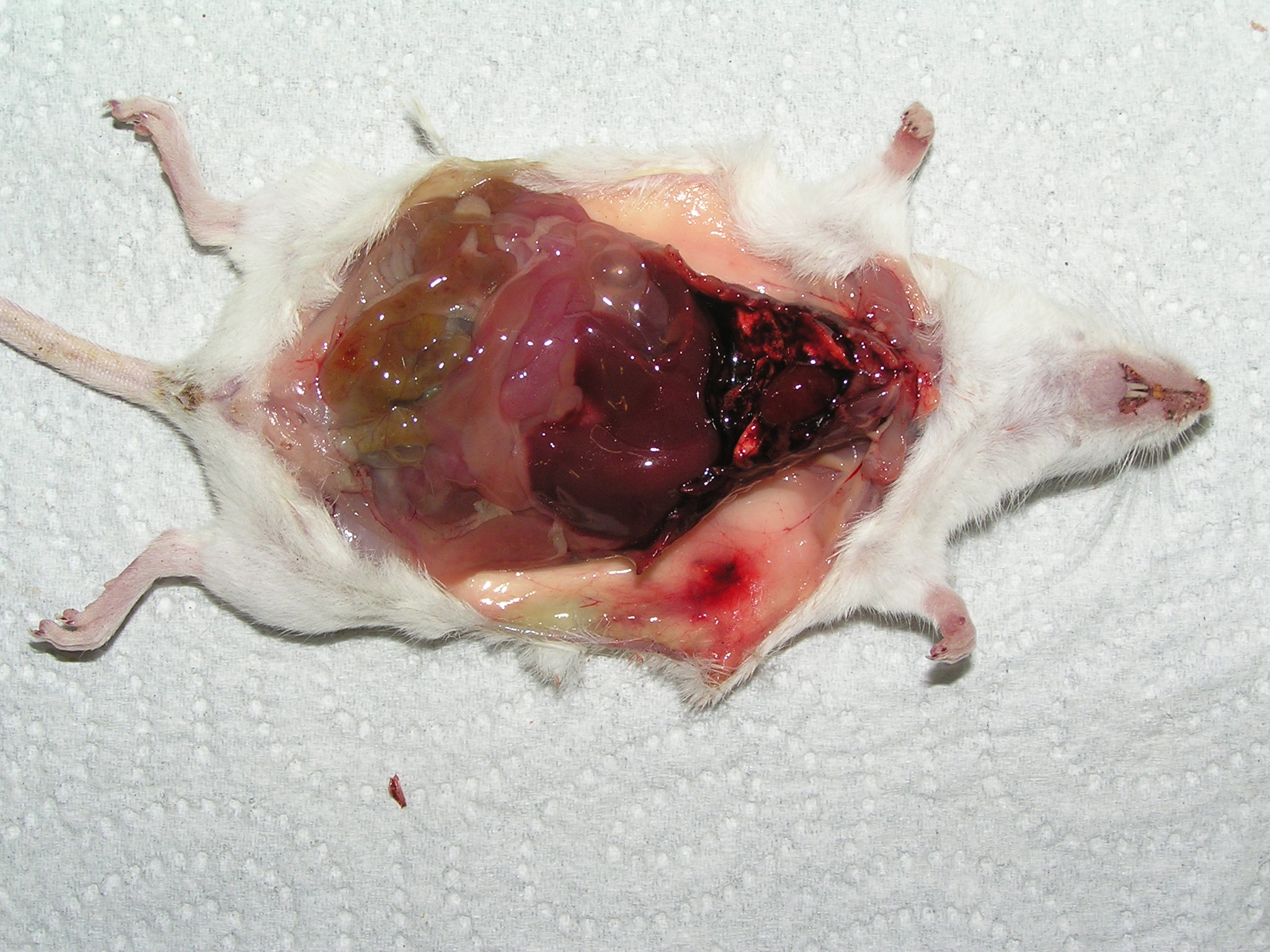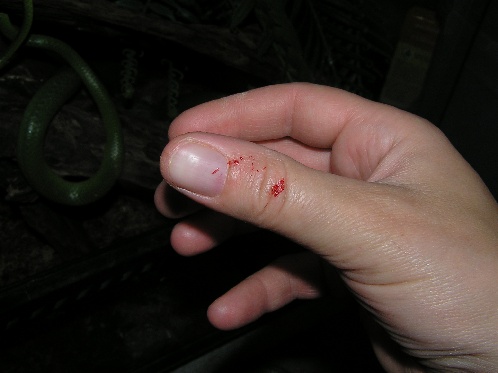 přikládám fotky ruky po kousnutí adultní boulengerkou- v podstatě nic, jen razítko s většíma dirkama po zvětšených zadních zubech. Kousla omylem, když místo po myši vyjela po ruce. A slíbené myši po kousnutí baroňákem. Byli to menší adulti krátce po importu, ještě trochu streslí a prudiví. zkoušela jsem je nakrmit, některá zvířata si vzala, některá ne a 1 zvíře živou myš akorát rychle raflo do boku a uteklo. Tak jsem myš odchytila a dala zvlášť, že to zkusim jindy...tvářila se jenom trochu otřeseně a měla oslintnutej bok, což si vzápětí očistila. Asi po 6 hodinách, když jsem krmila myši, tak koukám, že myš je tuhoš. Tak jsem ji vyndala, nebylo na ní nic vidět, tak jsem ji ze zvědavosti odpitvala a nestačila jsem se divit.