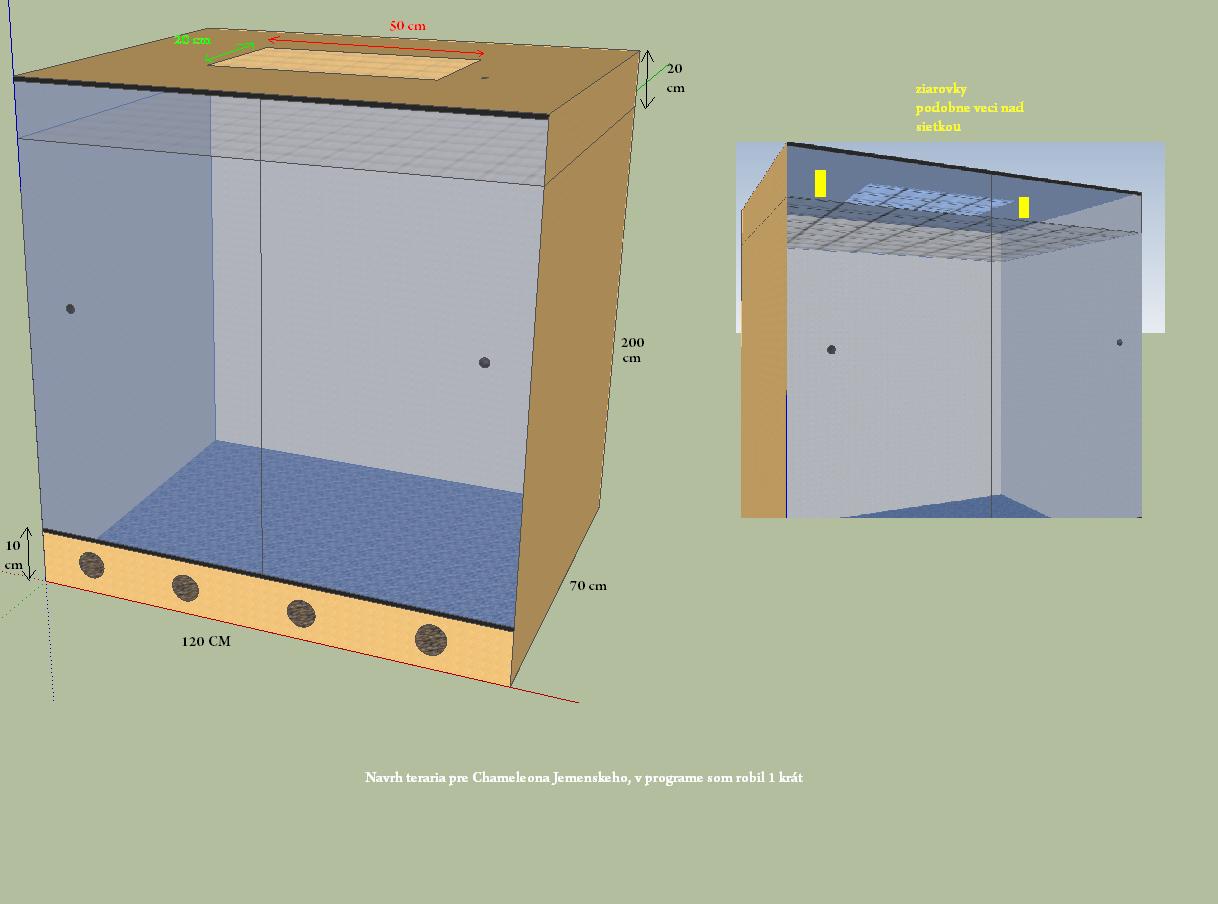 Takze navrhol som si terarium pre chameleona jemenskeho. Je dost velke pocul som ze na zaciatok by som mu mal spravit trocha mensie aby sa v nom nestratil atd... Takze sa chcem spytat ci je to pravda + aky mlhovac,ziarovky,rosovac,rastliny (umele) + pozadie by som chcel spravit z polistirenu ale neviem co dalej, mam to natriet lepidlom na kachlicky potom farbou. Este by som sa chcel spytat ci mozem to teraria pre chameleona jemenskeho dat vodopad (sam si chcem spravit) kedze vraj chameleon pije tecucu vodu a kvapky vody na rastlinach.