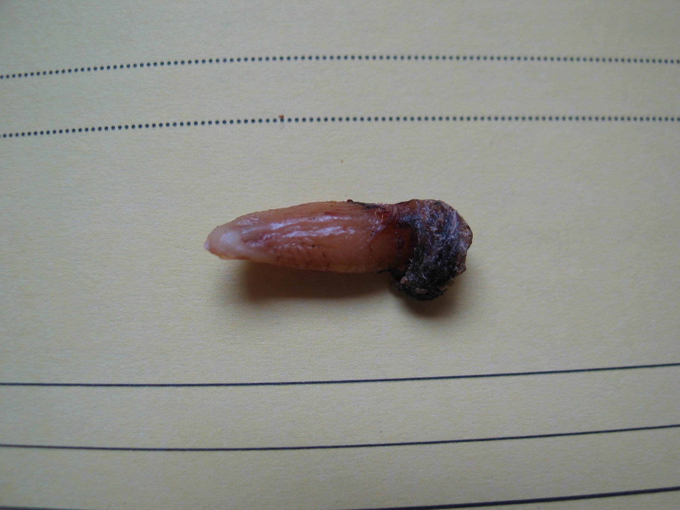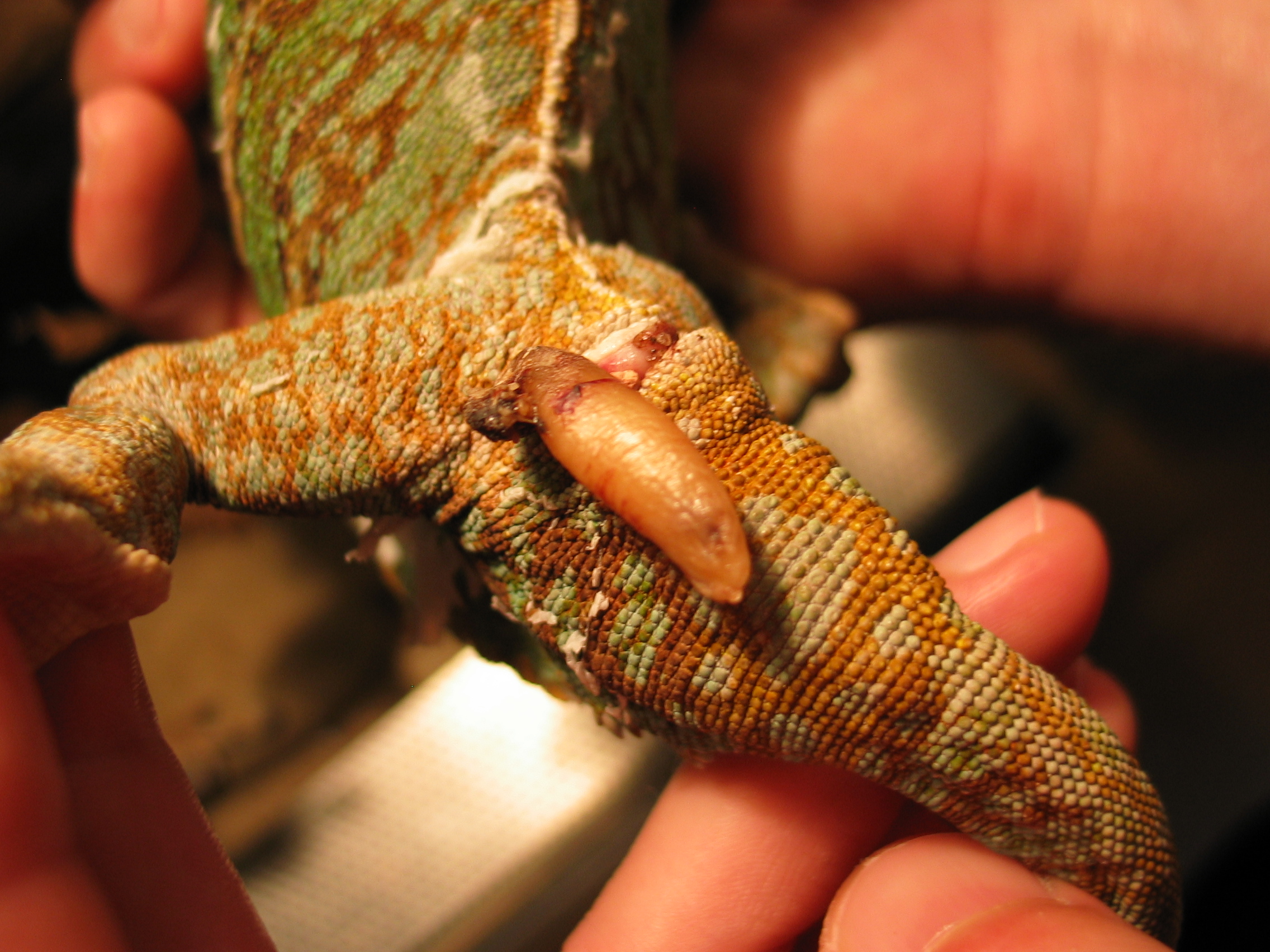 Hemipenis jsem odstranil pomocí čepelky skalpelu, držel pouze na 1mm široké cévní stopce, rána minimálně krvácela (1 kapka krve), kloaku jsem desinfikoval Betadinem a dal na ní mast Framykoin. Snad to chameleon přežije.