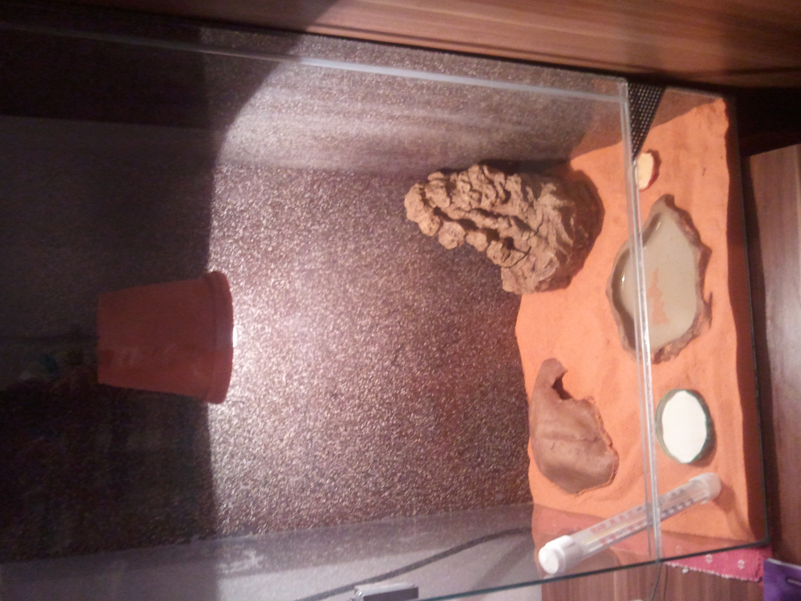 40W žarovka, pár skrýší ze starých květináčů a dole jemnoučky pisek ze zverimexu. Jinak tam byla i miska s vodou
