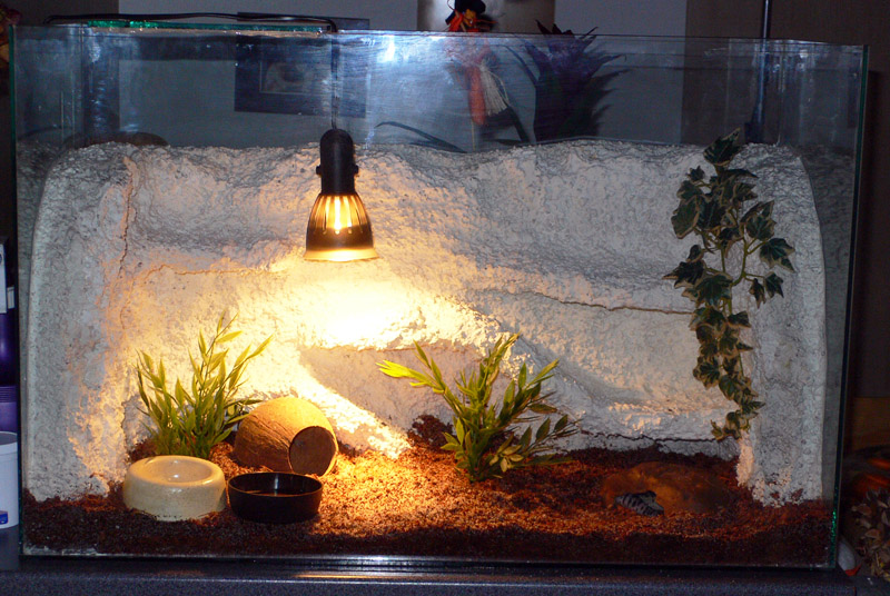 Dobrý den, prosím o rady pro začátečníka. Pořídili jsme si gekončíka nočního a chtěla bych poprosit o rady, zda máme terárium správně vybavené. Zadní stěna je vyrobená z polystyrénu se směsí lepidla, písku, kamínků a cementu. Na dně mám tera písek a lignocelem, žárovka je zatím provizorní, ale už se mi dělá výhřevná, vložená do květináče. Domeček jsem mu včera koupila větší, tento na fotce se mi na něj zdál malý. Chtěla bych koupit topnou desku pod teráriu, mám koupit nějakou menší, která bude jen pod částí terária? Jak ji mám pod terárko dát? Na nějakou desku, pak tu topnou, navrch alobal a až pak terárium? Nějak se mi nedaří docílit požadované teploty v celém terárku, pod lampou má dobrou, ale jinak tak nejvíc 23, což je málo. Díky všem za rady pro začátečníka.