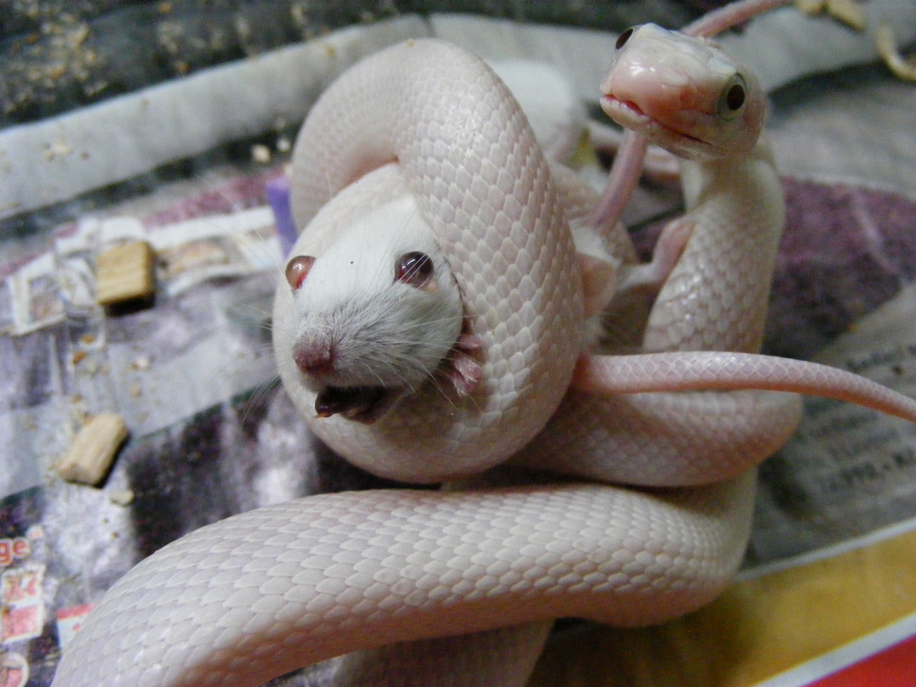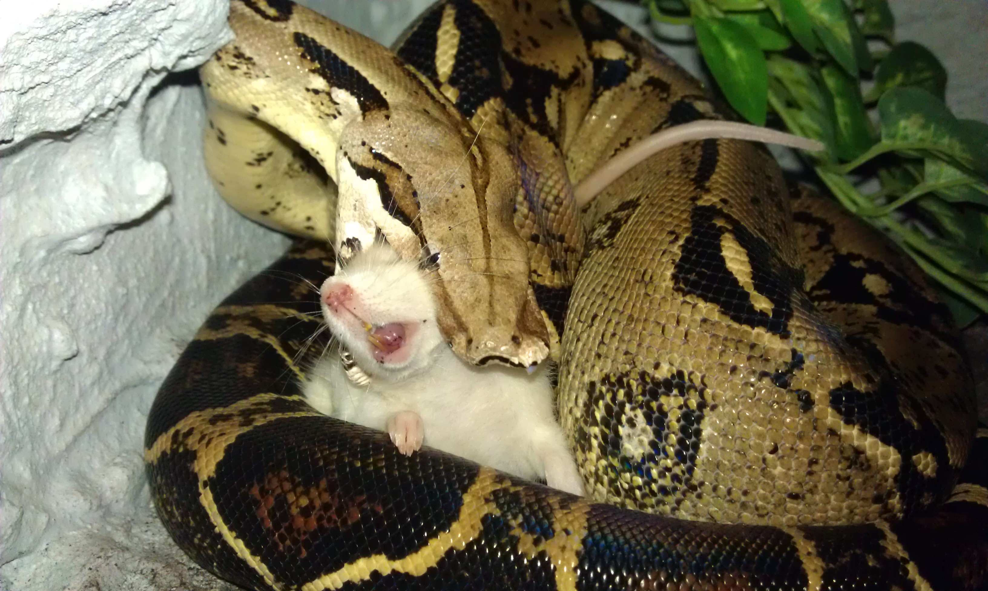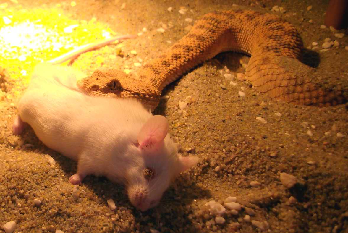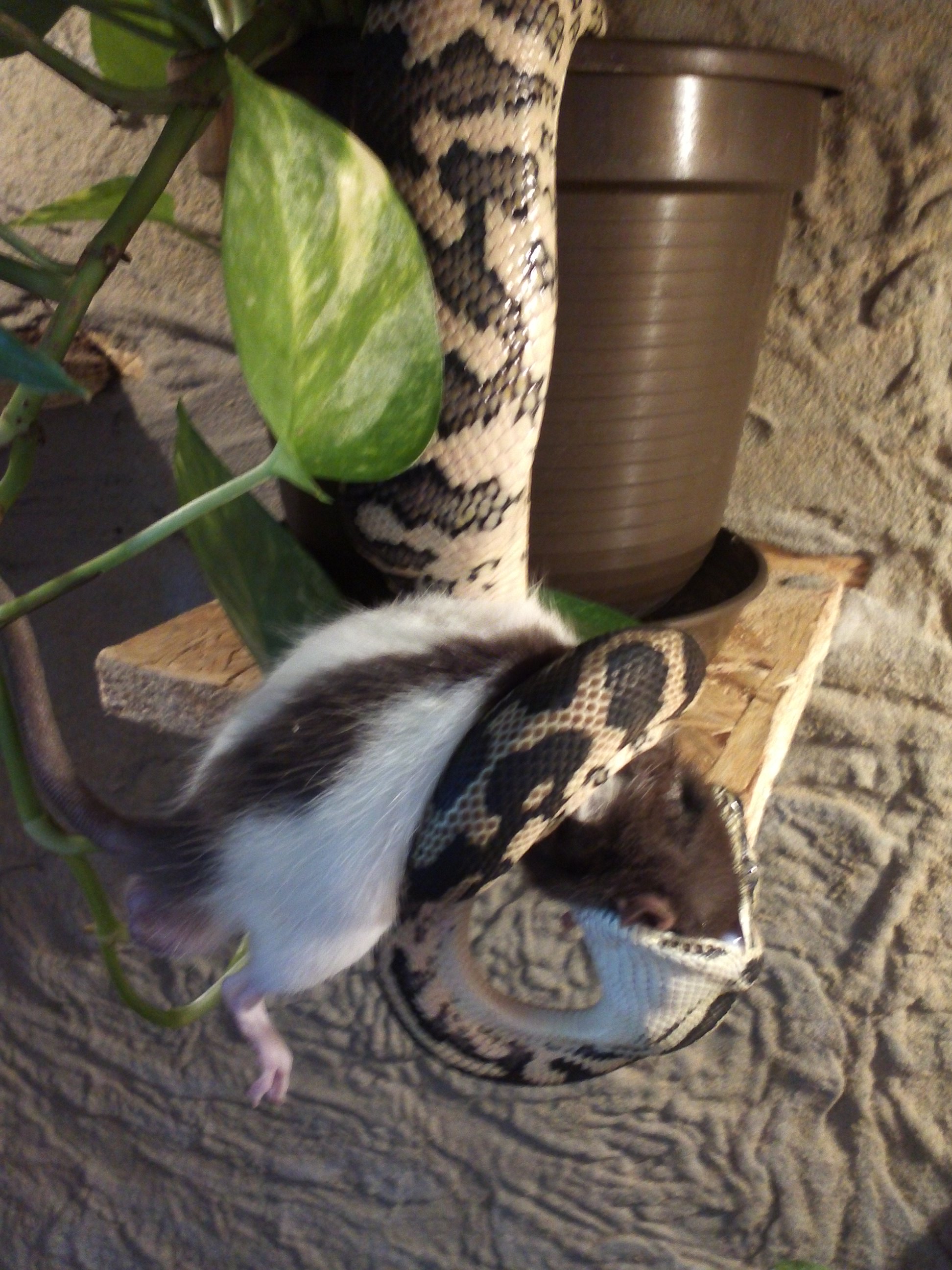 Nee,potkan byl živej.Ale jak ho krajťák chytil a utáhnul,tak potkanovi změnil "obličej" k nepoznání .A haďák se v tom pěkně vyválel.Pěkně mi tím dováděním zasvinili dvířka do terárka..