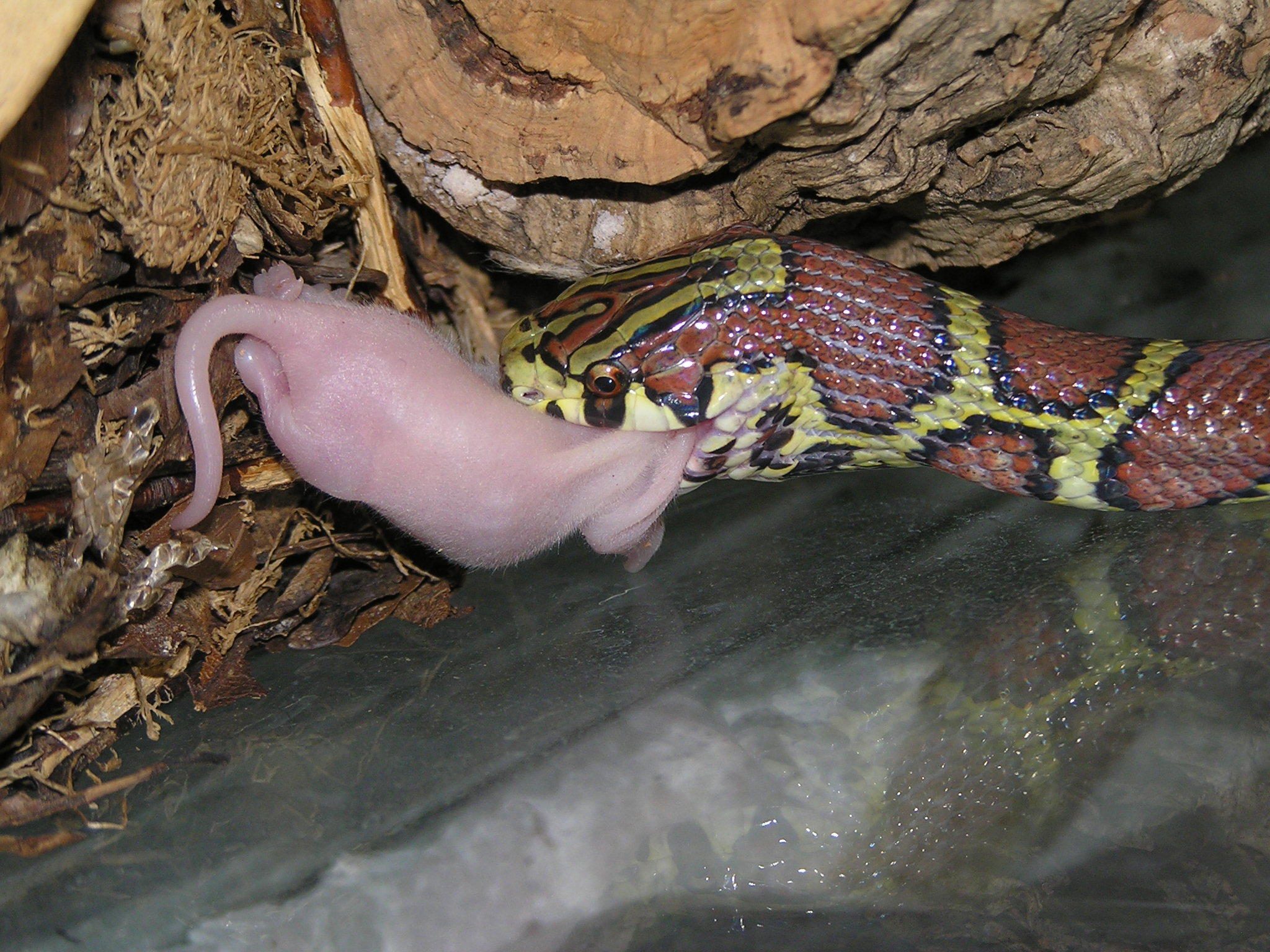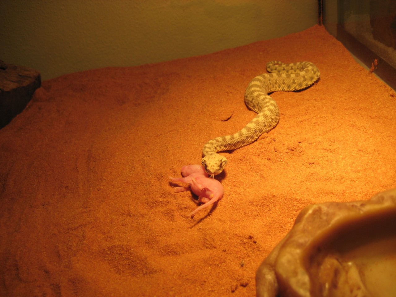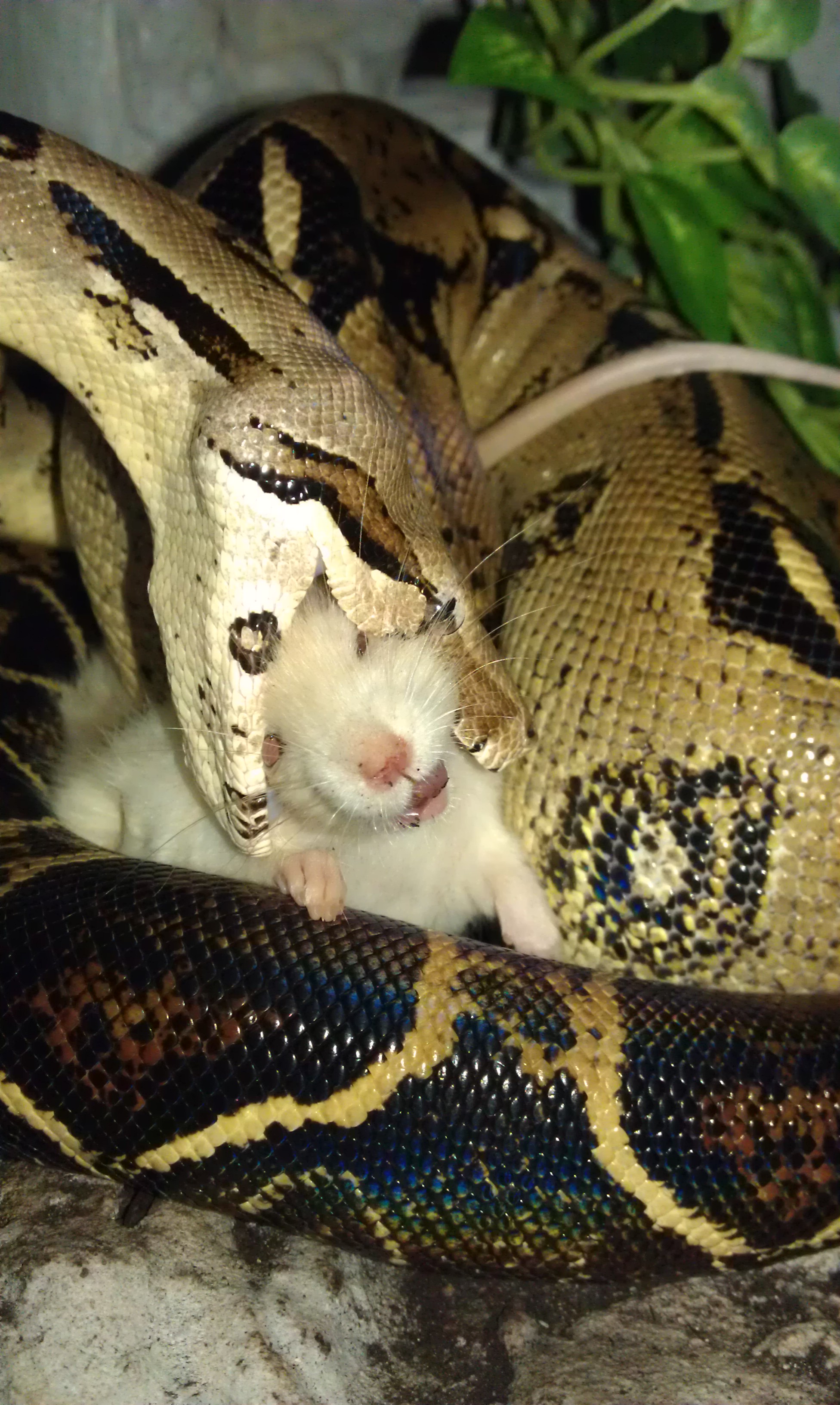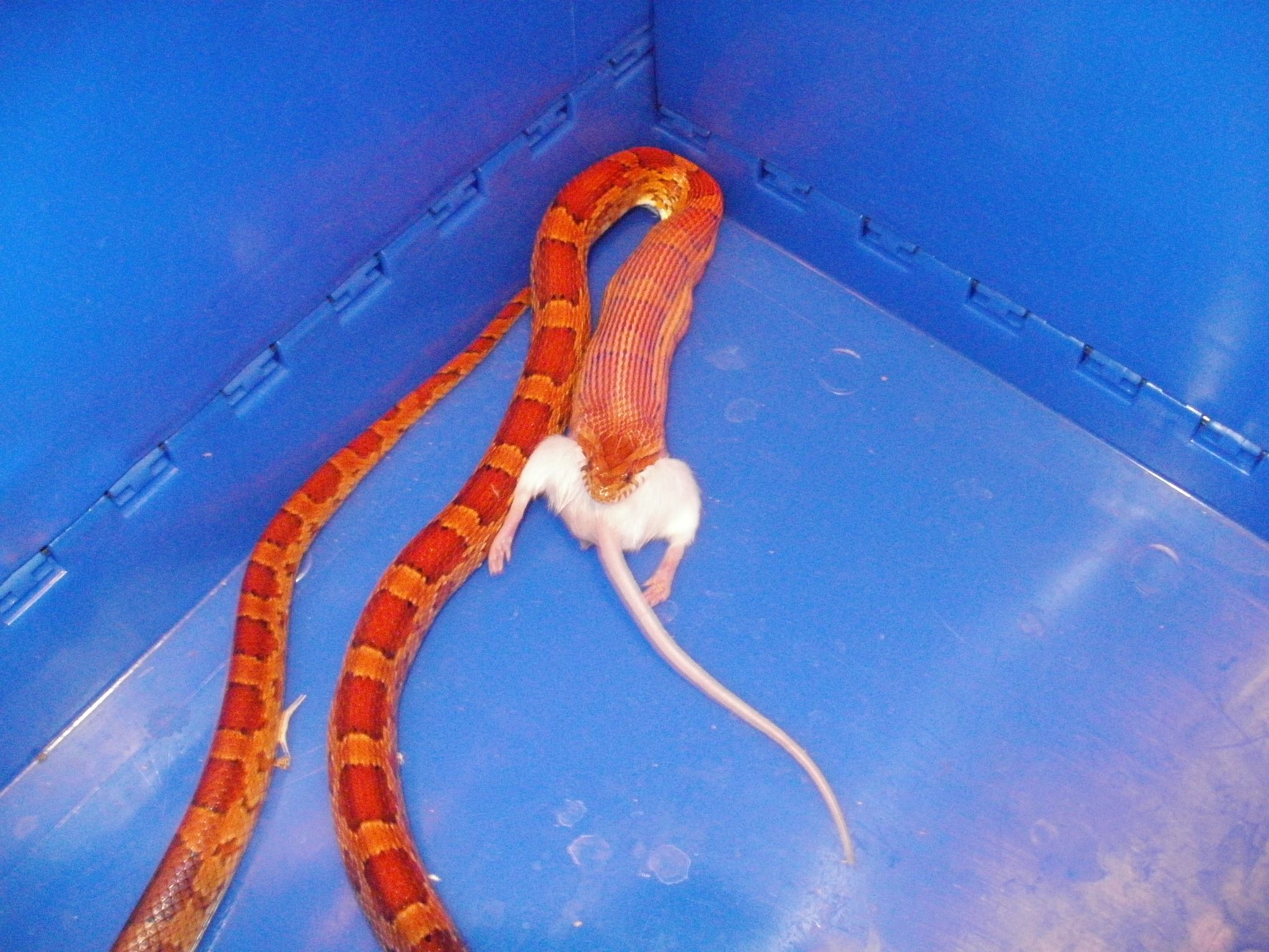 Nee,potkan byl živej.Ale jak ho krajťák chytil a utáhnul,tak potkanovi změnil "obličej" k nepoznání .A haďák se v tom pěkně vyválel.Pěkně mi tím dováděním zasvinili dvířka do terárka..