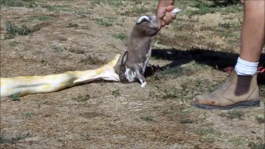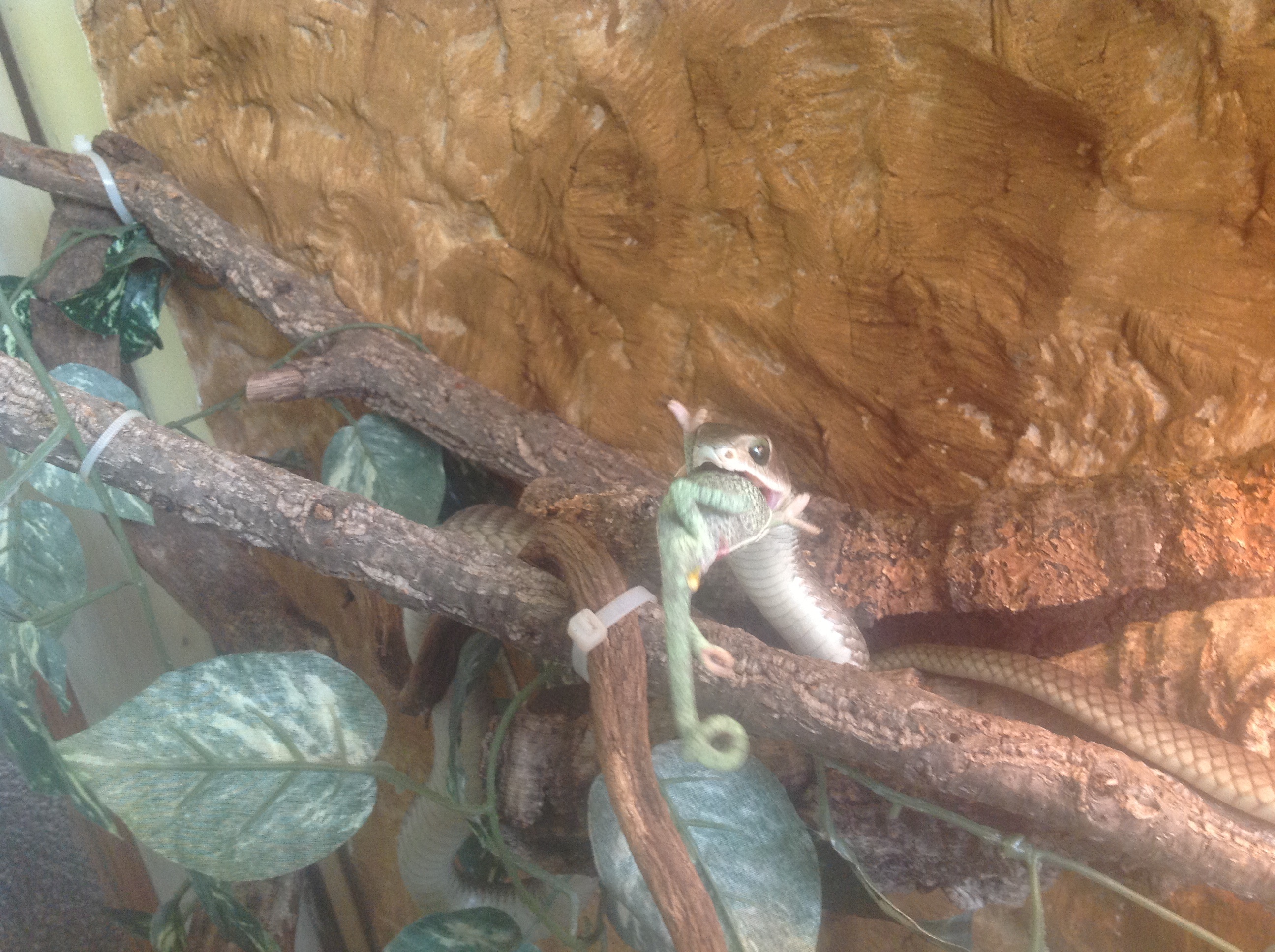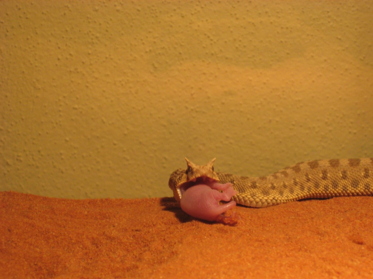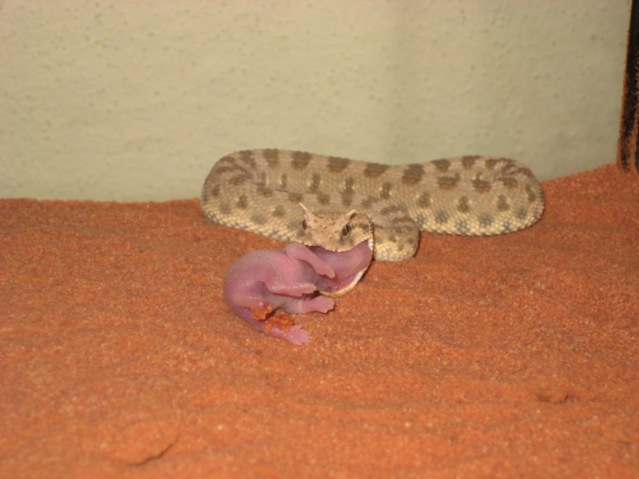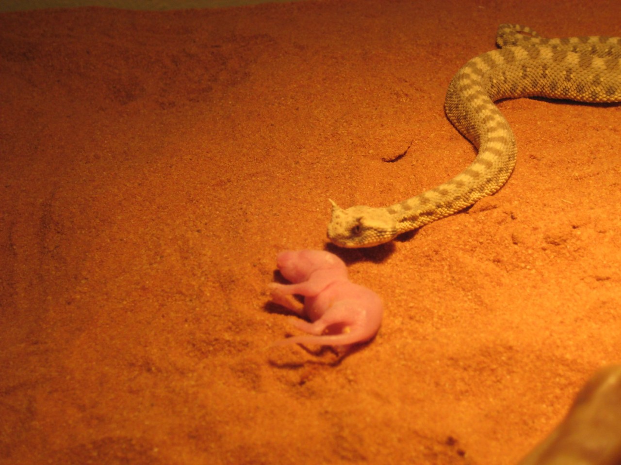 Nee,potkan byl živej.Ale jak ho krajťák chytil a utáhnul,tak potkanovi změnil "obličej" k nepoznání .A haďák se v tom pěkně vyválel.Pěkně mi tím dováděním zasvinili dvířka do terárka..