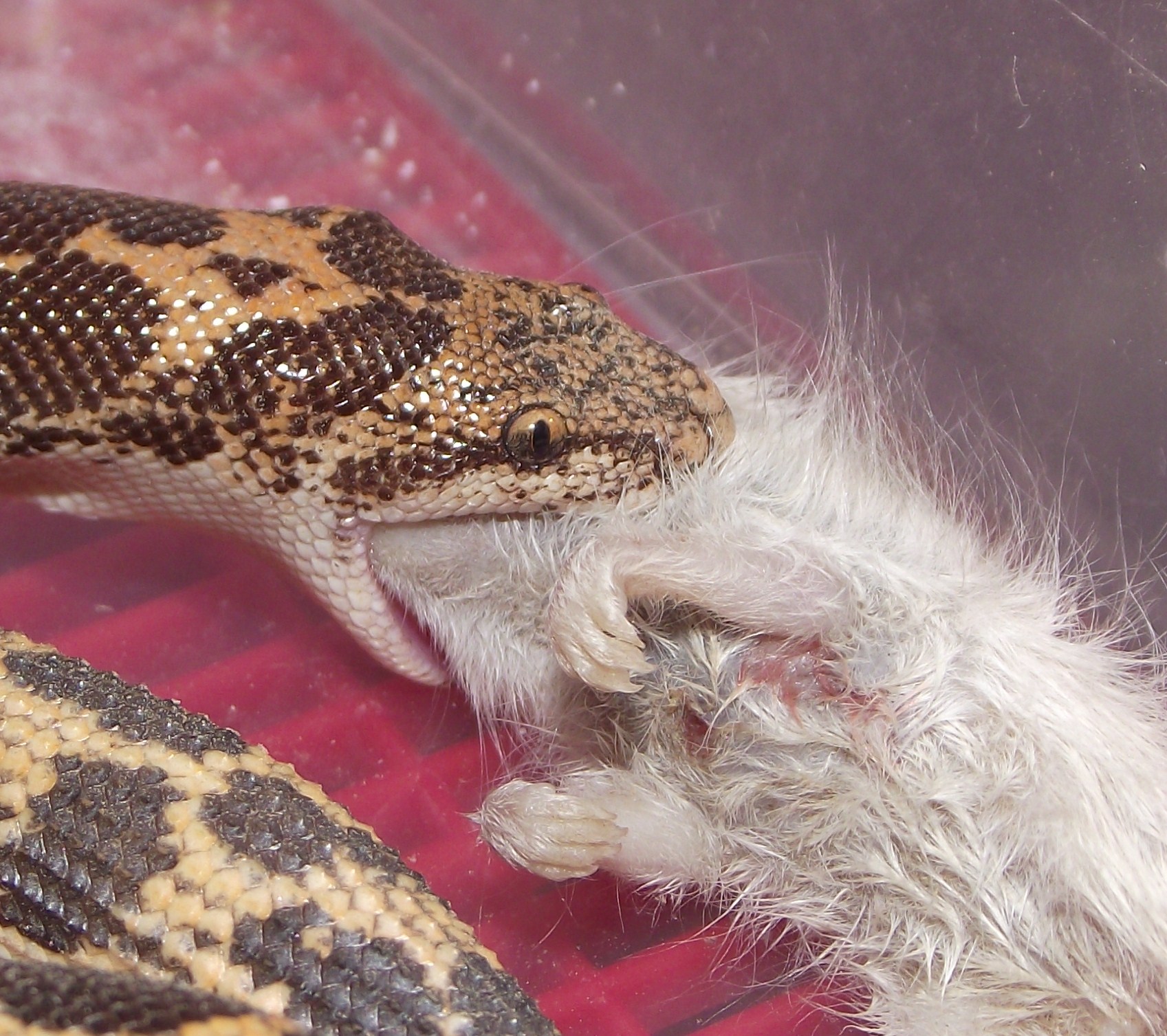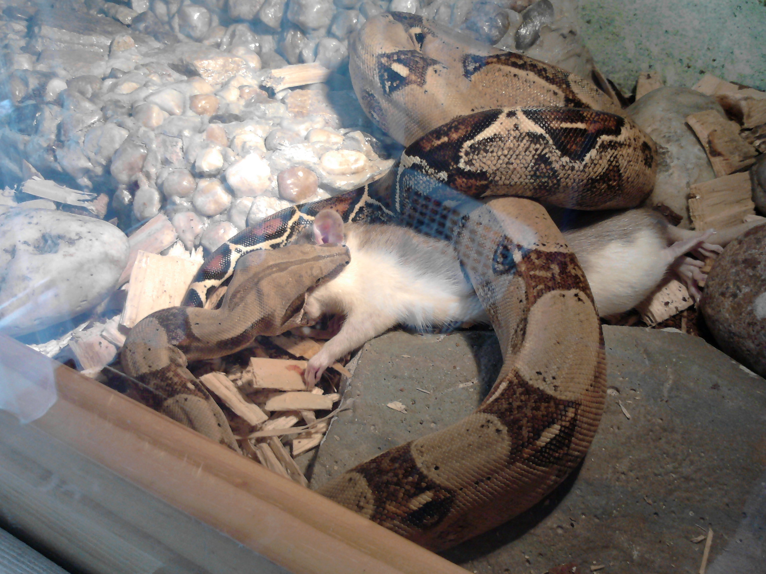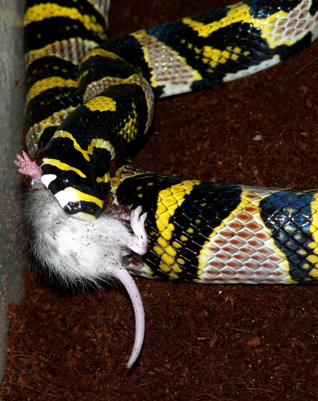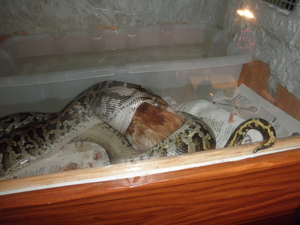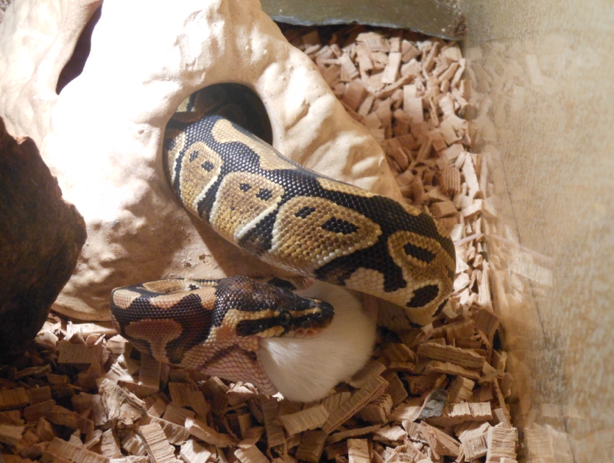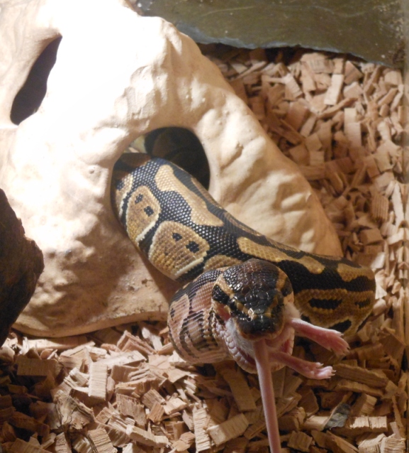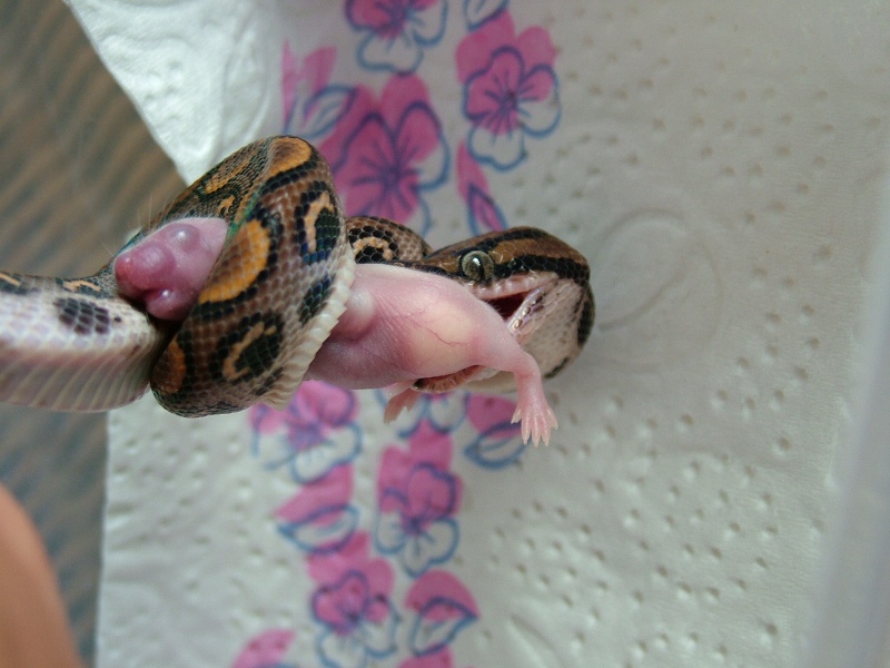 No právě ani ne tak kořist, jako naservírovaný. Žádná práce s lovem. Ale chuť byla po 10 denním půstu. Teď je čerstvě svlečený, tak se nacpává. Vyprazdňování už máme taky za sebou. S tou konzistencí a vůní jsi měla naprostou pravdu
