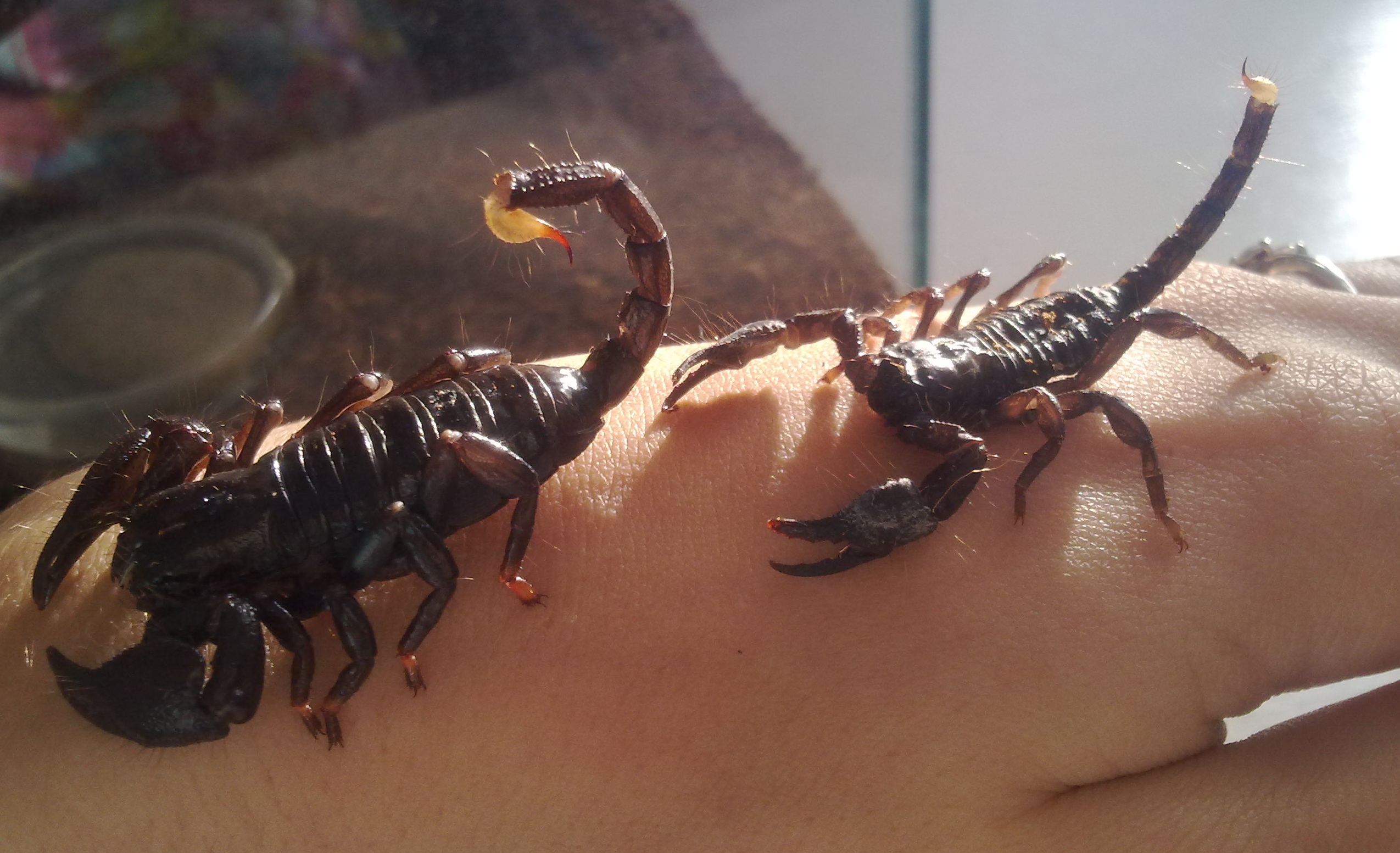 chovám skupinku 0,0,5 P.imperator, jsou letošní, tak 3 svlek, při teplotě asi 26°C a vlhkosti asi 65%. Všeci si občas něco smlsnou, moc toho nesní, ale vypadají podle mě normálně, tak jak by měli, doufám. Až teda na jednoho který mě dělá čím dál větší starosti, protože odmítá jíst a je hubenější čím dál víc, v podstatě už je tenký skoro jak papír. Nijak jsem to doposud neřešil protože jsem se všude dočetl že nijak přemluvit nejdou, a žádné násilné krmení jako třeba u hadů tu taky nebude moct probíhat, zkoušel jsem ho dát na samotku a pinzetou mu cpát cvrčka, spíš ho ním vyprovokovat až si ho nakonec vzal, zabil, chvíli držel, ale nakonec ho pustil a odešel pryč. Asi tak před třemi týdny měli taky asi tak tři týdny "karanténu", protože se mi na nich vyskytli nějací parazité, kterých se nemohli zbavit a pořád se škrábali a bylo vidět že jim vadí, ty jsme u dvou částečně odstranili jehlou (až jsem se divil jak štíři drželi a nechali se čistit), ale bylo to na dlouho. Tudíž šli na ubrousky, kde měli sucho a pouze petriho misku s kamenem a vodou, na kameni byli v podstatě pořád vylezlí a parazité tam z nich opadali do vody. A včera mi bohužel umřel štír kterému se nepovedlo svléknout a stará kůže na něm přischla, asi jsme zapomněl rosit a podcenil vlhkost