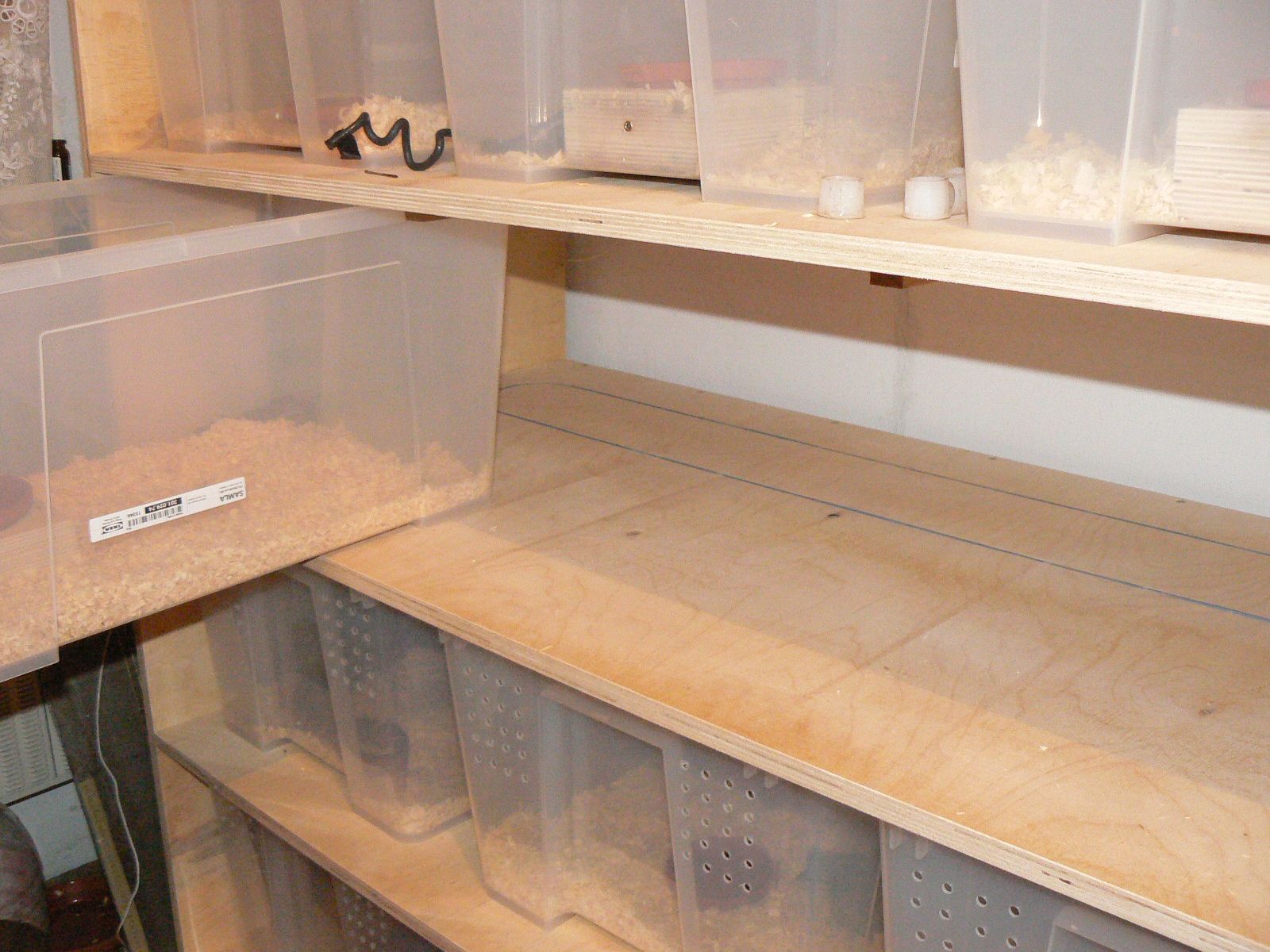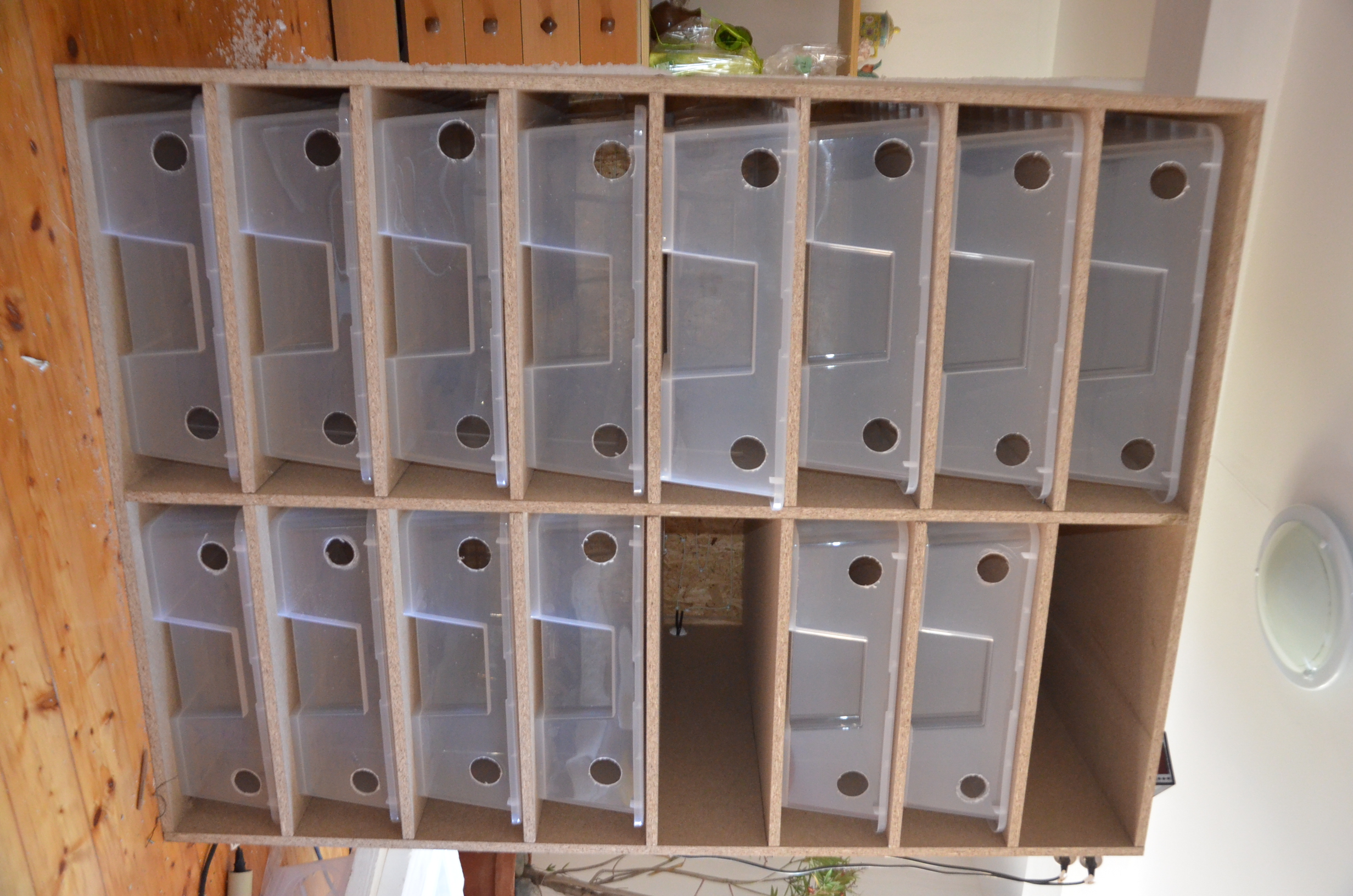 Tak jsem něco dal dohromady, ale nejede to jak bych chtěl. Konstrukce je prostě skříň z dřevotřísky, v ní plastové boxy. Boxy mají zepředu menší otvory na větrání, průměr 5cm na odchod vzduchu, a vzadu větší, pruměr 12cm na přívod teplého vzduchu. Vzadu je natažen na každé patro 5,6m 25W kabl, je i cca 30cm smyčka pod boxem pro vyhřátí. Ale 25W je málo, nevyhřeje boxy na víc jak 23C, což je teplota v mítnosti :-D Ten kábl v ruce jen lehce hřeje, v podstatě je vlažný a žádné teplo nevyzařuje, takže ho musím vyndat a dám tam topné rohože s min. 40w, možná víc, pojedou přes termostat jež má 2 čidla, na každé 4 patra jedno. Sice nebude smyčka pod boxama, ale snad jim bude stačit 28C co pujde od zadní stěny, přidělávat ty kabely bylo fakt peklo a znova se mi nechce. Doufám že tedy jen vyměním 25w kabely za silnější rohože a vše pošlape :-)