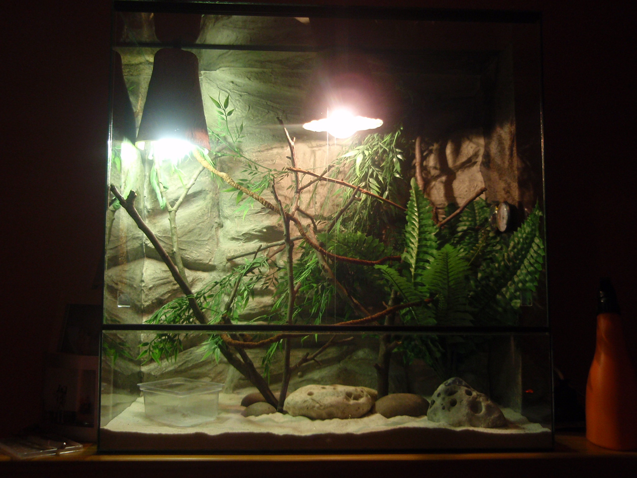 To terárko je zoufale mrňavé, když tam nacpete ty lampy. Vyhodila bych substrát, odřízla vrchní sklo, dala pletivo, lampy nad to, lepší vyvětvení a pak udělat něco většího. Třeba z osb, což bude za pár peněz.