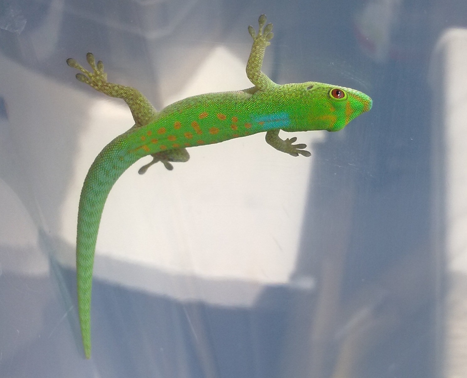 Phelsuma Madagascariensis Grandis, sameček dvou měsíční asi 13 cm.