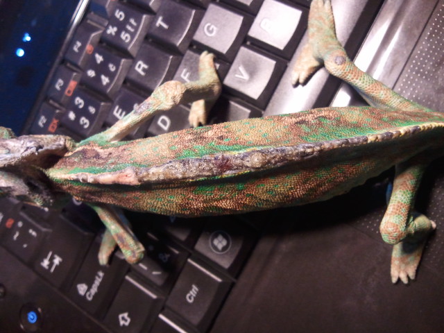 potřeboval bych radu ohledně chameleona. Na zádech mu začali odpadat ostruhy a místo nich má velké černé strupy (viz. foto), dále má fleky na těle a na nožkách. Navíc mi už delší dobu nechce žrát, jen pije. Kdyby někdo z vás věděl čím by to mohlo být prosím poraďte byl bych moc vděčný.