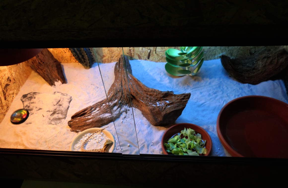 vitamíny mám teď Reptivite a cvrčky tím krmím (dávám na salát) i oblaluji.. Misku se sépiovkou má v terárku a sama si bere nebo i mě z prstu. Mističku s vodou má a dávám tam tak 5-8mm vody. Agamka spí pravidelně zadrápkovná hned pod zářivkou a než se ráno rozhýbe, tak tam vždycky tak 1.5 hod je přímo pod ní.. mám radši i tak pořídit jinou? Zelené má taky pořád ale zatím ho nejí.. Je dobře když jí svítím 11-12 hodin denně? Nikde jsem to nenašla.. Přidávám fotku terárka, úkryty má po obou stranách kořenu, takové vydlabané misky tam jsou