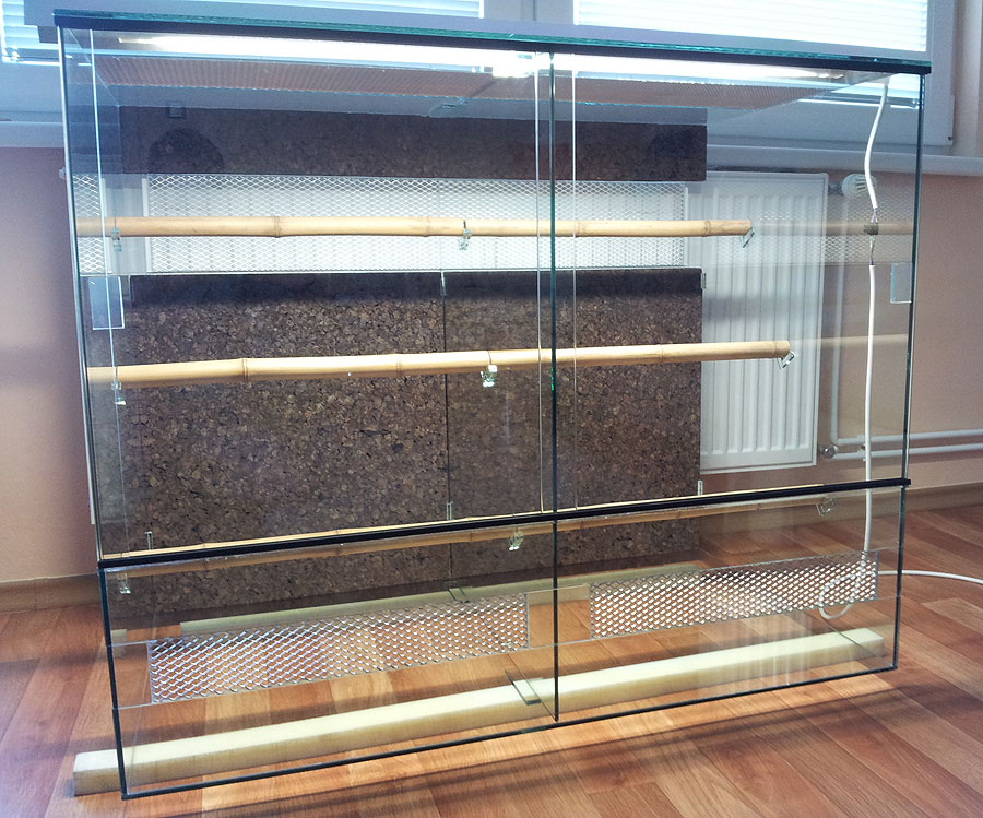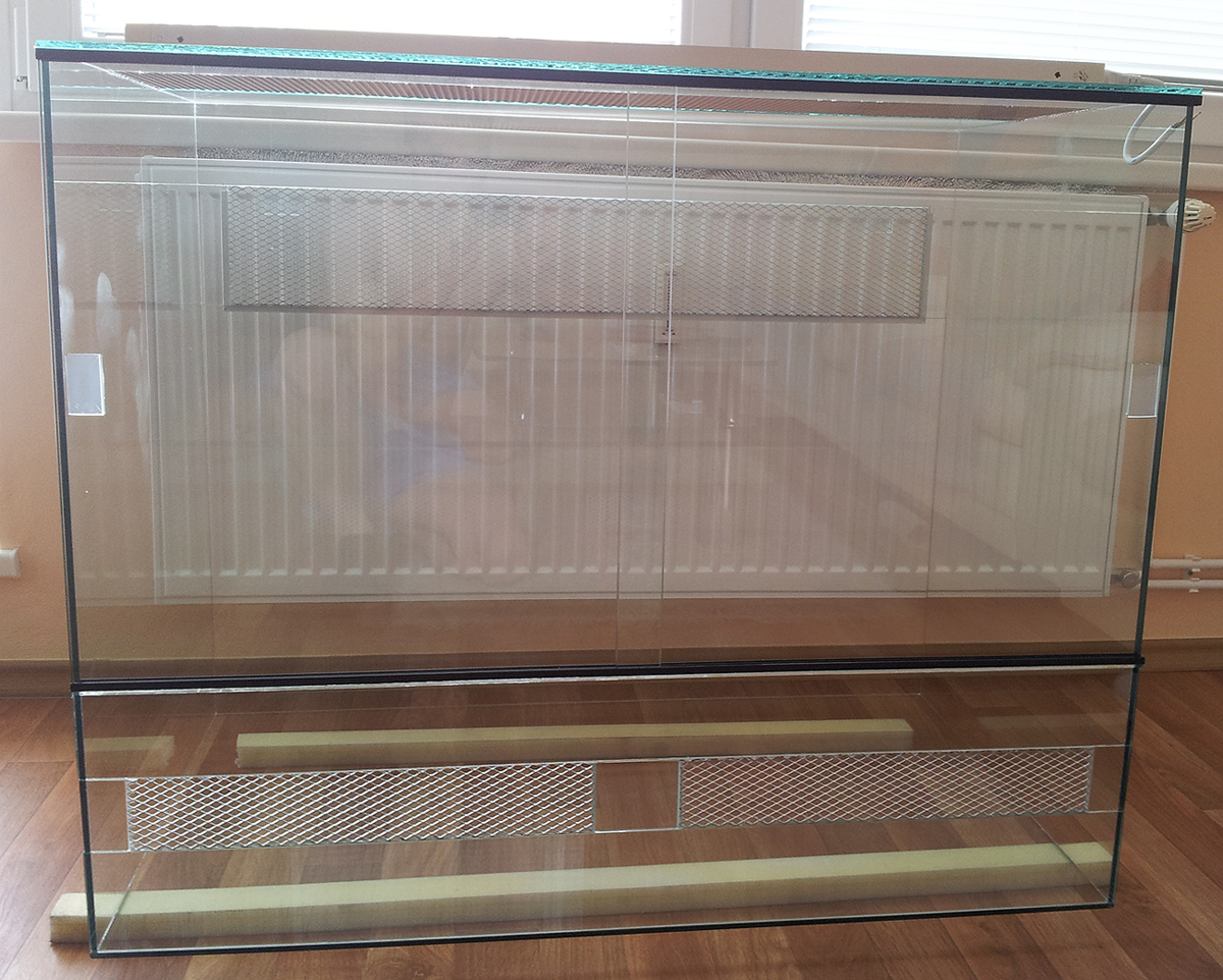 Zdravím, pro viridisky používáme podobně velký terárka jako plánuješ ty, ale jsou položený na ležato - hadi tak mají větší možnost výběru teploty bez toho, aby opustili svojí oblíbenou větev. Větrání máme v horní části zadní strany 7x90cm + vzduch proudící mezi šoupačkama. Větrání ve stropě se nám u viridisek neosvědčilo kvůli velkým ztrátám tepla a vlhkosti. Pokud se rozhodneš pro větrání pod šoupačkama, tak ho nedělej moc nízko - substrát pak vypadává ven.