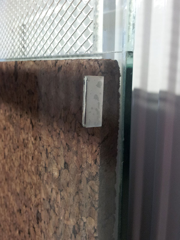 přepážka je udělaná tak, že na jedné straně jsou nahoře a dole dvě opěrné skla a na druhé je opěrné sklo na spodku terária. Takže se přepážka vsune dole mezi tři skla a opře . Pak aby to drželo jsem tam nalepil kousek plastu s oboustrannou páskou. Zbytek drží tyčky pro jistotu