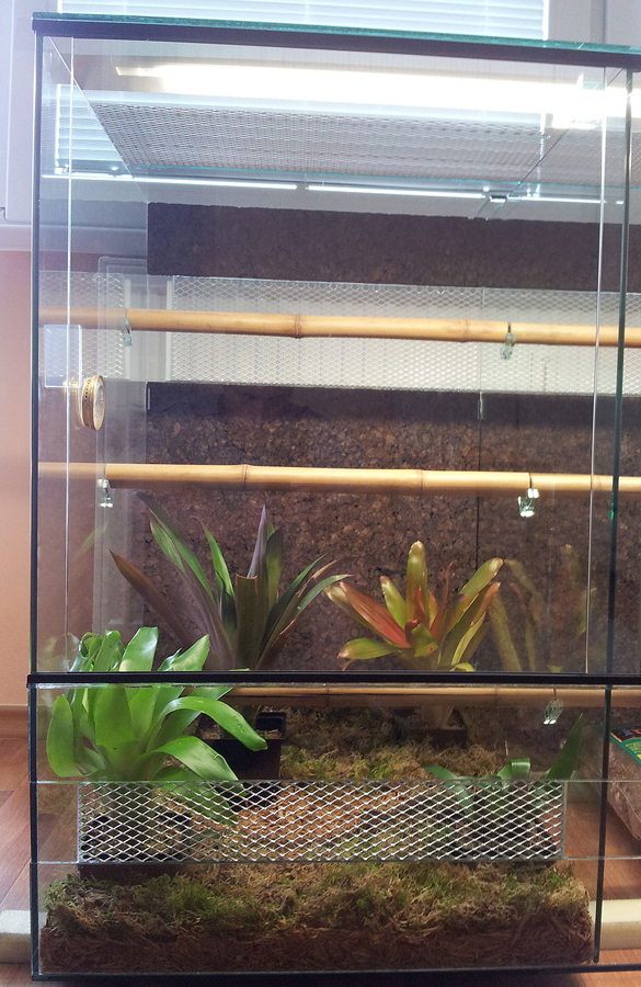 Přikládám další fotky terárka. Dodělal jsem véčka po stěnách terária na uchycení bambusových tyčí a dal jsem doprostřed vyjímatelnou přepážku. Takže terárko je pro hady dva.