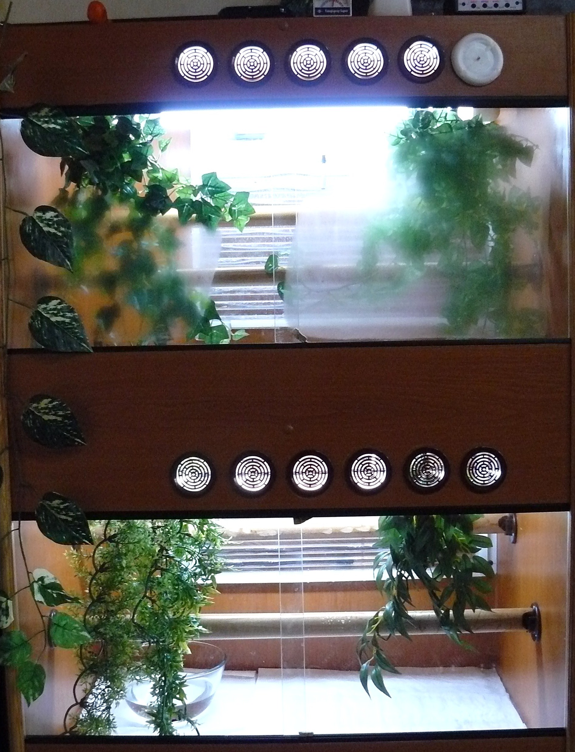 vetranie mas spravene blbo. Ak budes mat vetracky obidva hore v terarku budes tam mat prievan a za kratku chvilu bude po hadovy. Takze jedna vetracka dole, druha hore.