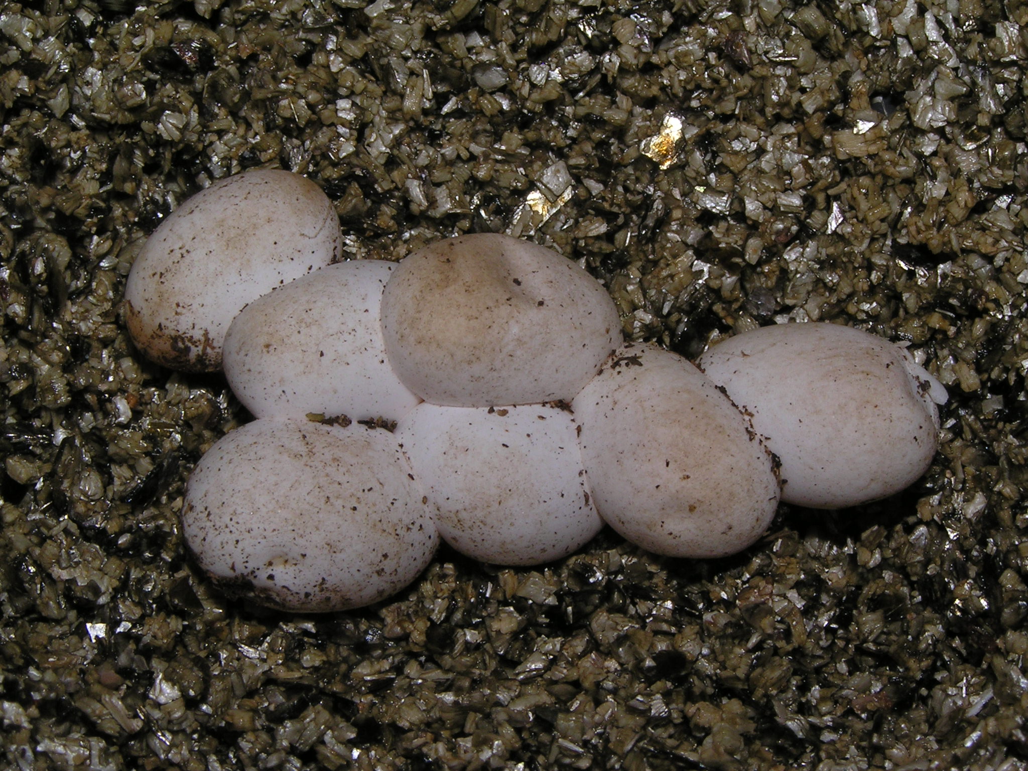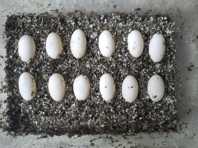 Dnešní snůška E. carinata od první samice. Vykopala si díru v rašelině pod kladištěm a vyprdla 9 oplozených vajec