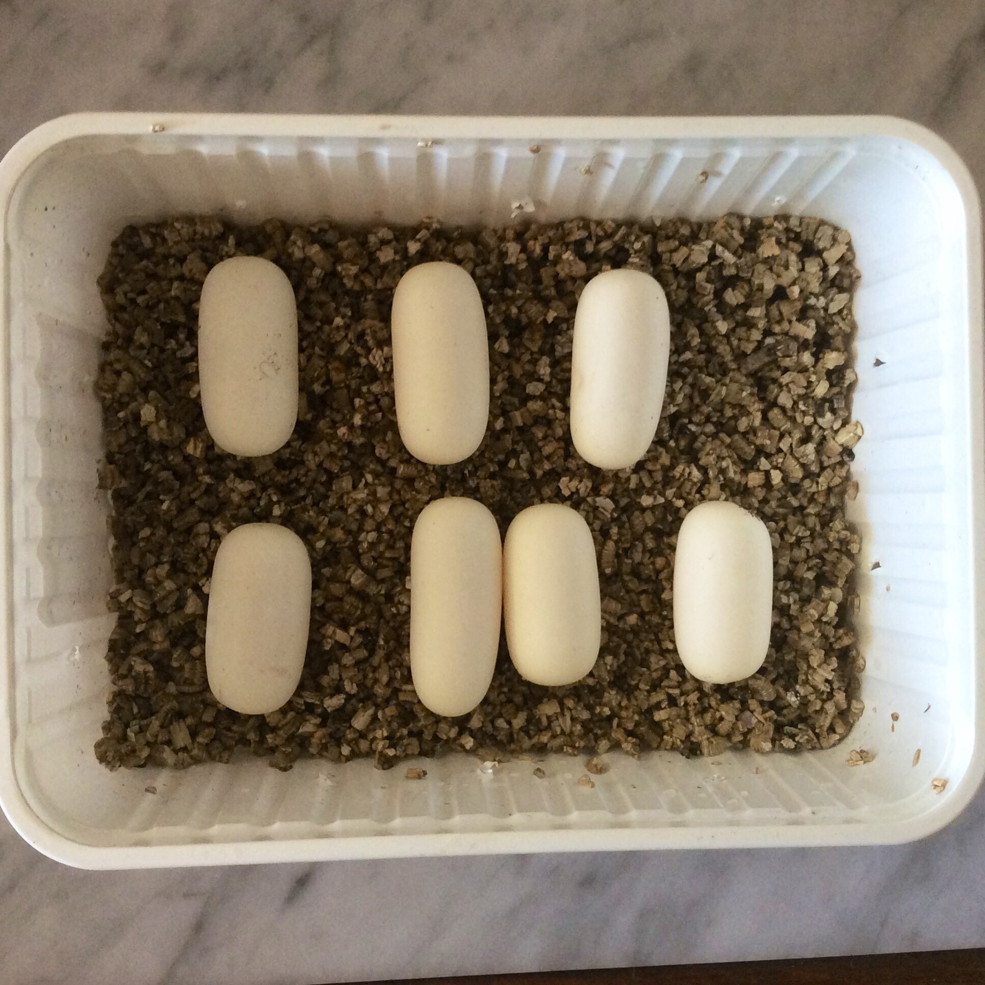 Dnešní, nejspíše neoplozená snůška 13 vajíček Lampropeltis alterna alterna. Jsou hodně měkká, co si o tom myslíte? Zatím jsem je umístil do inkubátoru.