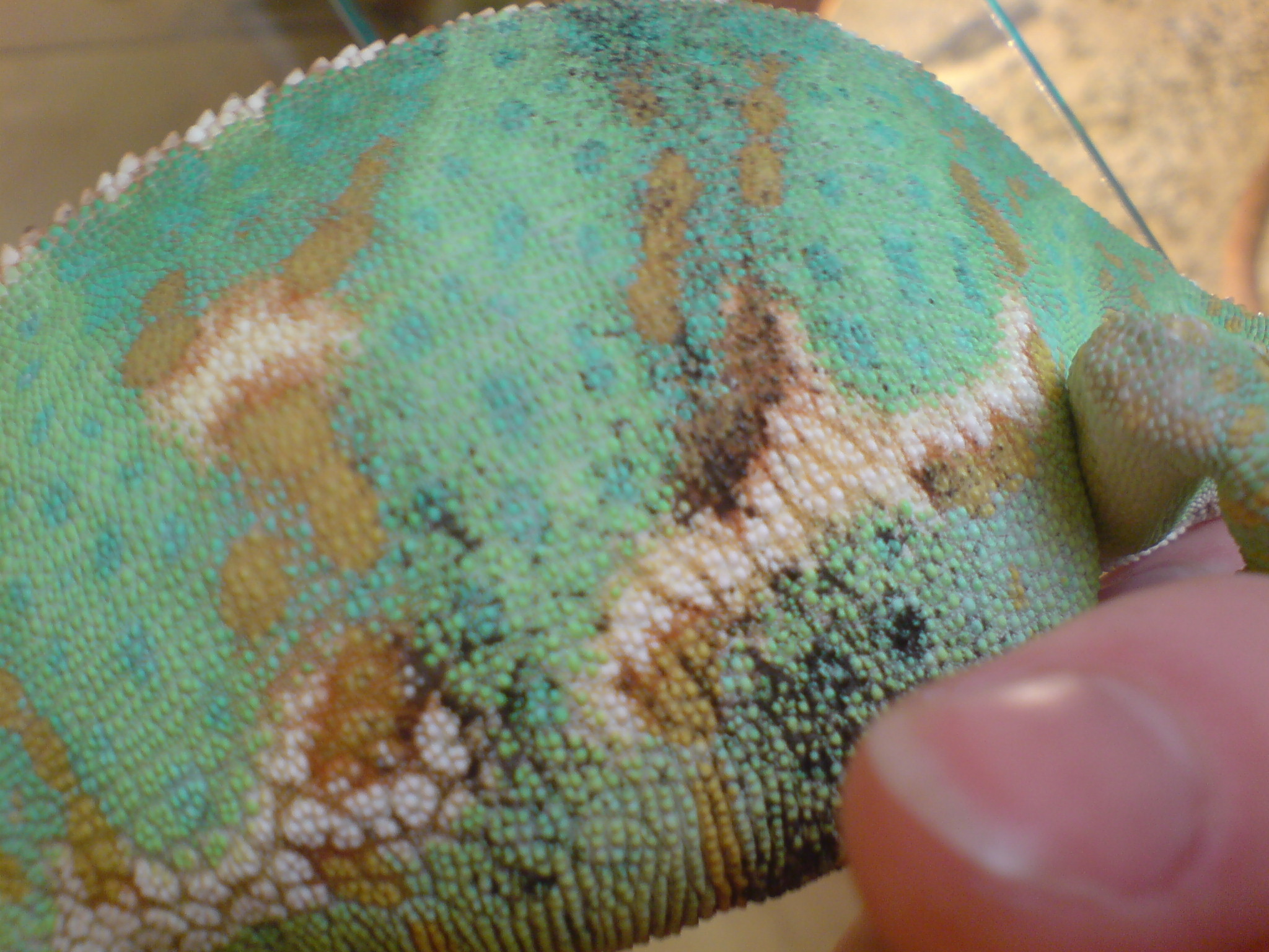No snažím se rosit 3-4X denně. Mám v terárku fontánku, takže i z ní se vody hodně vypařuje. Pod lampičkou má asi okolo 34 stupňů a jinak v terárku asi tak 28 stupňů. O těch popáleninách jsem taky přemýšlela, ale už to má strašně dlouho na to, aby to byly popáleniny. Navíc to má jenom na zadní části těla a jsou to spíš krupicovité fleky než popáleniny, které mám pocit, že jsou normálně plošné. Pokud by šlo o mykózu, co to znamená?