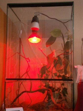 Tu otřesnou červenou žárovku okamžitě vyhoďte, je naprosto k ničemu! Našroubujte tam úplně obyčejnou bodovku z elektra, wattáž 25 nebo 40W, to pro vyhřátí postačí. Pozor na vzdálenost, aby se zvíře nemohlo popálit!