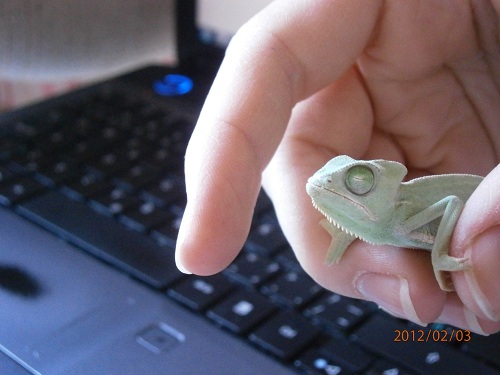 chameleona doposud než jsem ho přestěhovala ke mě měl můj přítel v bídných podmínkách - terárku měl jen topný kabel na přísun tepla jelikož mu nic jiného doma nedovolili. Cvrčky mu obaloval v CALCIUM+Vit.D3 je to drago-vit a pravidelně rosil. Ke mě ji přivezl na začátku týdne. A u mě má v terárku 28stupňů. Svítím ji Heat Glo 50W a terárko má prozatím menší než trochu nepovyroste o rozměru 30(š)x25(d)x50(v). Včera jsme pro jistotu celé terárium vymyli a vše dali nové. Když jsme jí to příjezdu dala do vlažné lázně aby nasála trochu vodny kloakou a dala na světlo tak oči otevřela ale jen na chvilku, pak hned než se dostala do terária tak je měla ihned zavřené. Teď když jsem jí dala k oknu na kytku na sluníčko otevřela oči postupně ale vždy jedno oko trochu vypoulila.