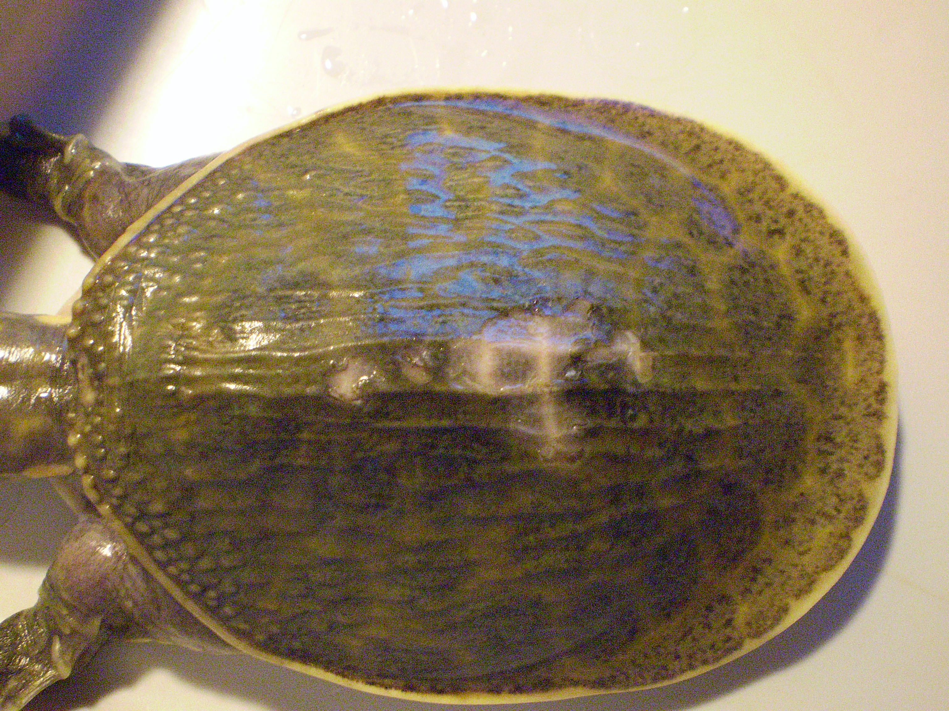 tak několik poznatků z fotek - jednak substrát je šíleně velký, hrubý a ostrý. U kožnatek se používá písek a ne tohle. Za druhé výška substrátu do něhož se kožnatka zahrabává musí být minimálně o trojnásobku výšky krunýře, jinak se kožnatka cpe co nejhlouběji a hrozí poškození plastronu o ostrá zrnka písku. Za třetí - pokud je ta kožnatka skutečně u Vás třetím rokem, tak je šíleně podražená. Apalone ferox roste jako blesk, už si nepamatuji kolik měřily moje ve třech letech, ale rozhodně už neměly zjev mláděte. Kolik měří? Jakou má teplotu vody, kolik je pod zdrojem na kameni(nikde tam nevidím spuštěnou žárovku níže, jen její odraz od hladiny), čím krmíte? Jinak bych se nedivil, kdyby ta kůže stržená na karapaxu je skutečně vlivem mechanického poškození, jak se snaží nacpat třeba pod ten kámen, nebo něj a filtr. Místy tam máte sice jemnější písek, ale ten sám má zrnitost mezi 1-1,5mm (používám ho u gekončíků), zbytek jsou vážně příliš hrubé kousky s ostrými okraji. V tomhle prostředí to bude otázka času, než tam kožnatka něco chytí do krunýře.