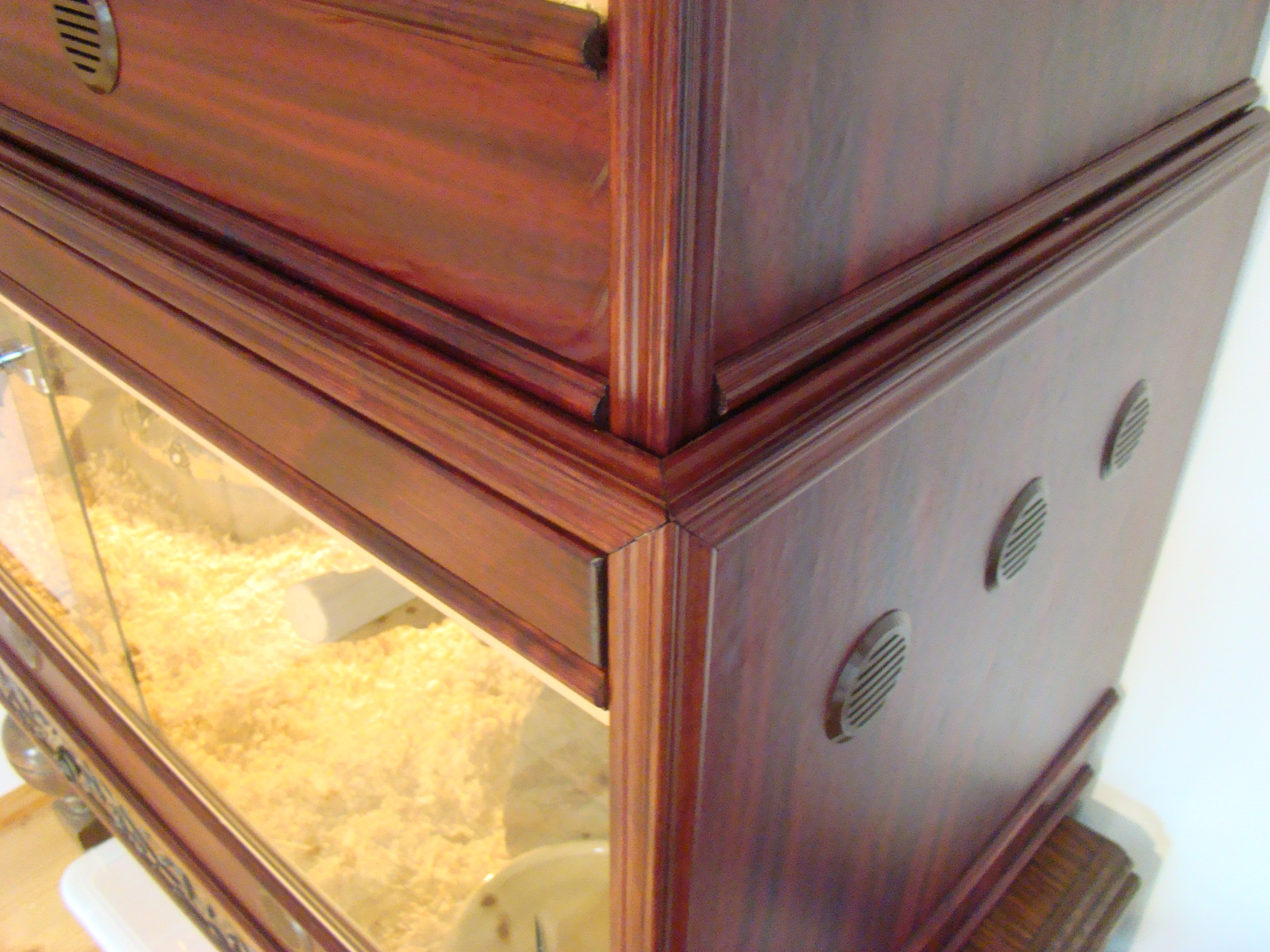 Tak mořidlo je pouze rozpuštěný pigment, takže by potom nebylo docíleno žádné povrchové úpravy ani ochrany a impregnace dřeva. Muselo by se stejně přelakovat (i když jak koukám, tak je terárko nalakované jen z venku). Kromě toho bych si u mořidla nebyl jistý zdravotní nezávadností. To lazura na rozdíl od mořidla všechno splňuje (jak která). Děkuji za fotku.